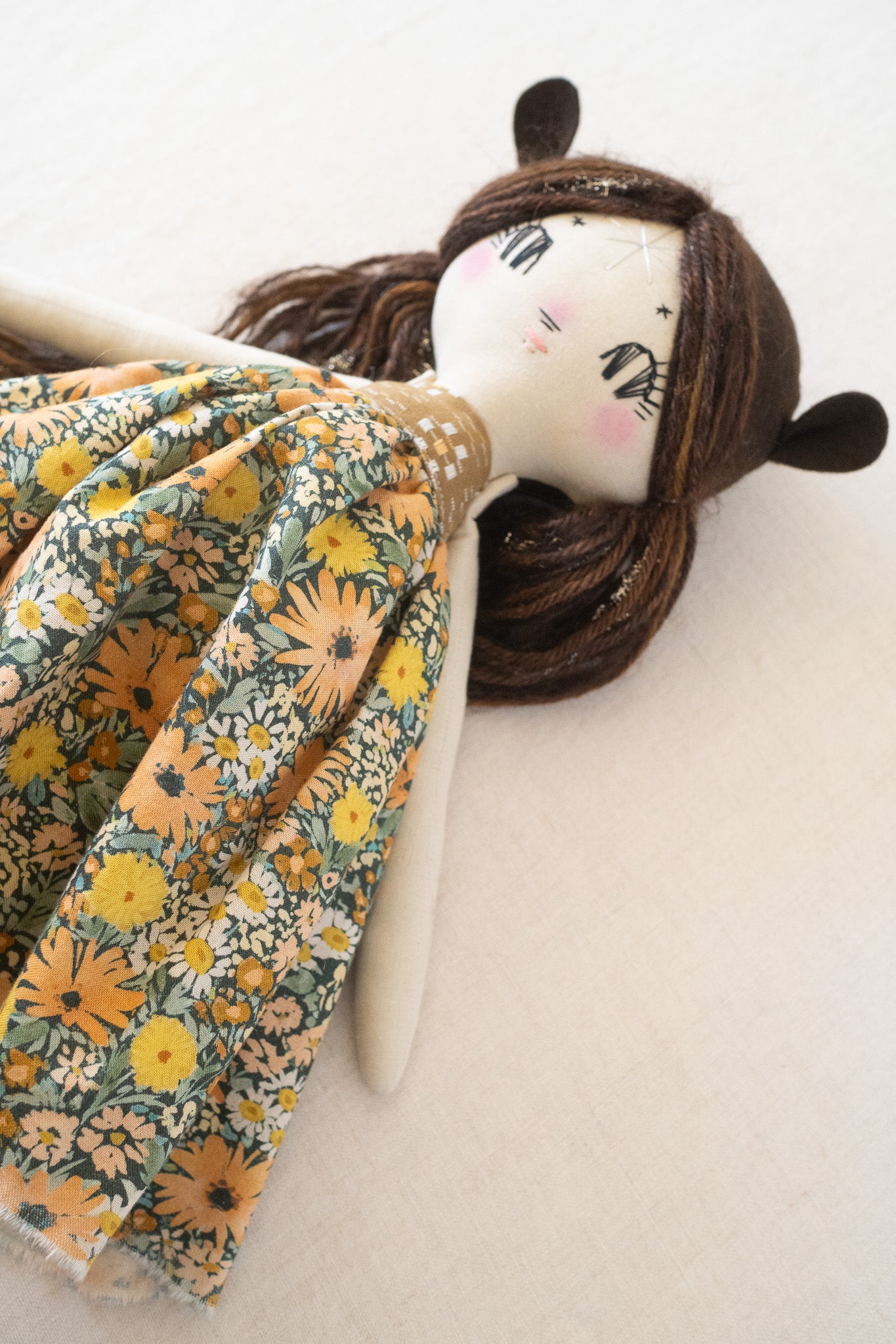 This unique doll is made up of cotton, wool/rayon felt, and stuffed with recycled pollyfill. The yarn hair is a combination of wool, mohair, and acrylic yarn. All of our dolls have button-jointed arms. Each doll is lovingly hand stitched in Asheville, North Carolina.