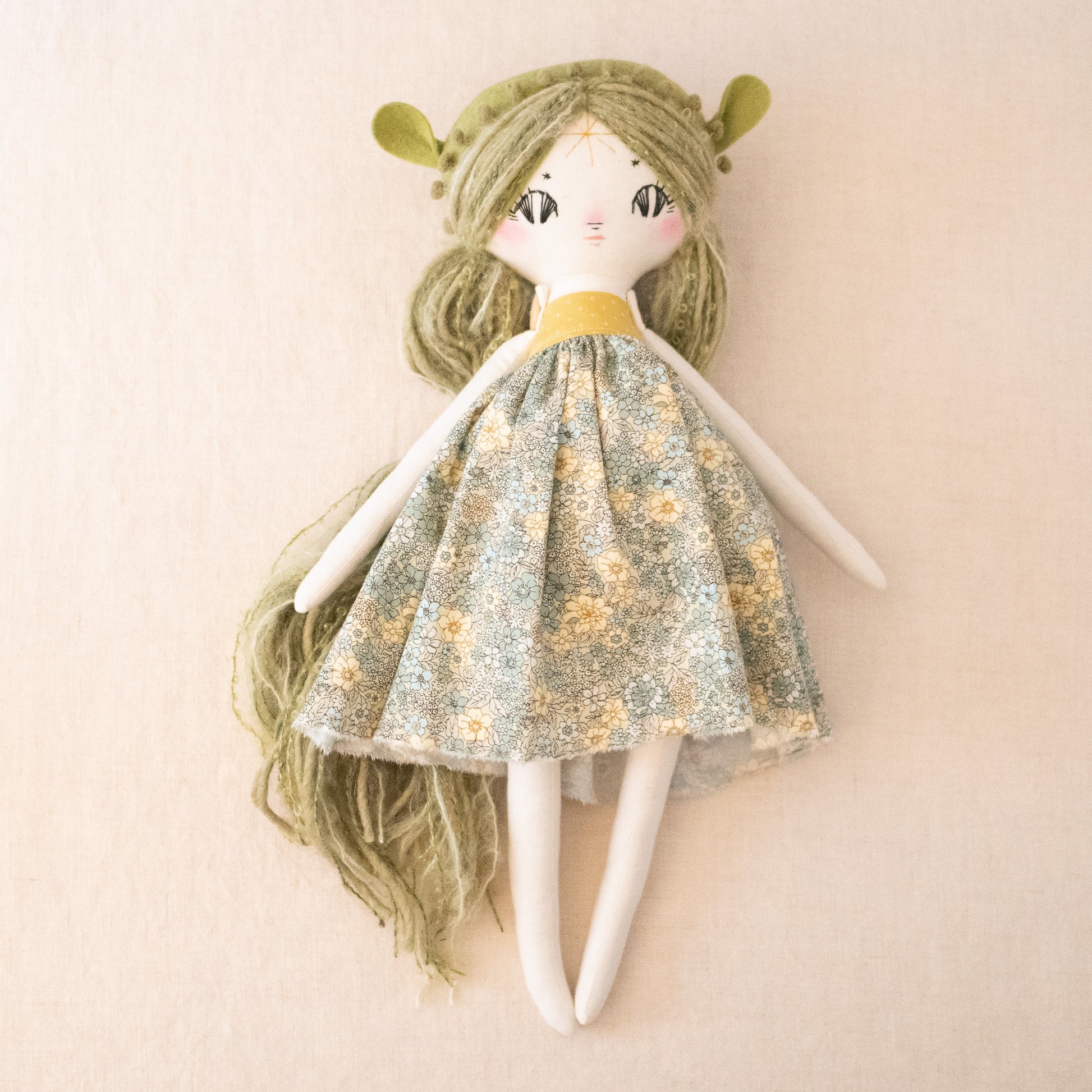 This unique doll is made up of cotton, wool/rayon felt, and stuffed with recycled pollyfill. The yarn hair is a combination of wool, mohair, and acrylic yarn. All of our dolls have button-jointed arms. Each doll is lovingly hand stitched in Asheville, North Carolina.