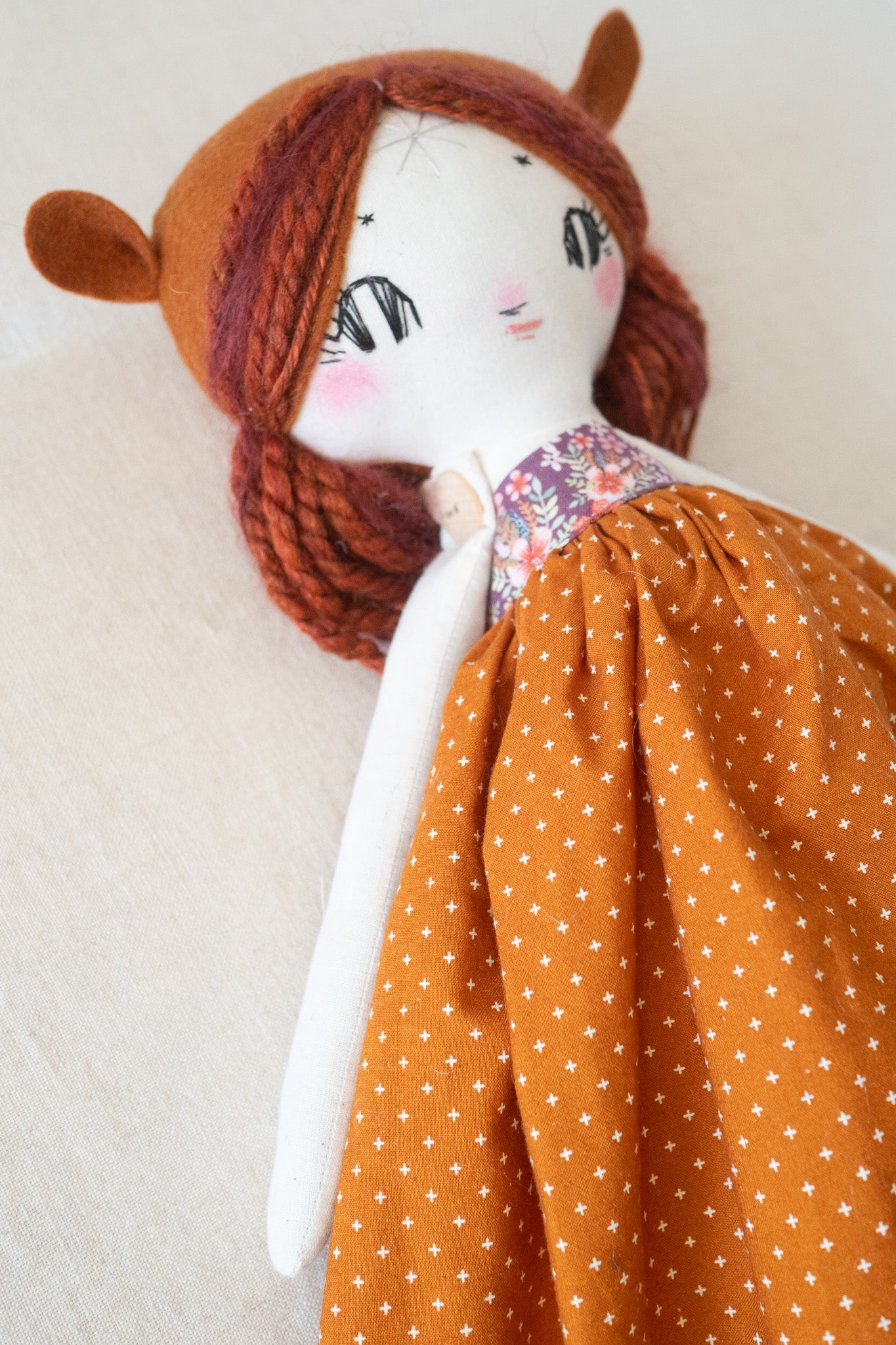 This unique doll is made up of cotton, wool/rayon felt, and stuffed with recycled pollyfill. The yarn hair is a combination of wool, mohair, and acrylic yarn. All of our dolls have button-jointed arms. Each doll is lovingly hand stitched in Asheville, North Carolina.