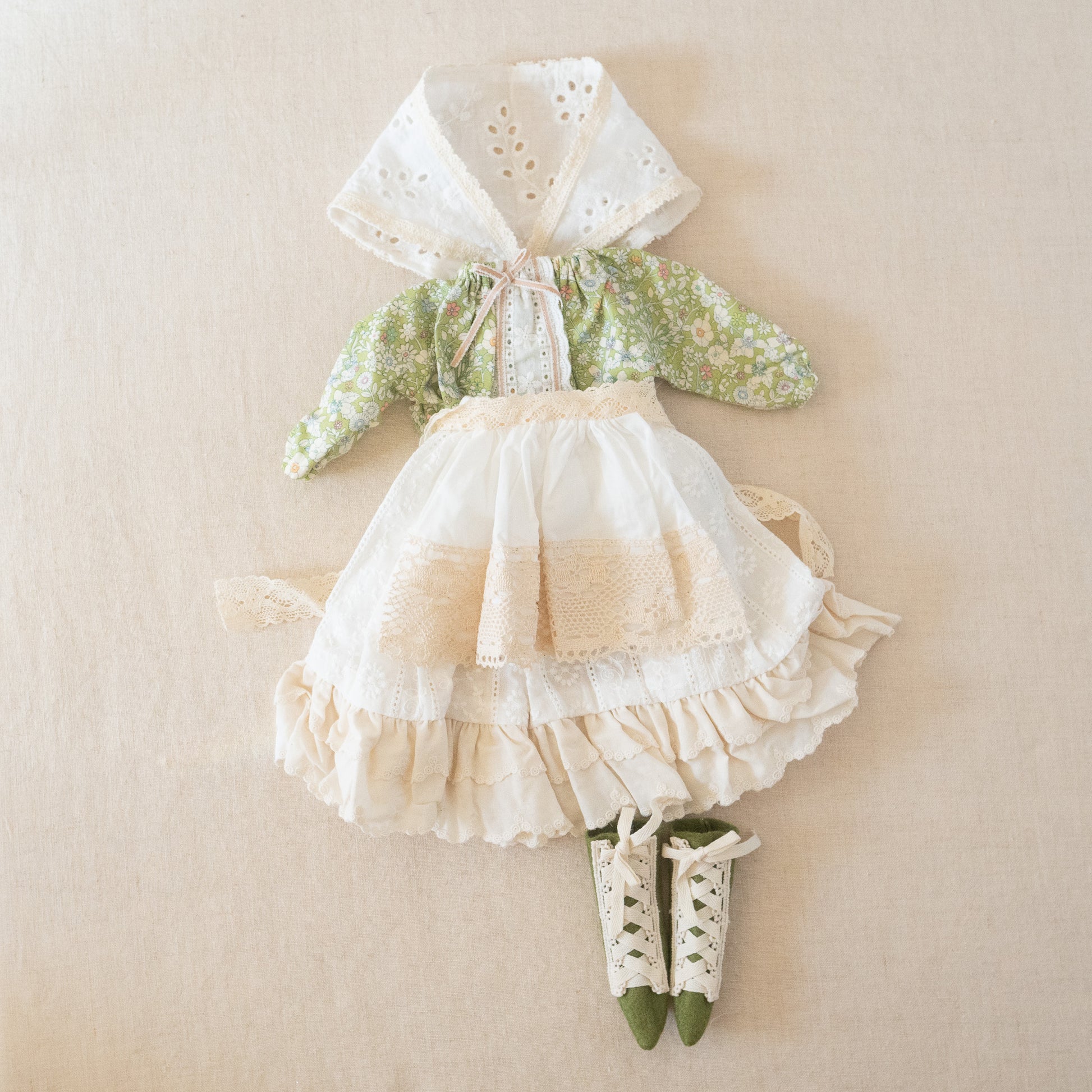 A lovely little outfit for our largest 20" dolls with a detailed blouse, ruffle trimmed skirt, lace trimmed apron, head scarf and lace up boots.