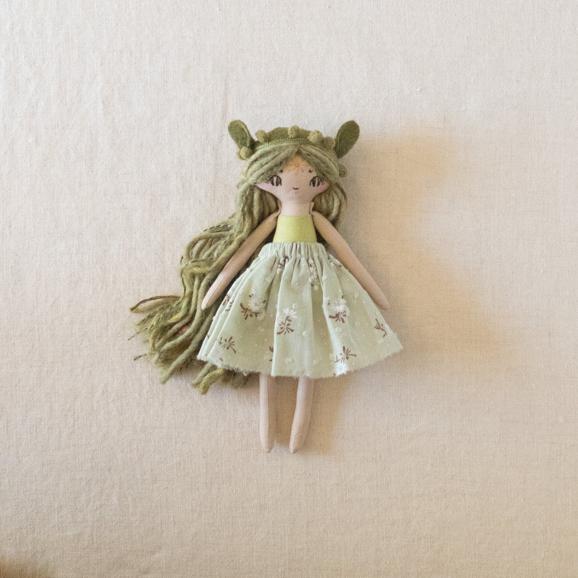 This unique doll is made up of cotton, wool/rayon felt, and stuffed with recycled pollyfill. The yarn hair is a combination of wool, mohair, and acrylic yarn. Each doll is lovingly hand stitched in Asheville, North Carolina.