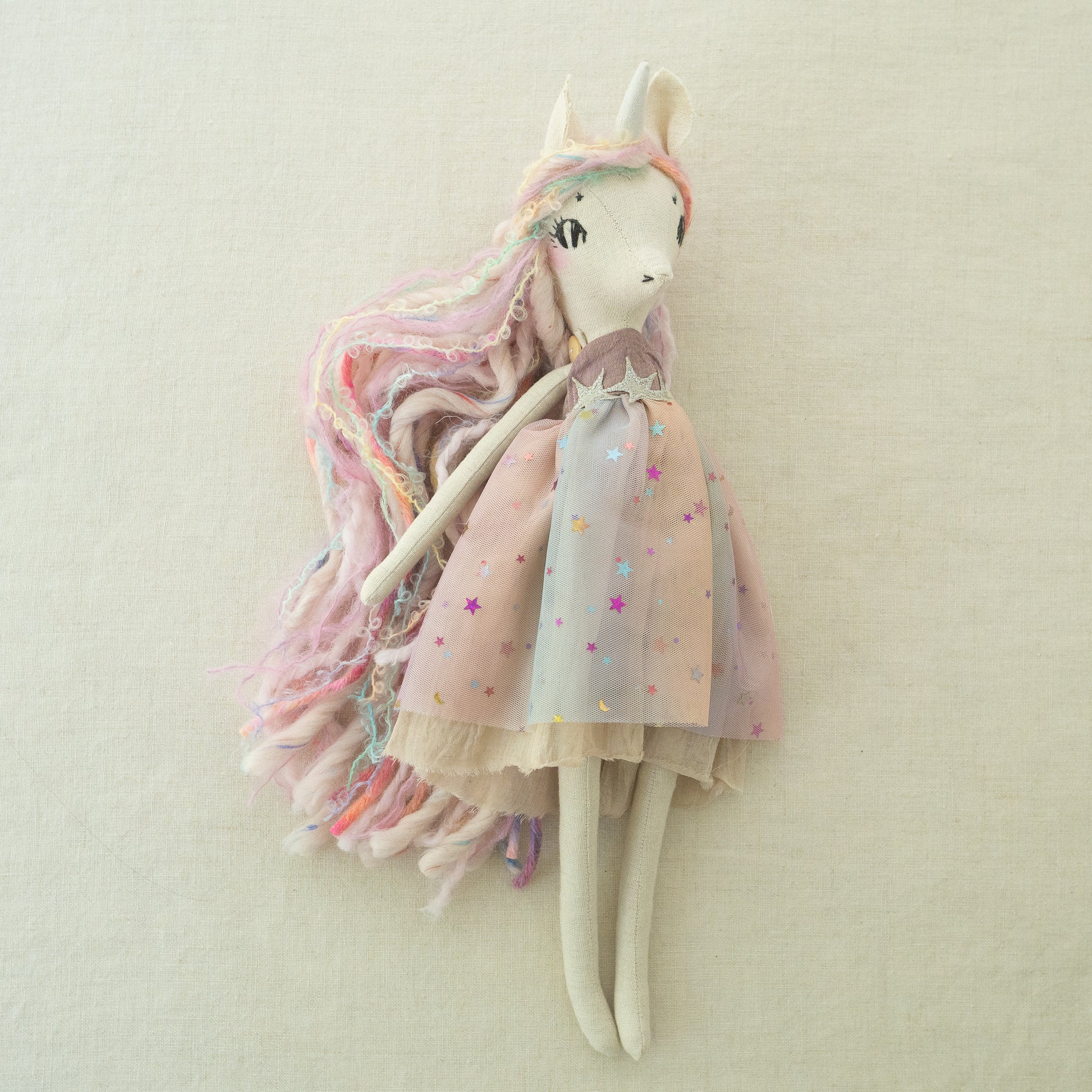 The Unicorn is made up of cotton, wool/rayon felt, and stuffed with recycled pollyfill. The yarn hair is a combination of wool, mohair, and acrylic yarn. All our dolls have button jointed arms. Each doll is lovingly hand stitched in Asheville, North Carolina.