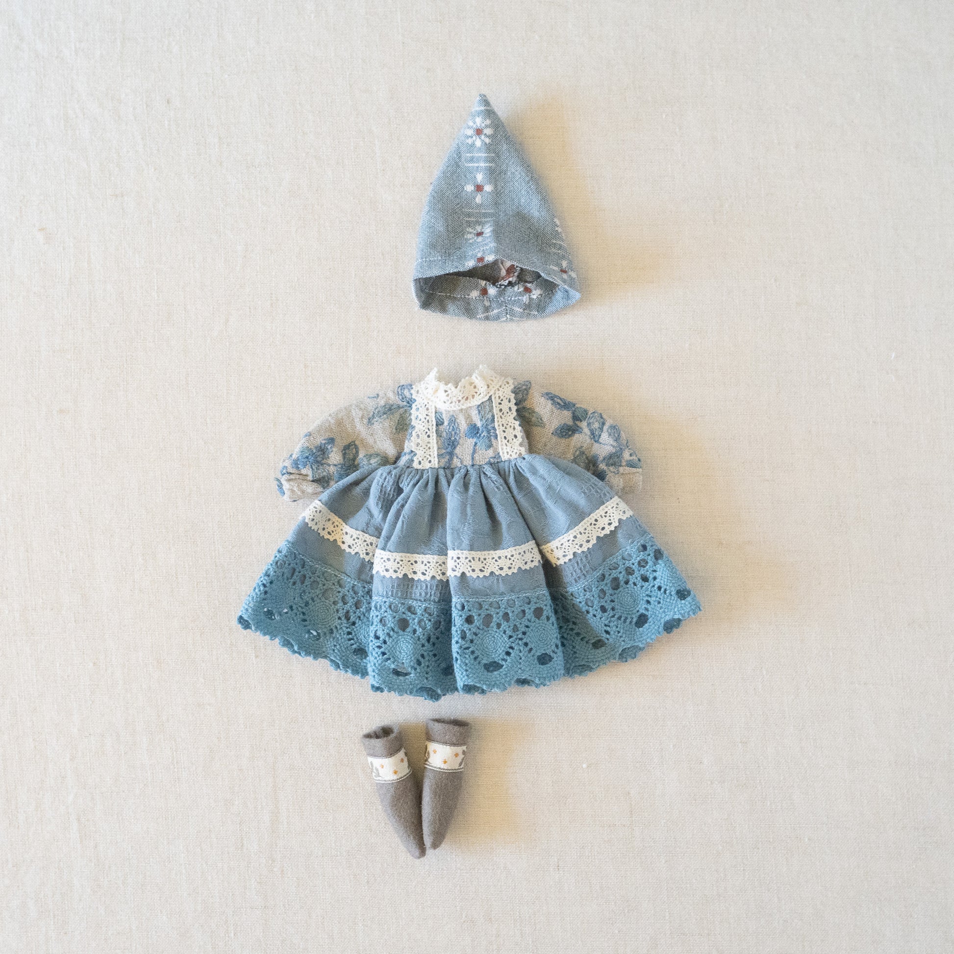 A whimsical outfit set that includes - a detailed dress, ribbon trimmed boots, and cotton hat.
