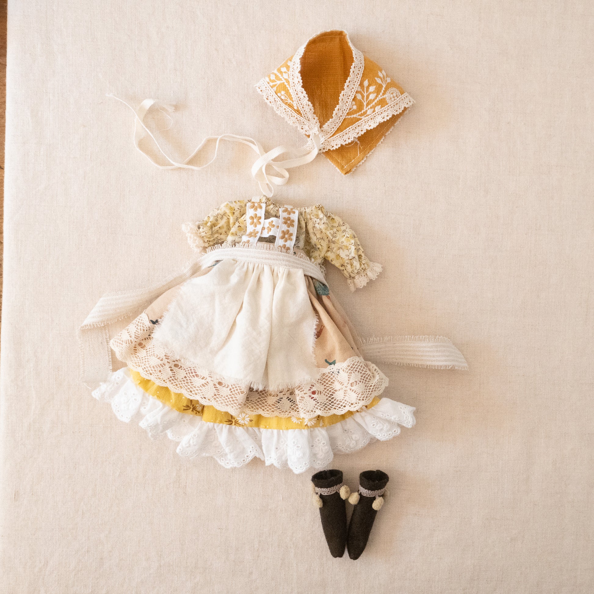 This set includes - a folktale kerchief, puff-sleeved blouse, detailed pinafore skirt, apron, petticoat, and felt boots