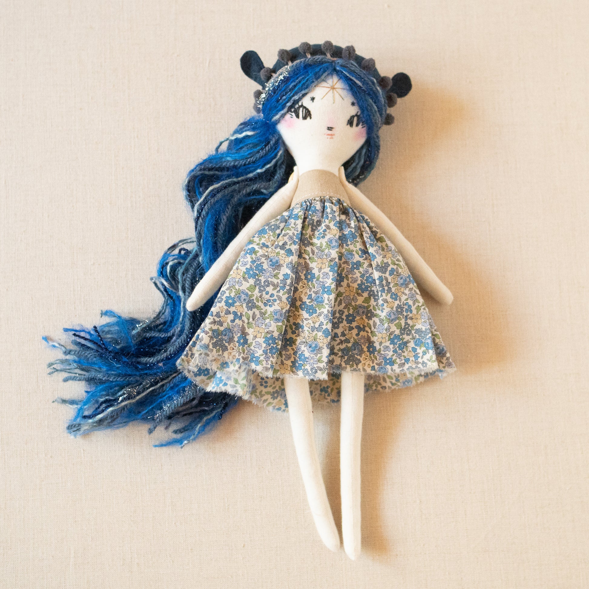 The Pixie Doll is made up of cotton, wool/rayon felt, and stuffed with recycled pollyfill. The yarn hair is a combination of wool, mohair, and acrylic yarn. All our dolls have button-jointed arms. Each doll is lovingly hand-stitched in Asheville, North Carolina.