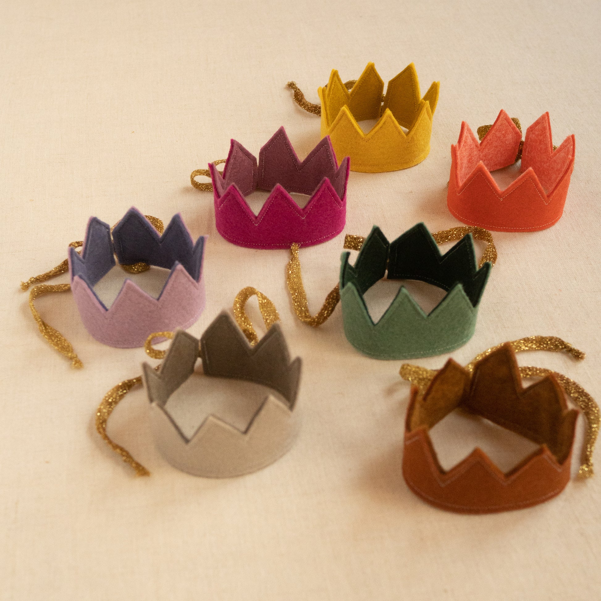 Each crown is sewn from wool felt. They fit perfectly on all pixies and forest friends.