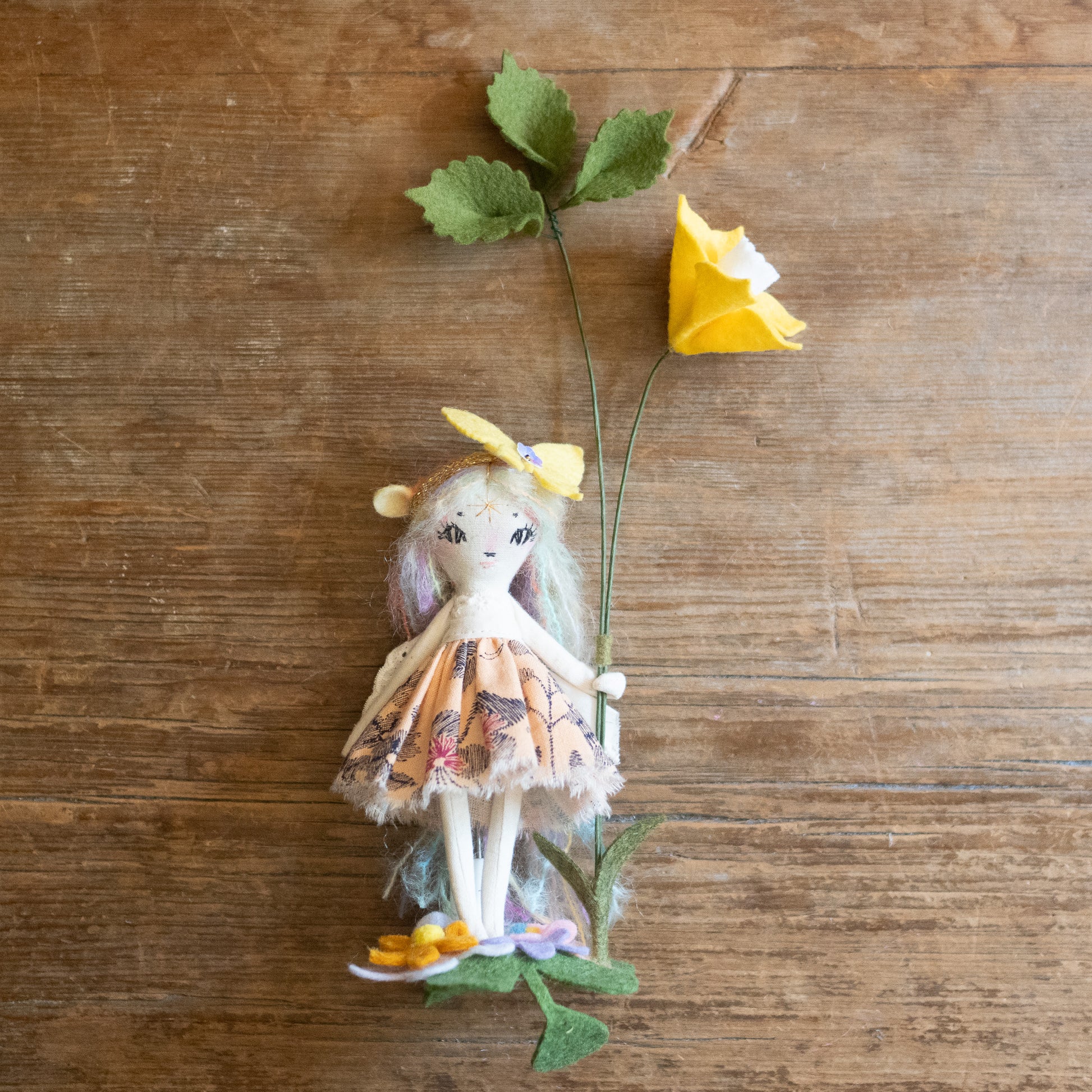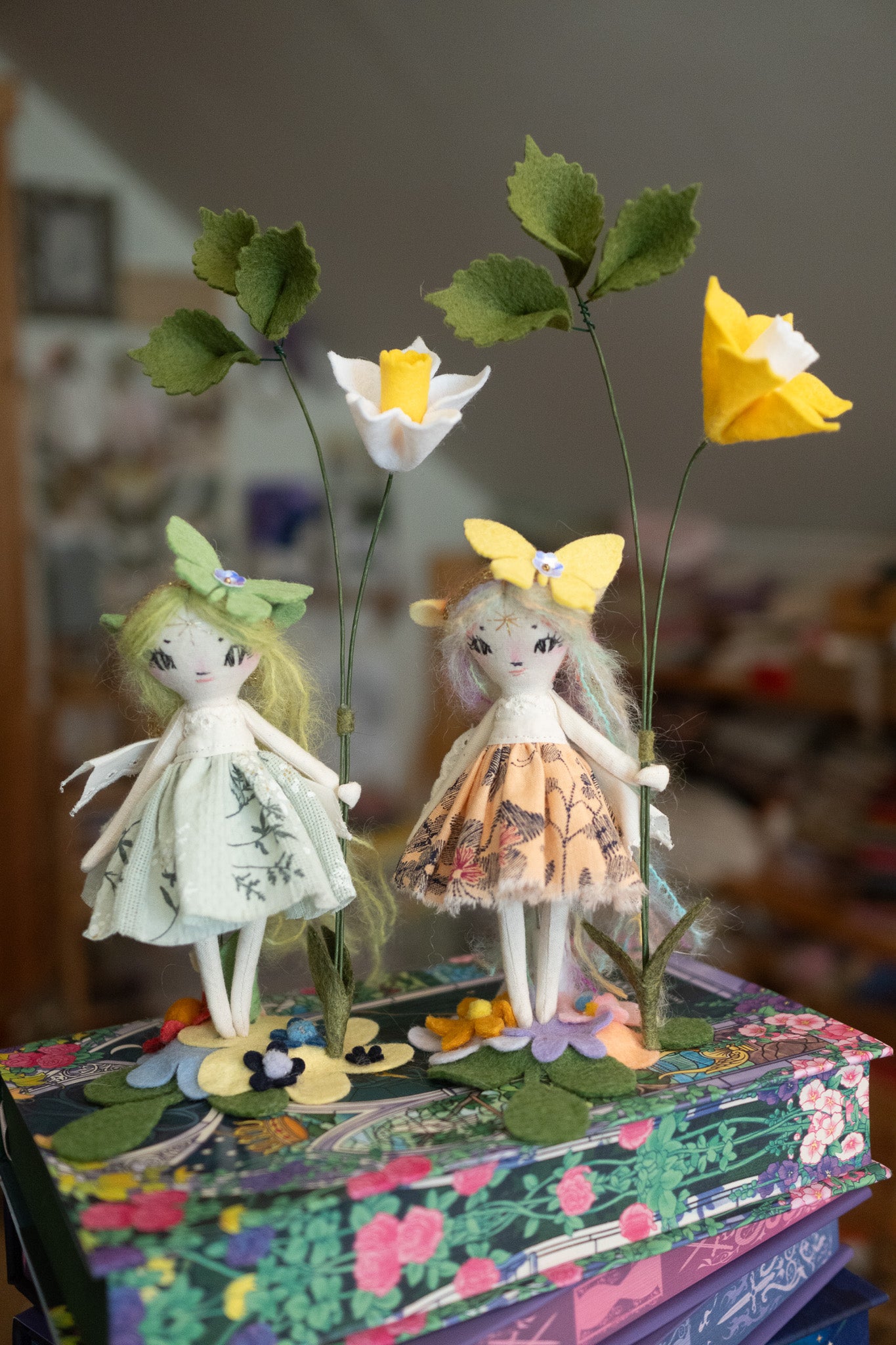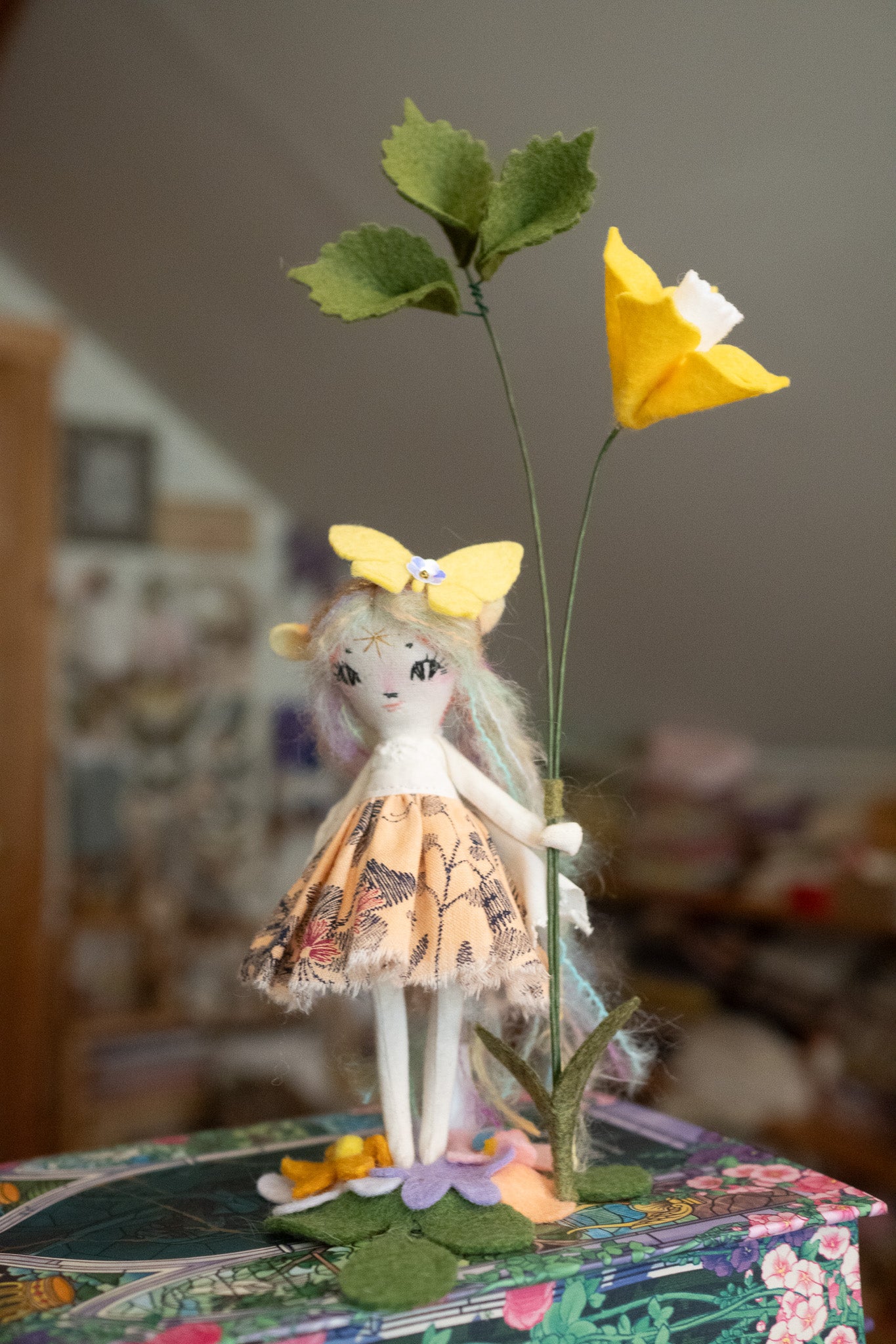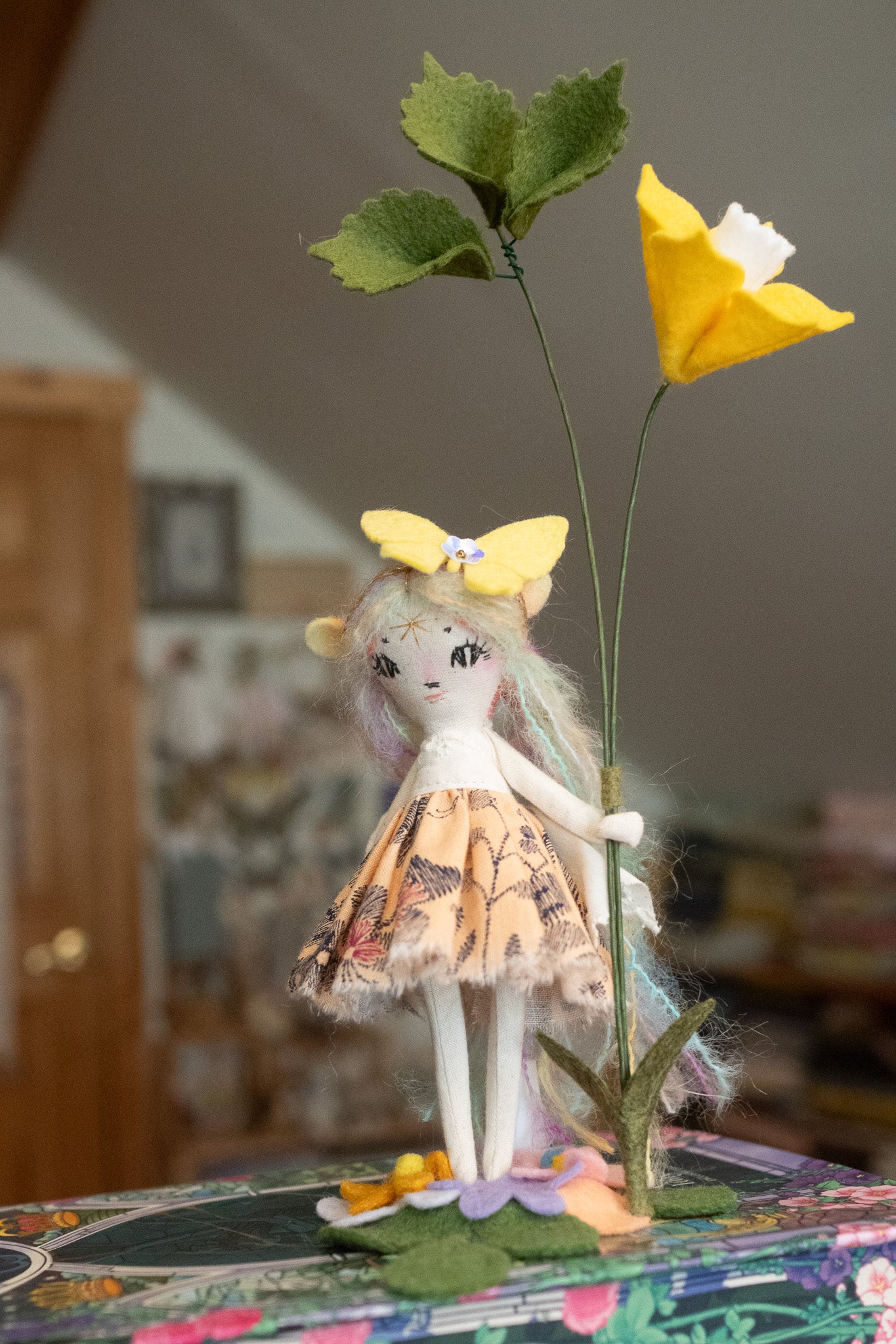 Each doll comes with a tiny doll stand covered in wool felt flowers and leaves so they can be displayed on any surface in your home! This batch also comes with wire/felt flowers!