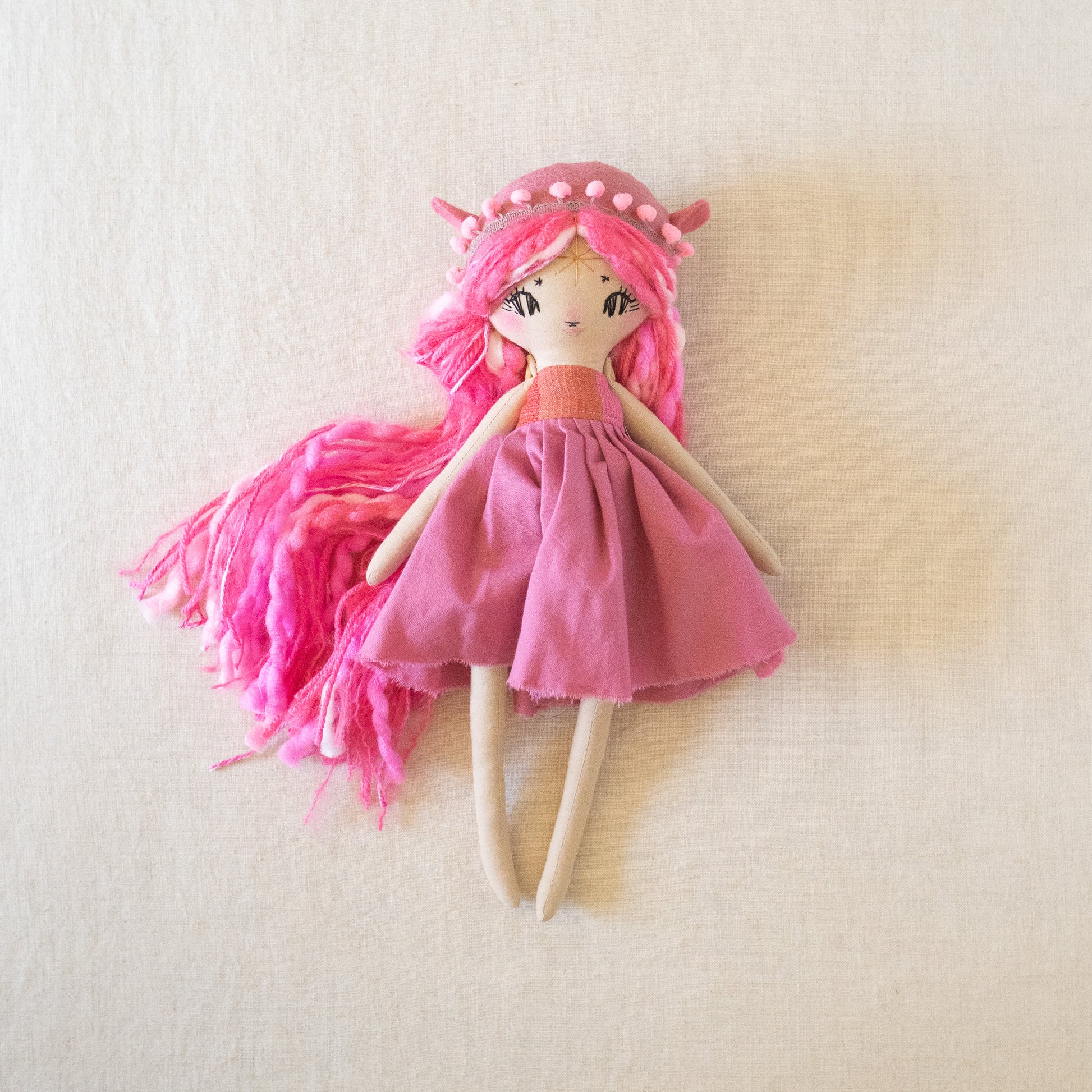 This unique doll is made up of cotton, wool/rayon felt, and stuffed with recycled pollyfill. The yarn hair is a combination of wool, mohair, and acrylic yarn. All of our dolls have button-jointed arms. Each doll is lovingly hand stitched in Asheville, North Carolina.