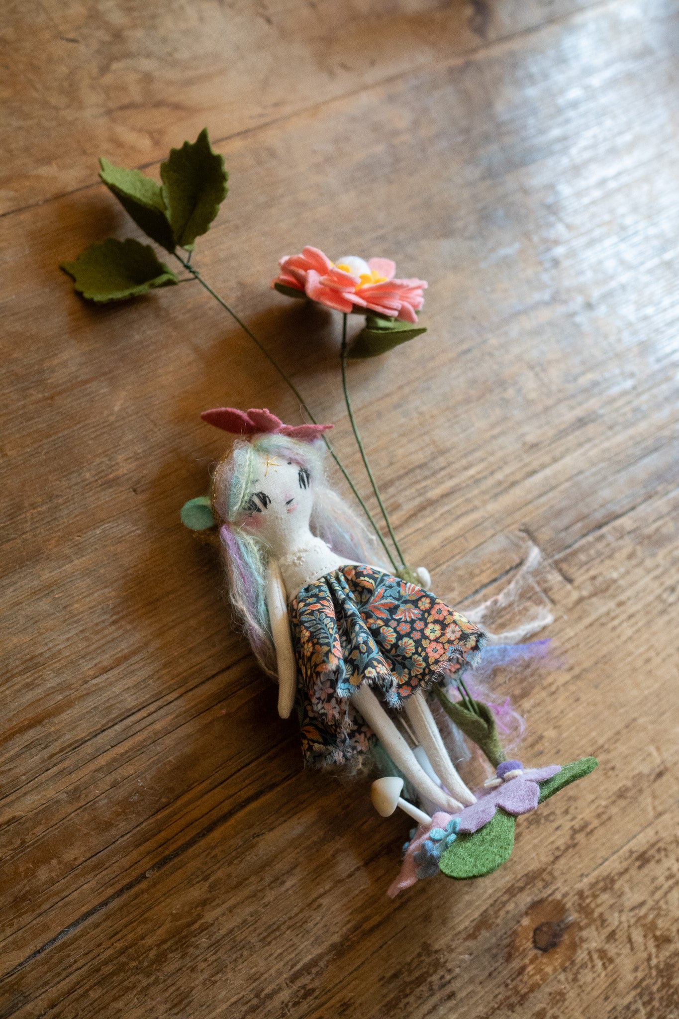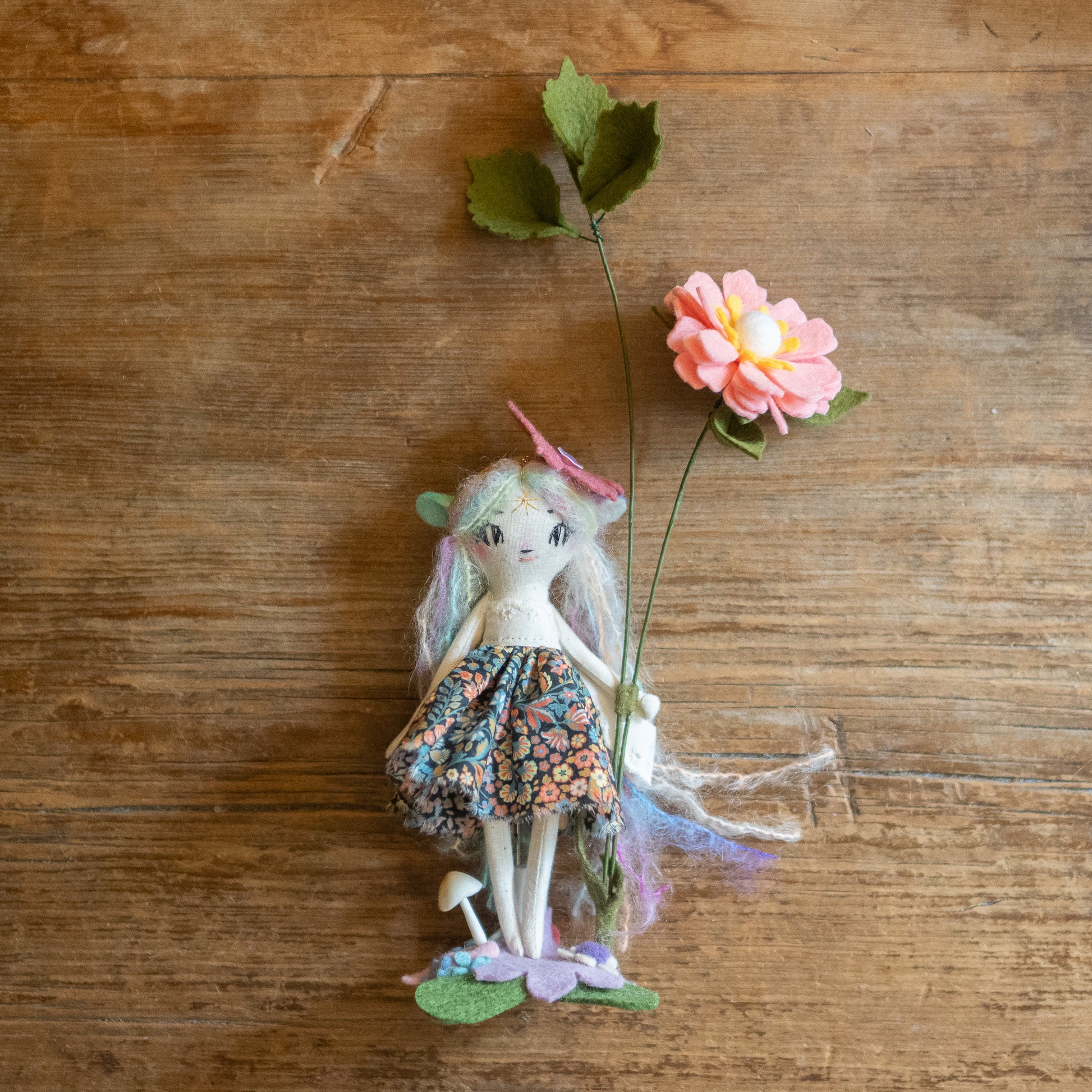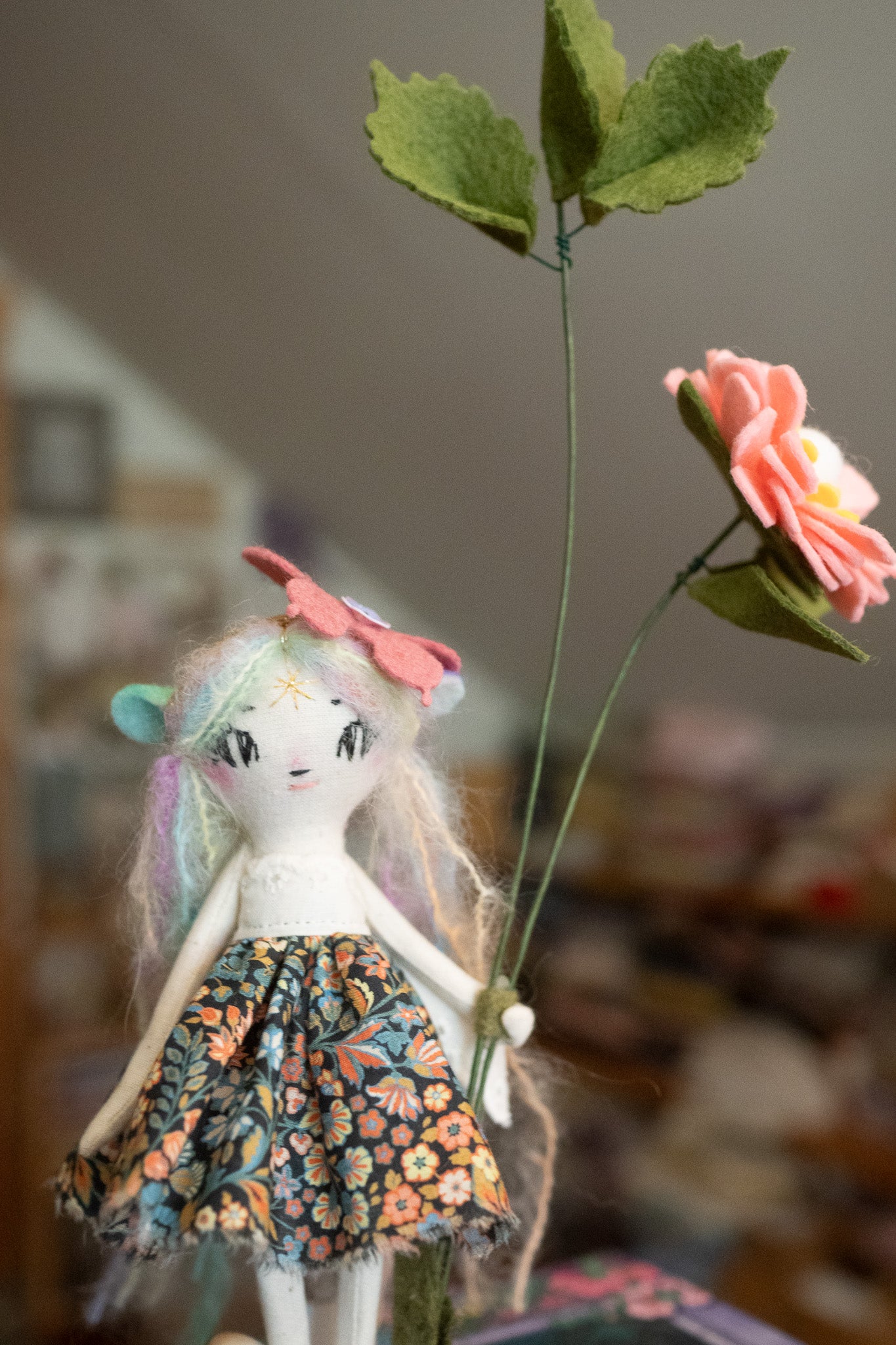 Each doll comes with a tiny doll stand covered in wool felt flowers and leaves so they can be displayed on any surface in your home! This batch also comes with wire/felt flowers!