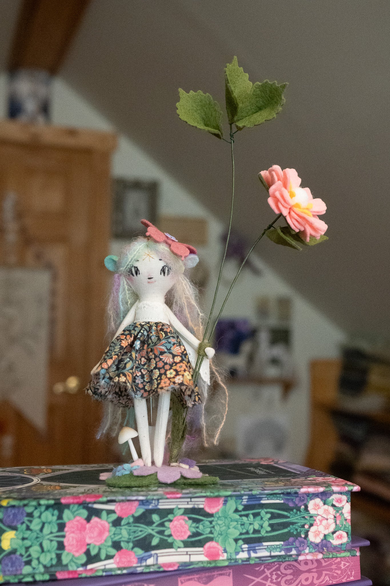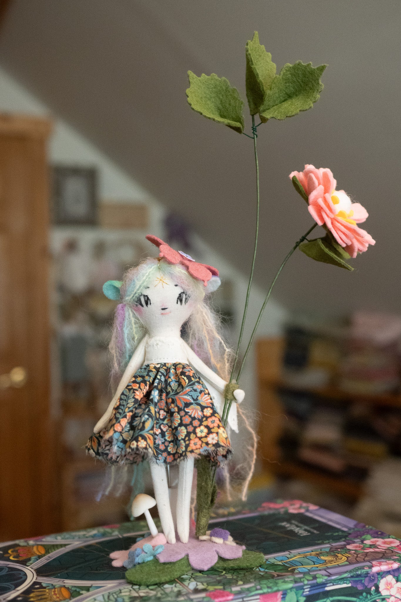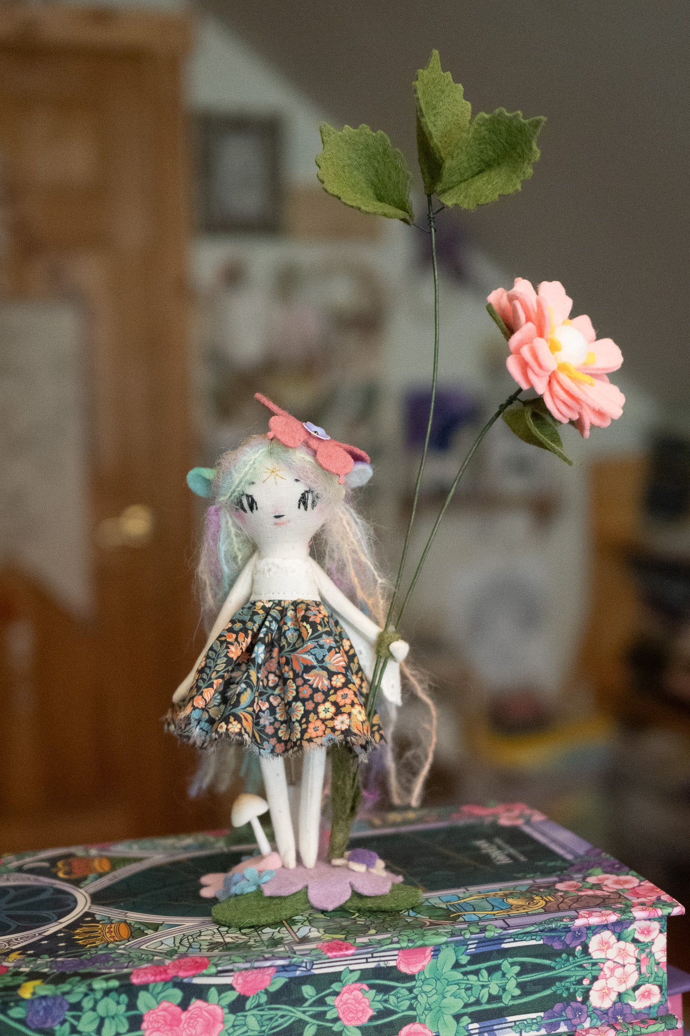 Each doll comes with a tiny doll stand covered in wool felt flowers and leaves so they can be displayed on any surface in your home! This batch also comes with wire/felt flowers!