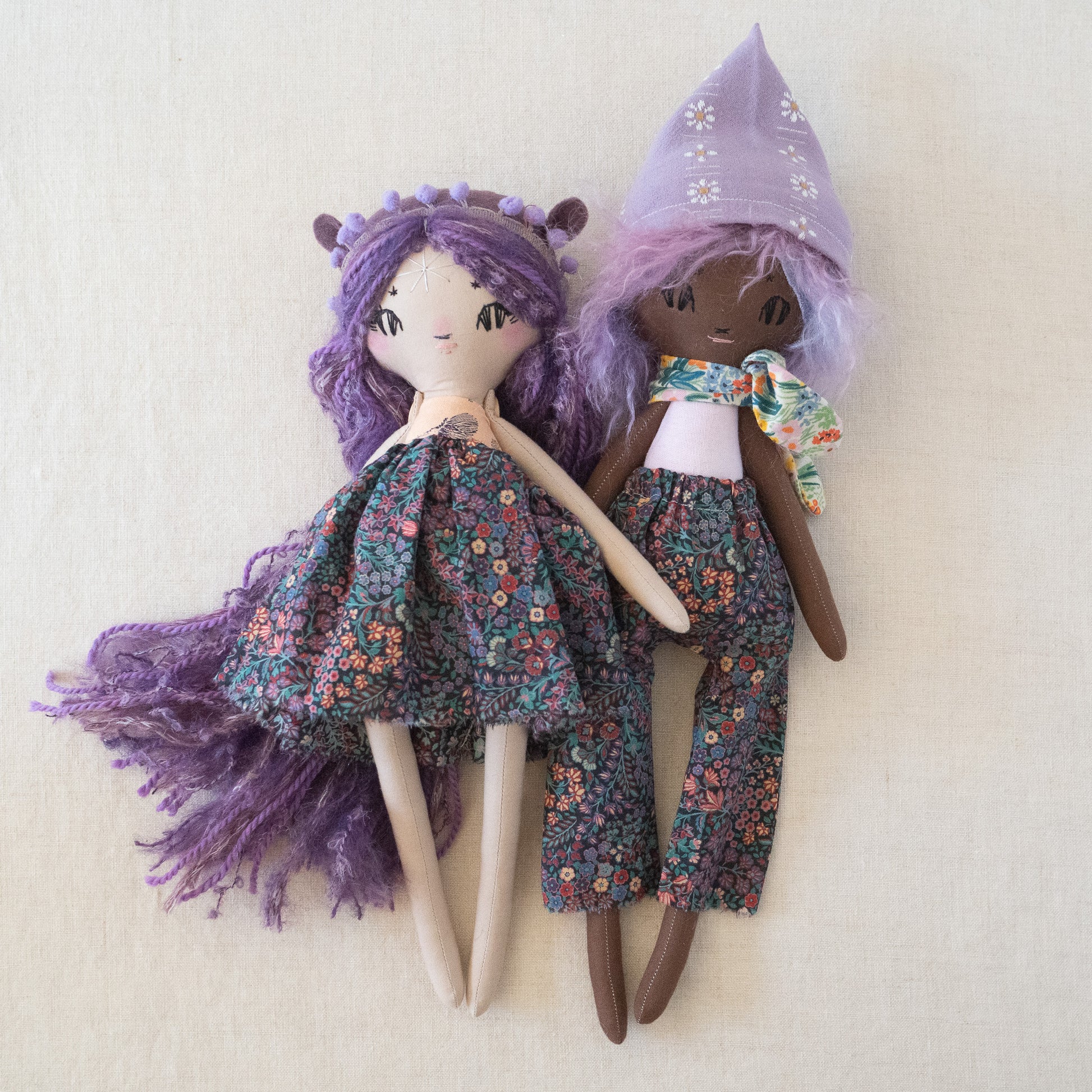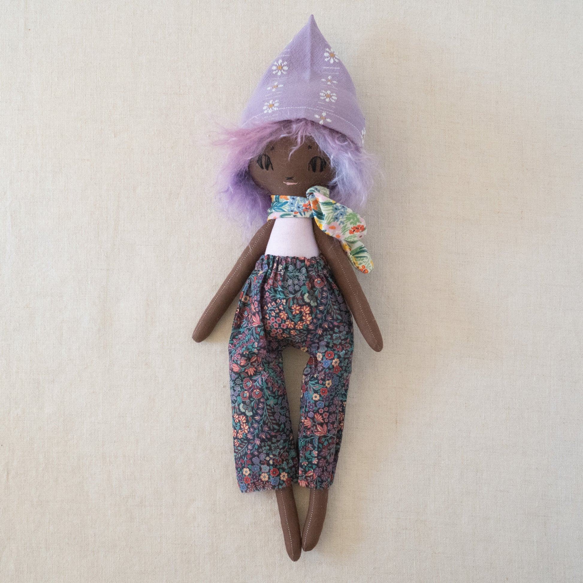 This unique doll is made up of cotton, wool/rayon felt, and stuffed with recycled pollyfill. The hair is german mohair fabric. All of our dolls have button-jointed arms. Each doll is lovingly hand stitched in Asheville, North Carolina.