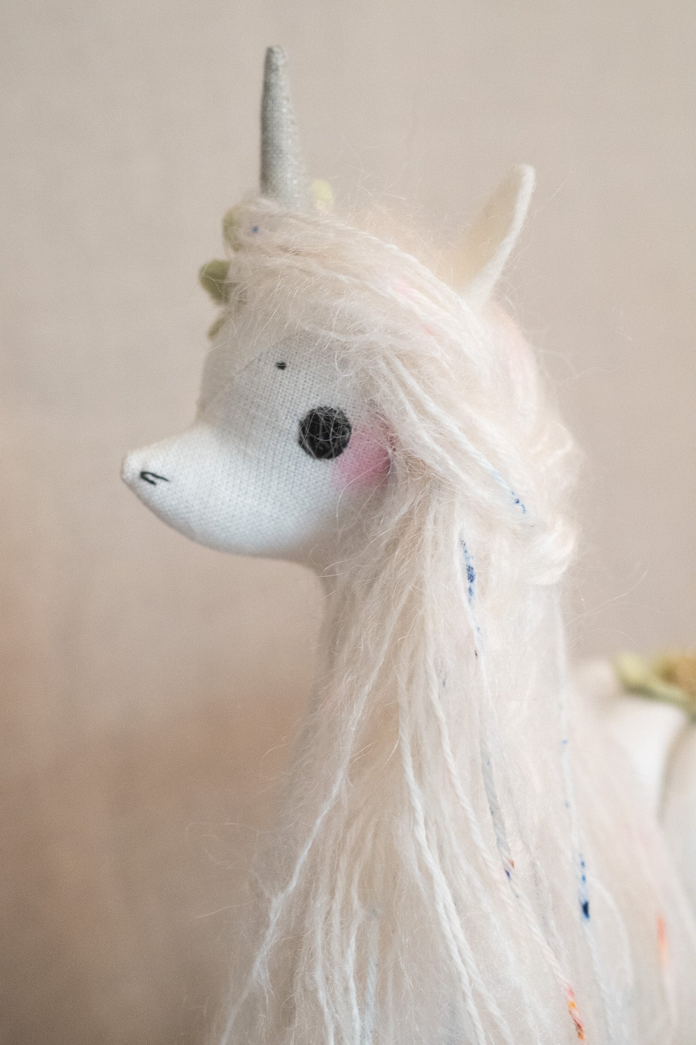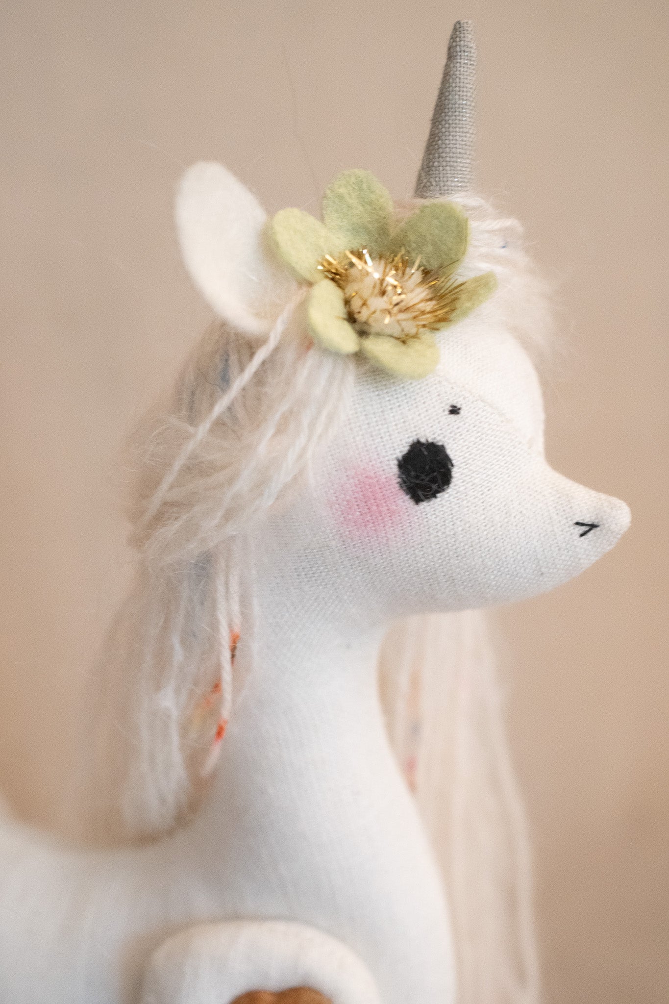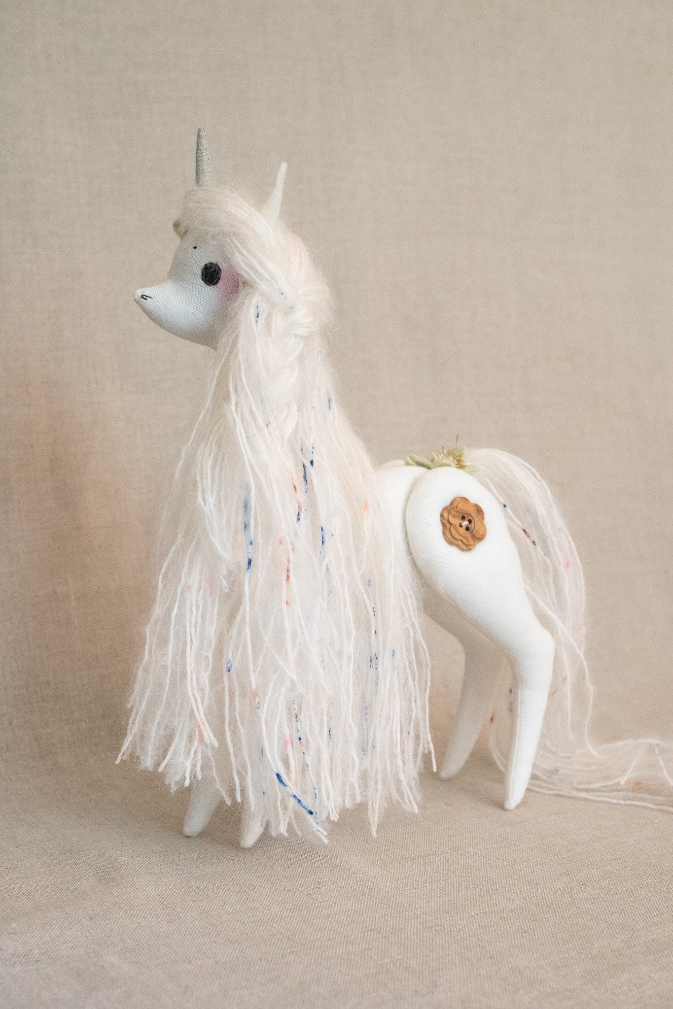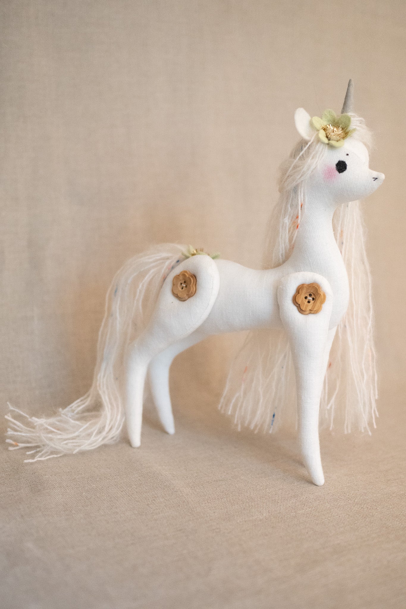 This little button jointed Unicorn is ever so sweet and magical! She is not meant as a toy as much as a beautiful display/decor item and would look so whimsical on top of a stack of pretty books or standing pretty on a shelf full of special things.
