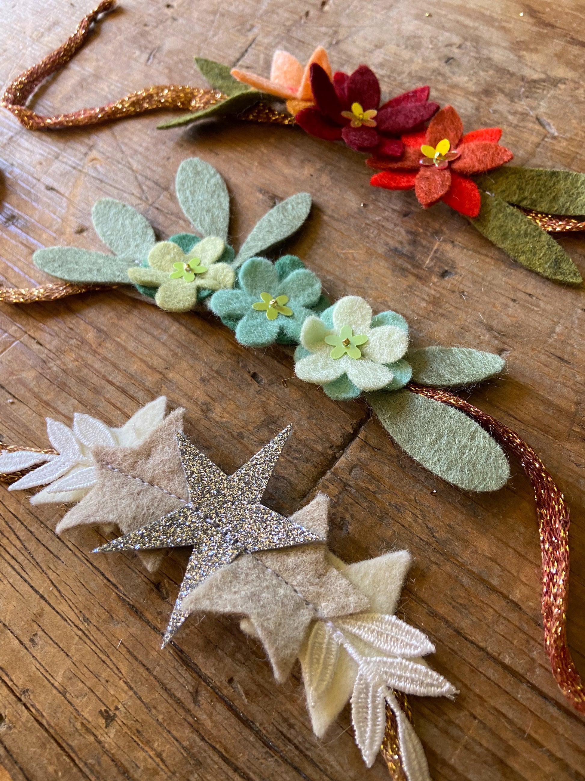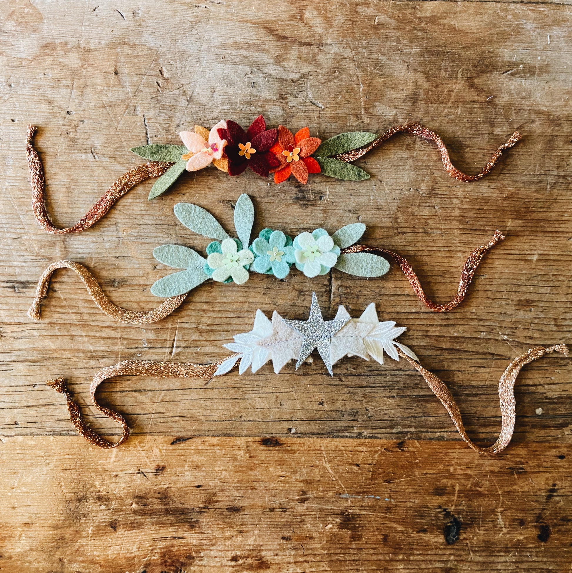 Each crown is sewn from beautiful lace or trim and felt flowers or stars. They fit perfectly on all pixies, petal pixies, and Forest Friends.