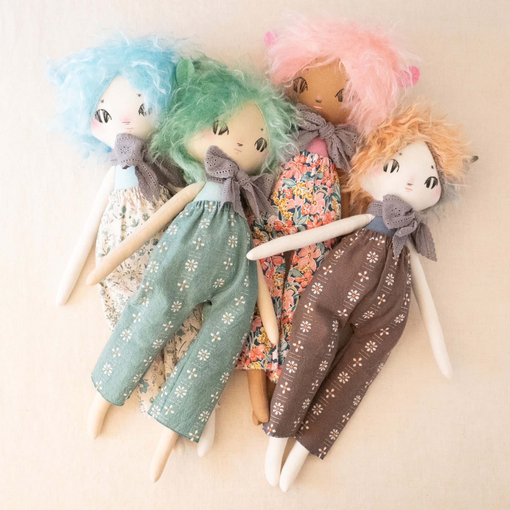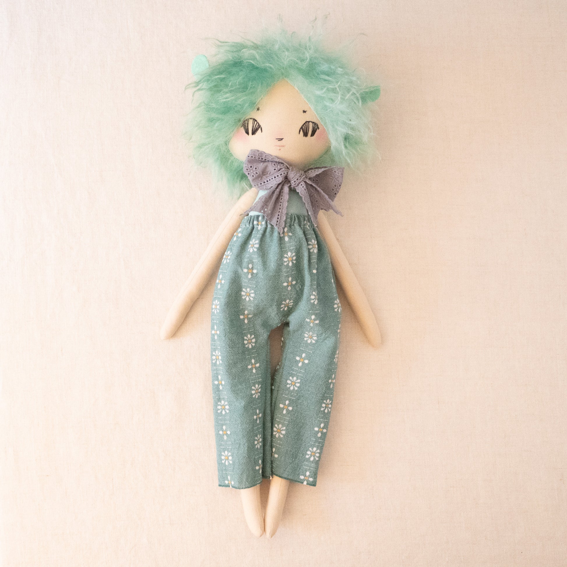 This unique doll is made up of cotton, wool/rayon felt, and stuffed with recycled pollyfill. The hair is german mohair fabric and his body is a hand dyed linen. All of our dolls have button-jointed arms. Each doll is lovingly hand stitched in Asheville, North Carolina.