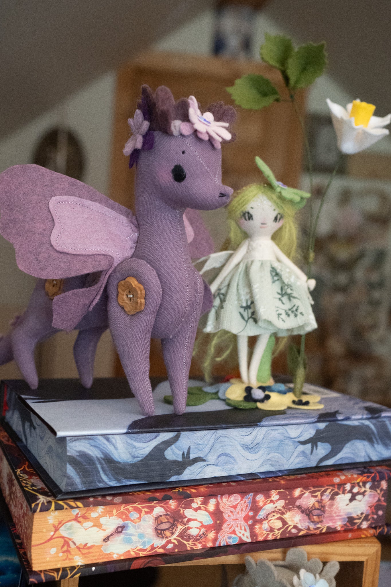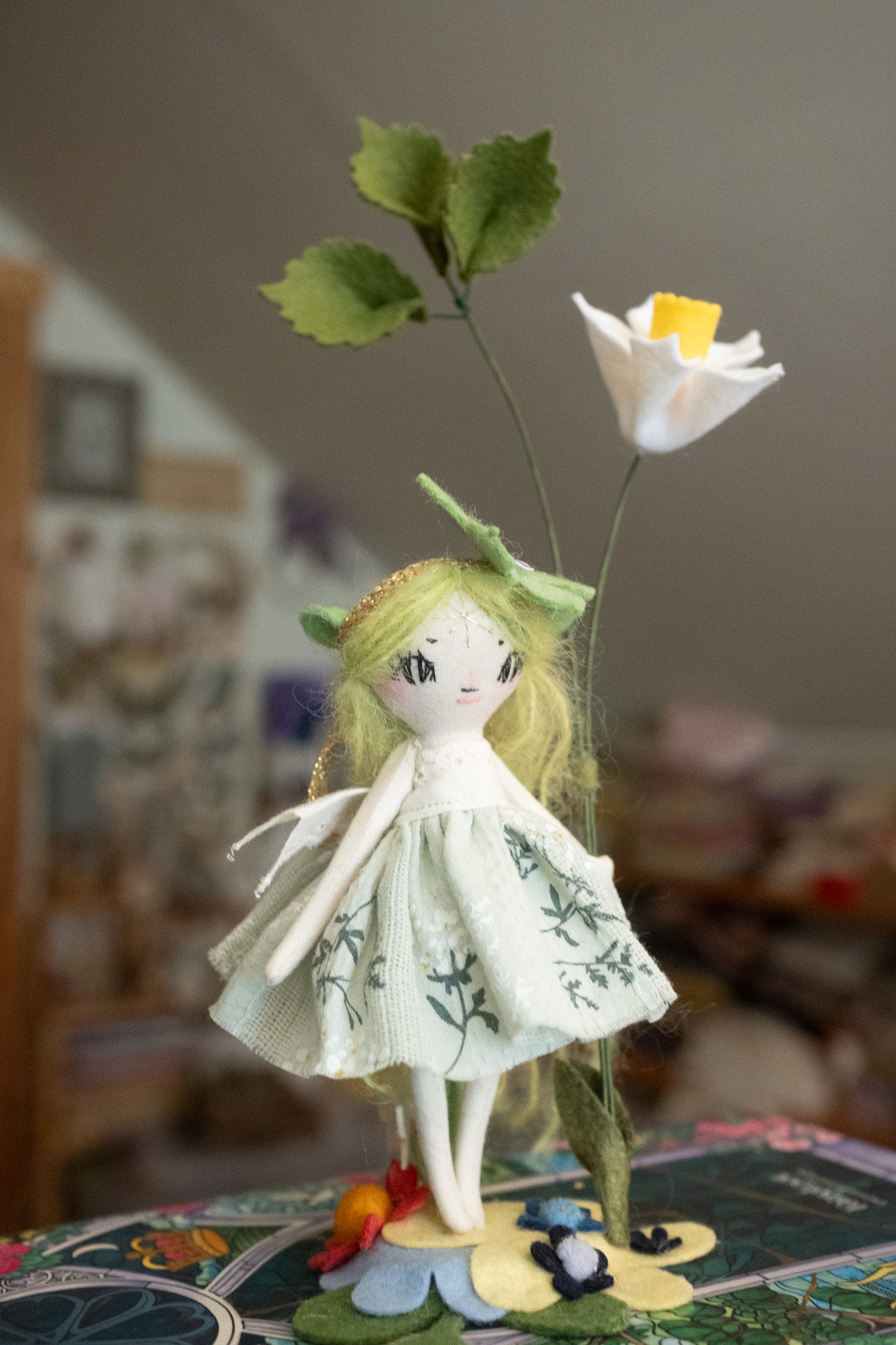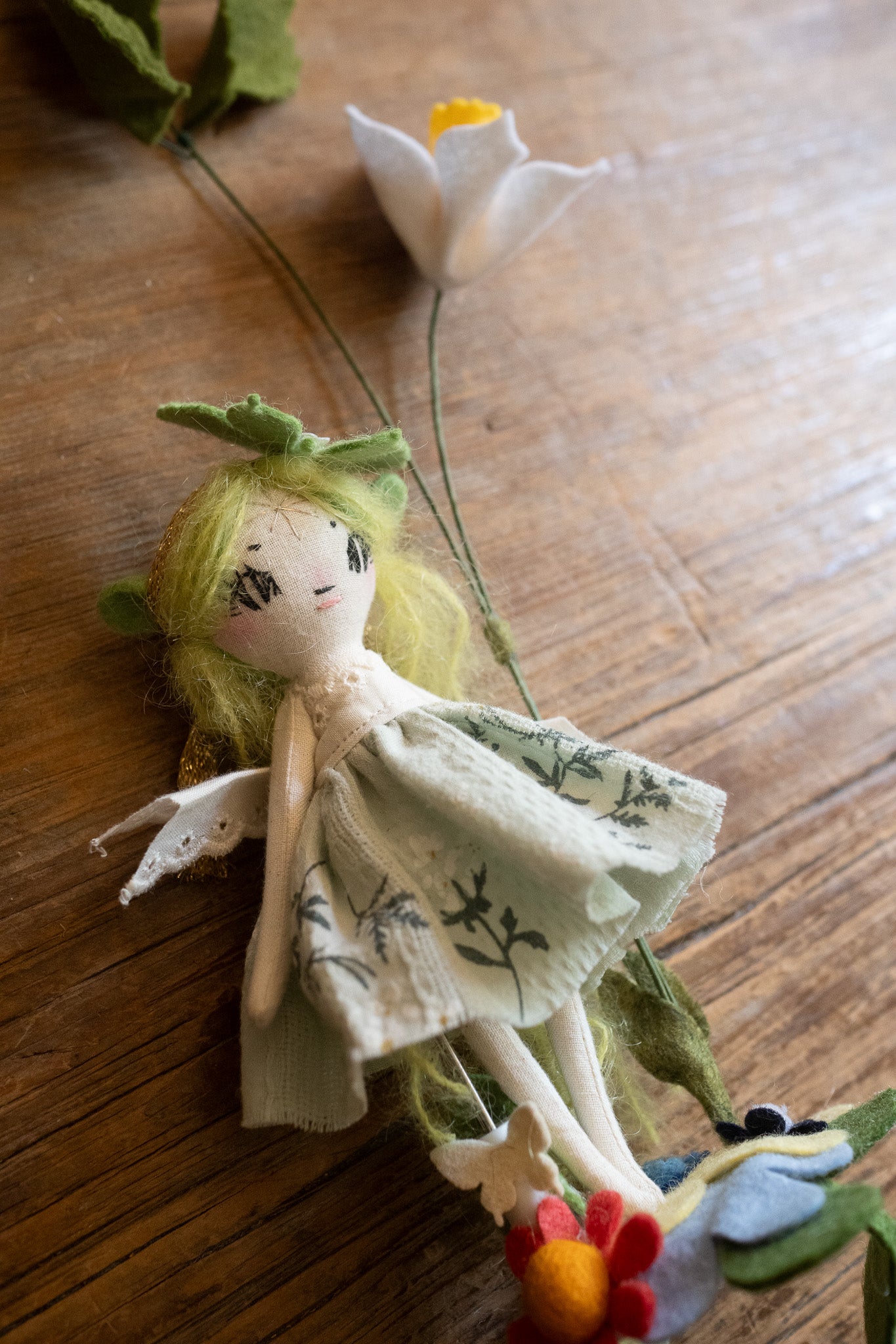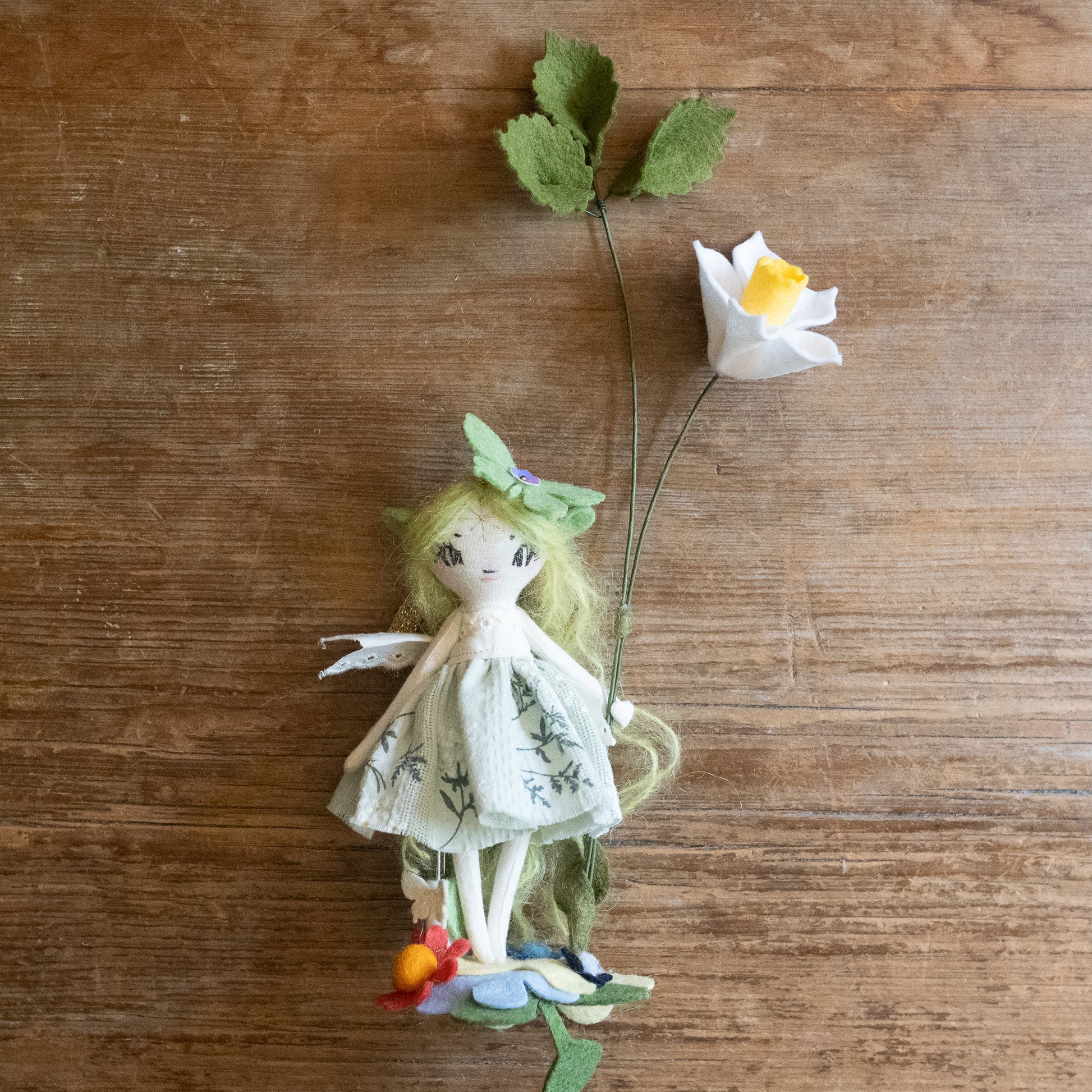 Each doll comes with a tiny doll stand covered in wool felt flowers and leaves so they can be displayed on any surface in your home! This batch also comes with wire/felt flowers!