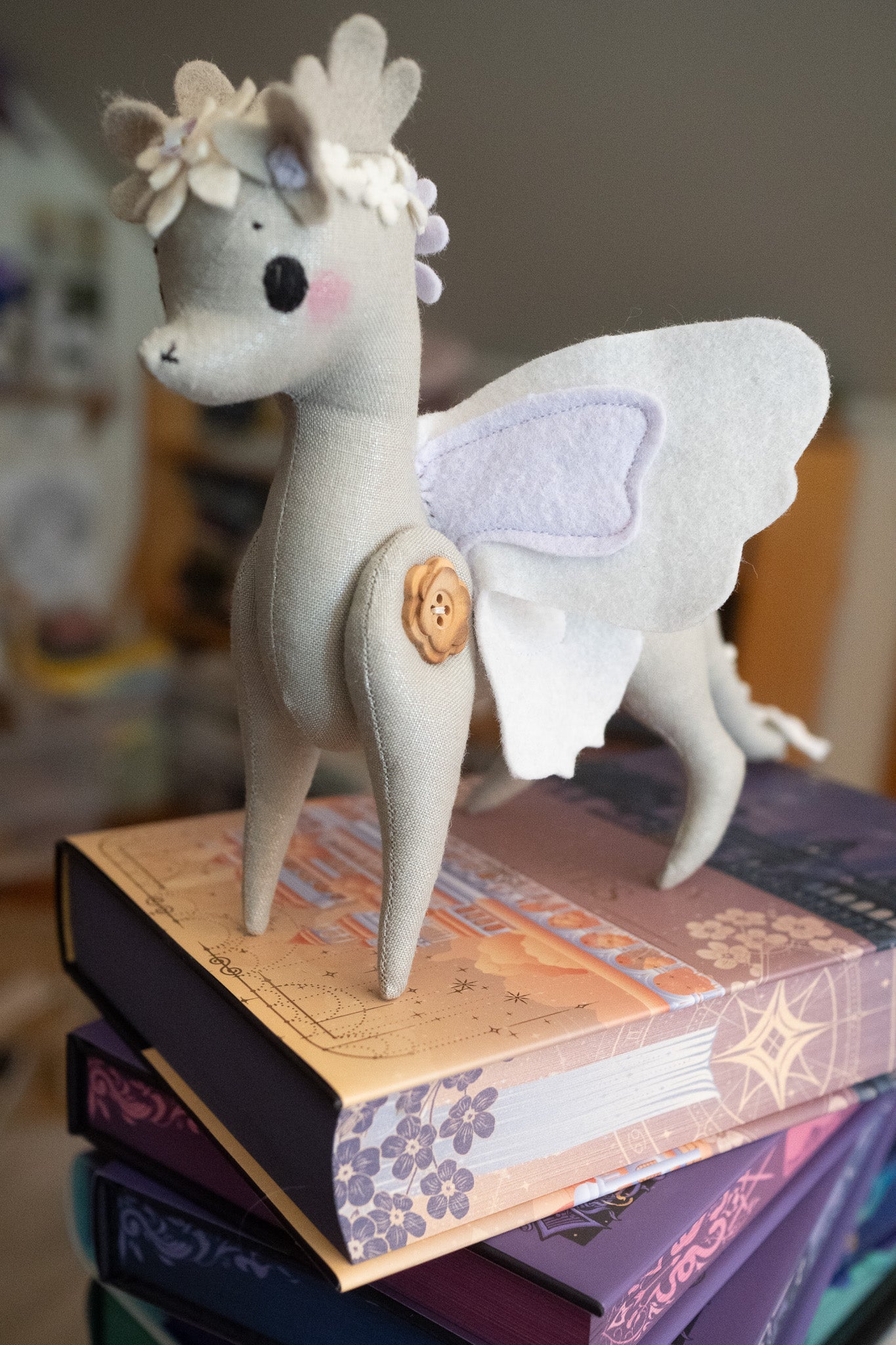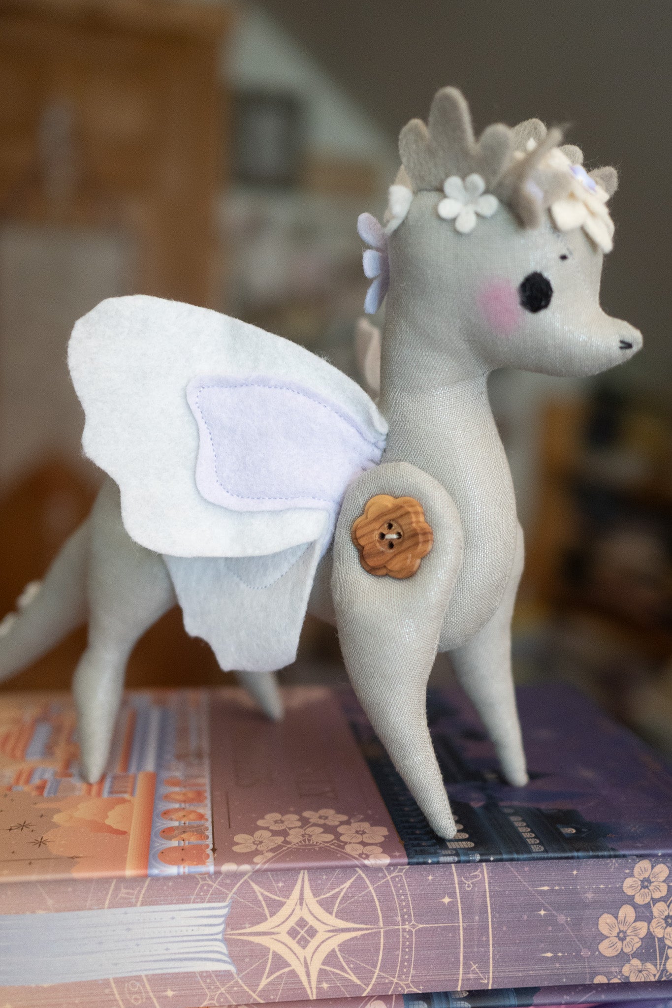 This little button dragon is ever so sweet and magical! She is not meant as a toy as much as a beautiful display/decor item and would look so whimsical on top of a stack of pretty books or standing pretty on a shelf full of special things.