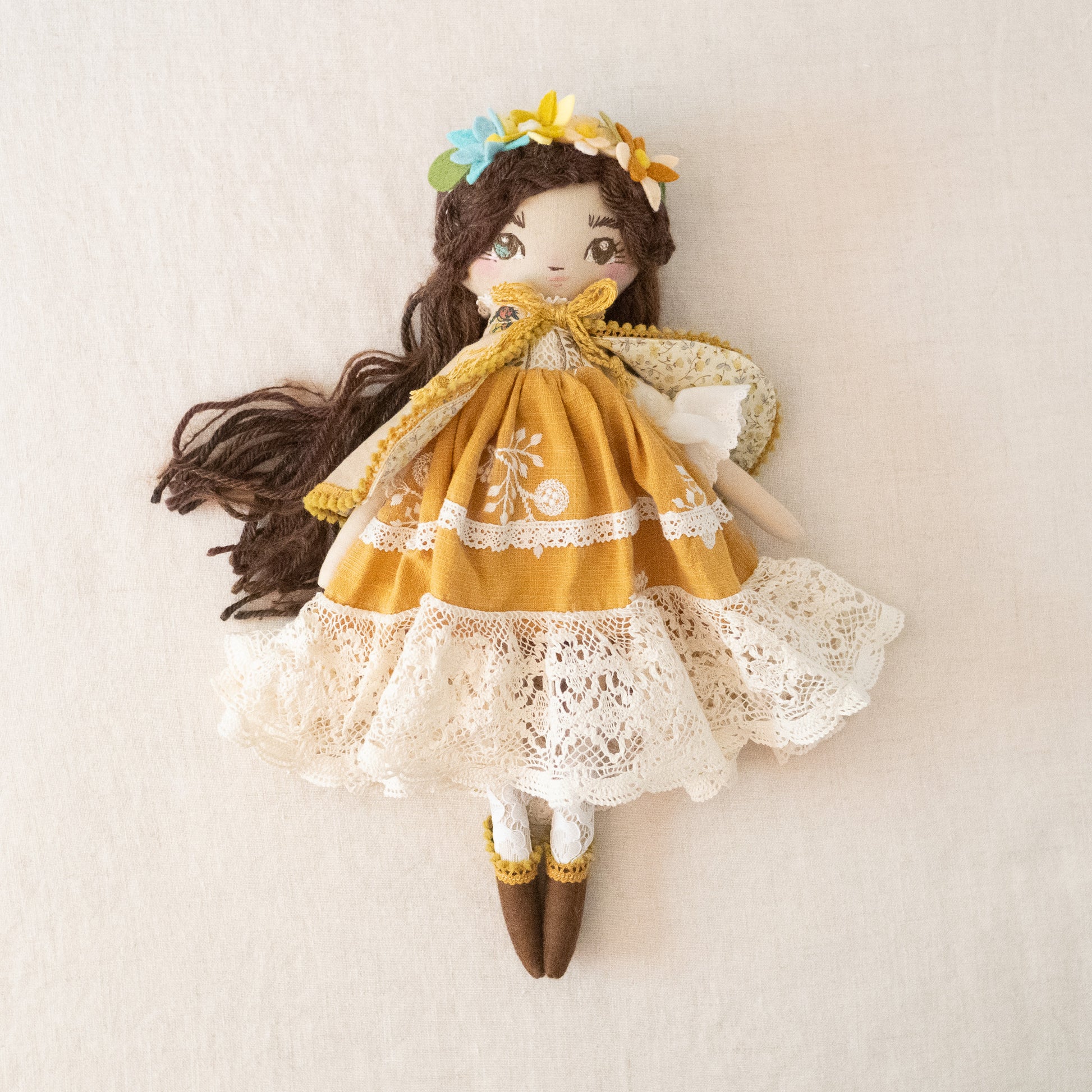 This unique doll is made up of cotton, wool/rayon felt, and stuffed with recycled pollyfill. The yarn hair is a combination of wool, mohair, and acrylic yarn. All of our dolls have button-jointed arms. Each doll is lovingly hand stitched in Asheville, North Carolina.