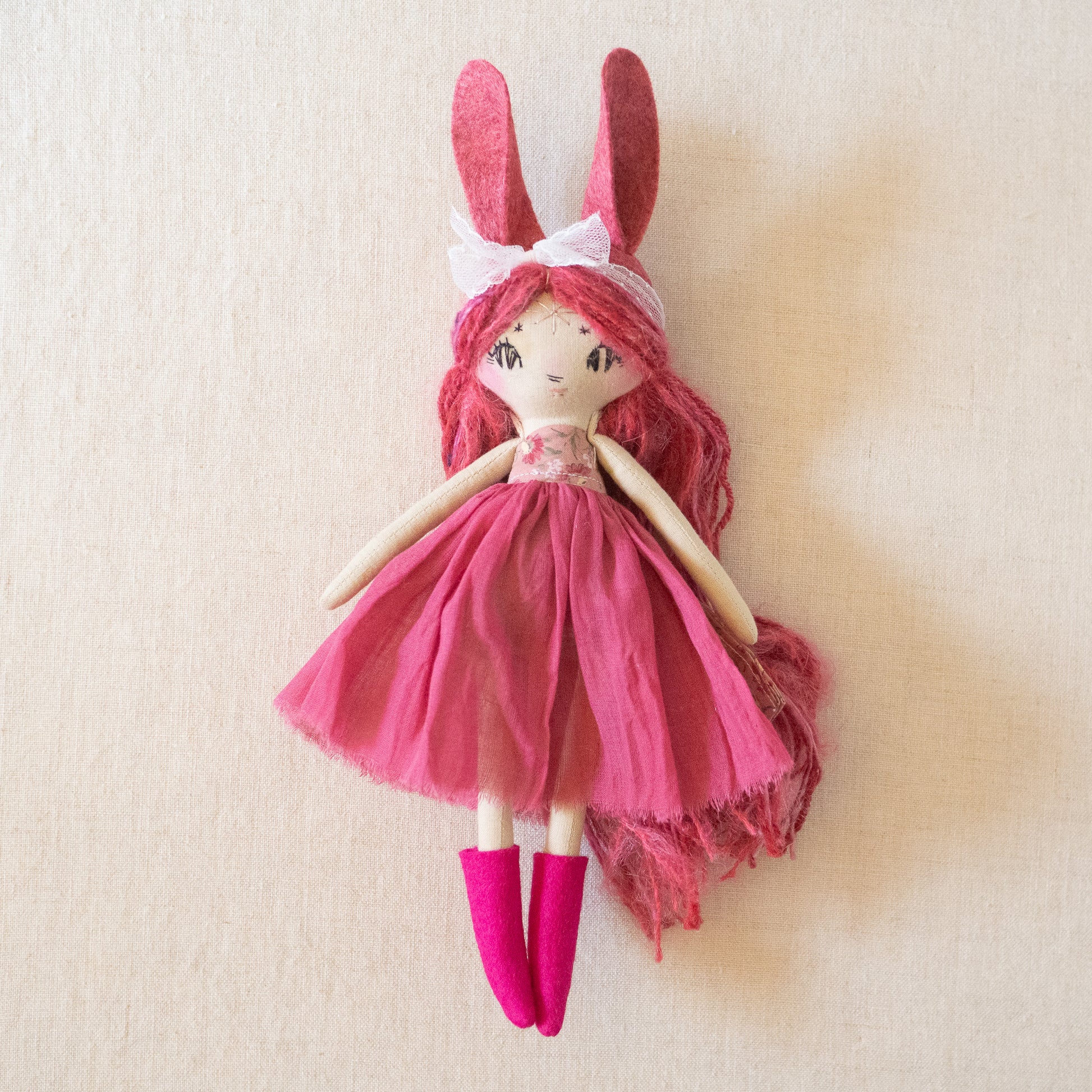 This unique doll is made up of cotton, wool/rayon felt, and stuffed with recycled pollyfill. The yarn hair is a combination of wool, mohair, and acrylic yarn. Each doll is lovingly hand stitched in Asheville, North Carolina.