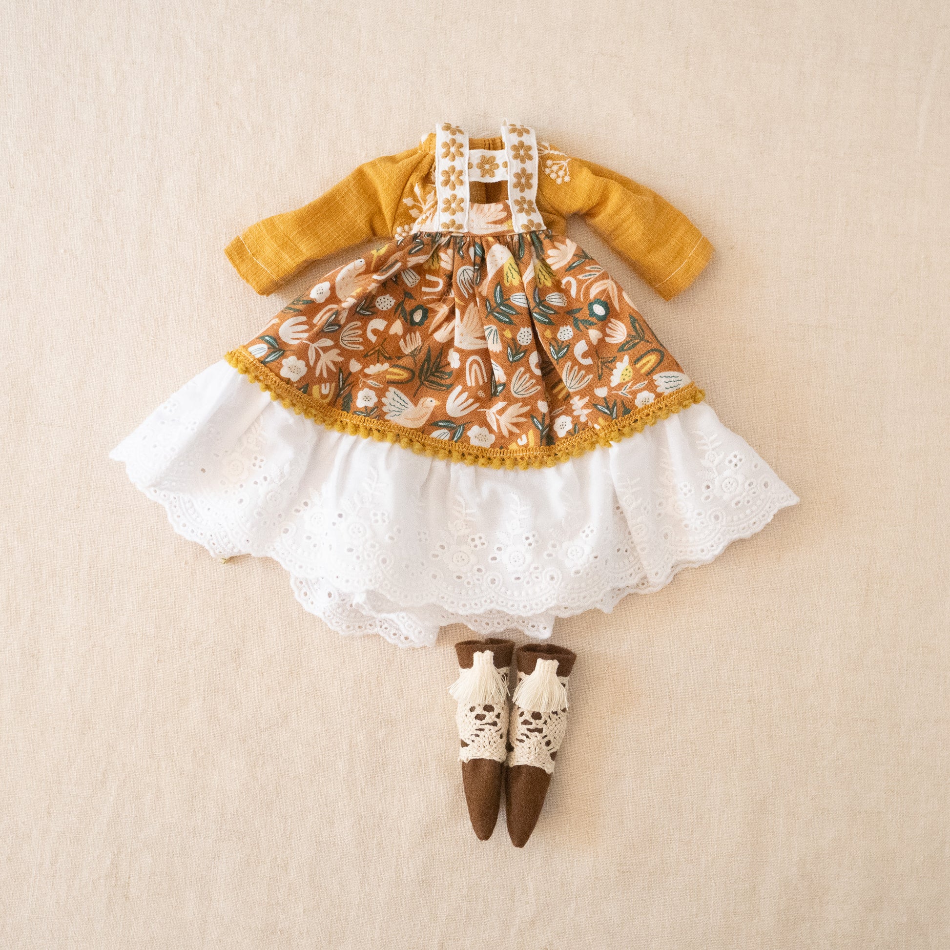 This set includes - a golden blouse, detailed pinafore skirt, and fancy felt boots