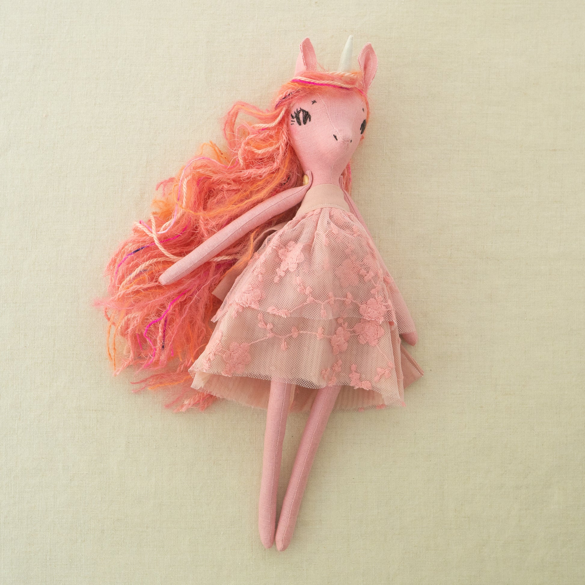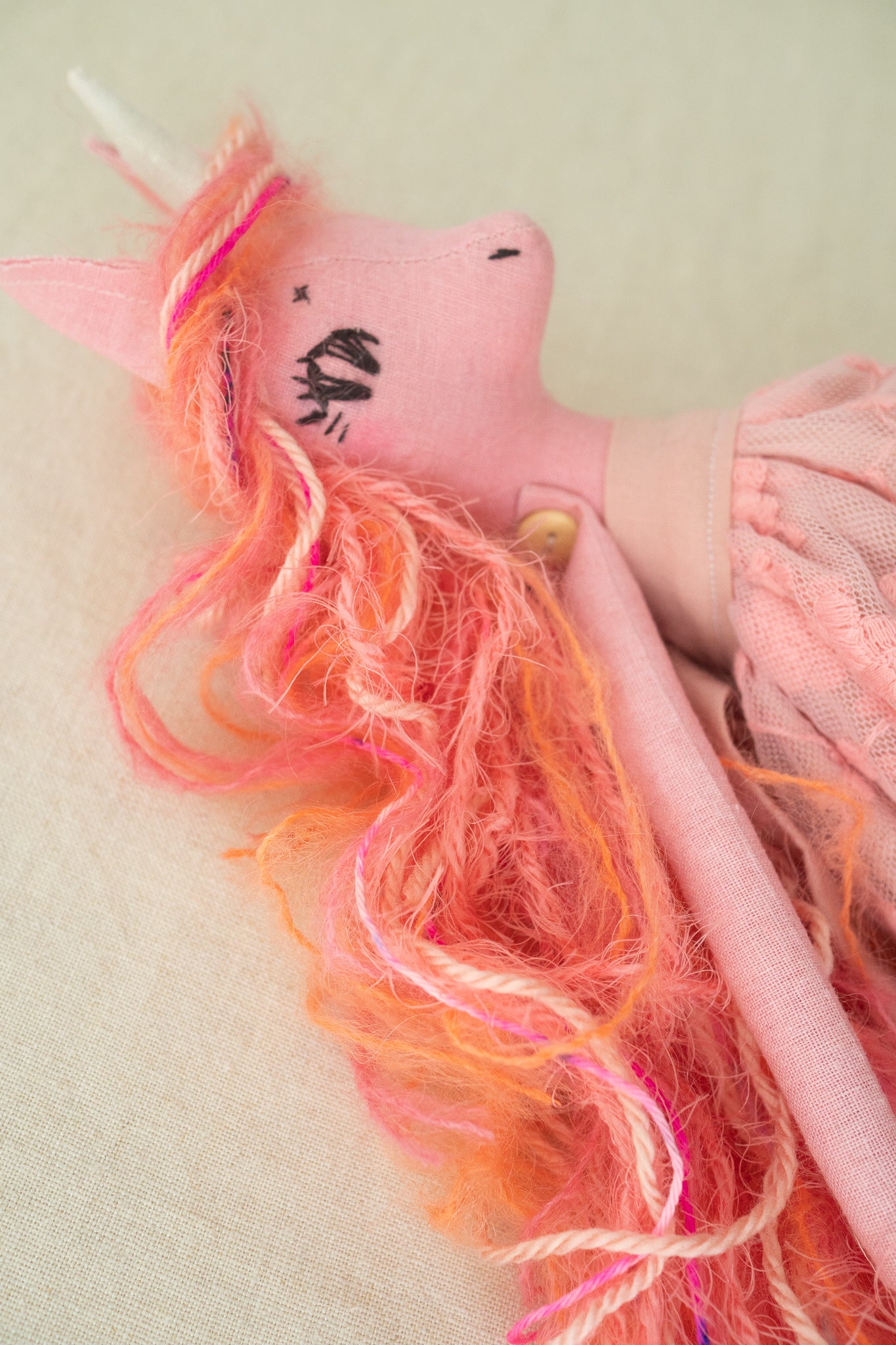 The Unicorn is made up of cotton, wool/rayon felt, and stuffed with recycled pollyfill. The yarn hair is a combination of wool, mohair, and acrylic yarn. All our dolls have button jointed arms. Each doll is lovingly hand stitched in Asheville, North Carolina.