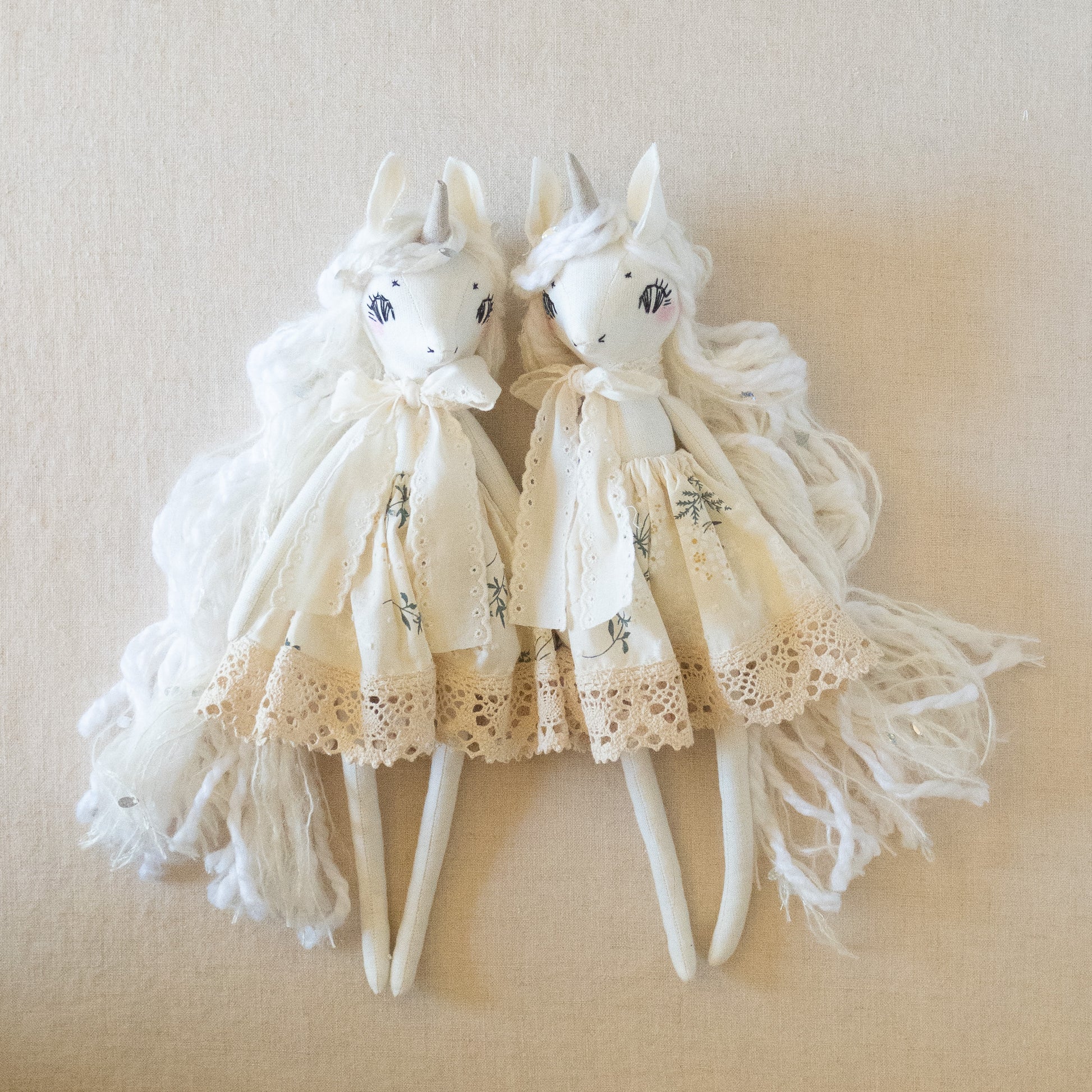 At 14" tall our Unicorns are a bit more delicate than the Pixie dolls. They are best as snuggling companions or for collectors! The Unicorn dolls fits all our standard clothing and can be dressed and undressed over and over however there head is a bit more narrow and they don't do so well with hats!