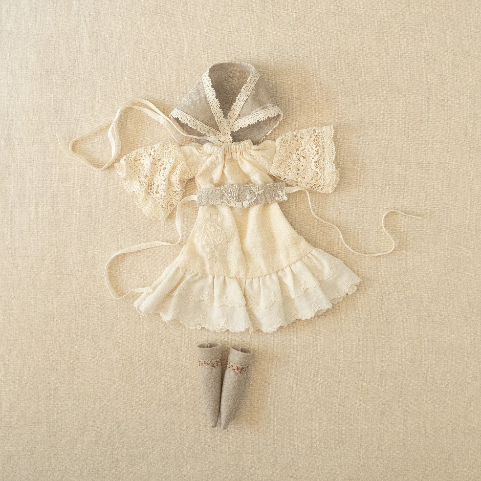 This set includes - a kerchief, lace trimmed and bell sleeved bohemian dress, corset, tall felt boots