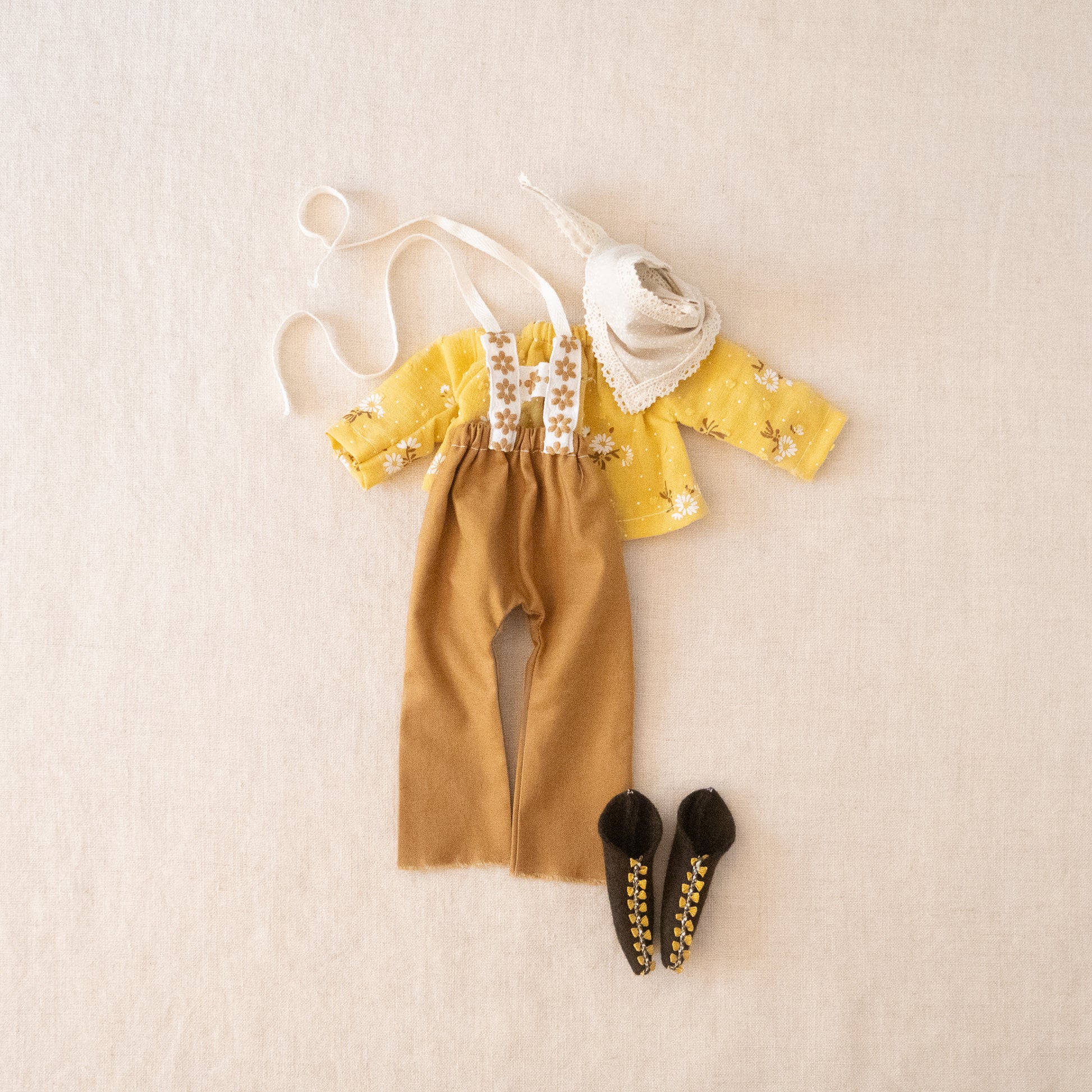 This set includes - a long-sleeved shirt, scarf, embroidered overalls, and felt boots