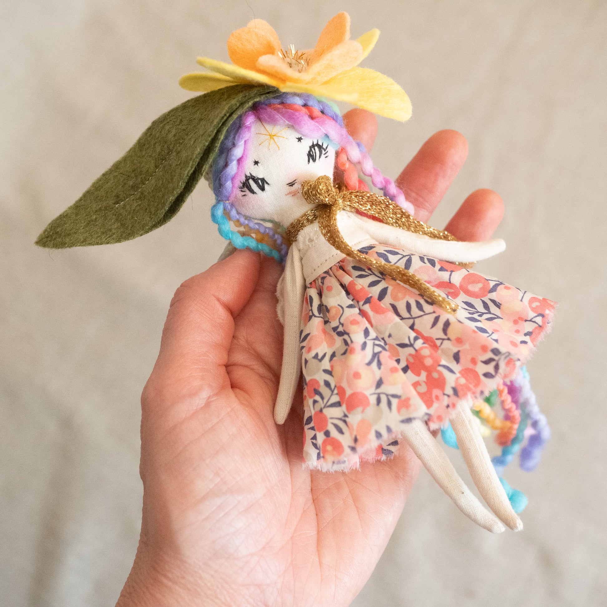 At 5.5" tall these micro pixies are the sweetest little dolls we have ever made. They are truly a labor of love with all their tiny details. These dolls are made out of cotton and wool felt and their limbs are connected with wire. While they are mildly posable we do not recommend changing their position often as they are not a toy and wont stand up to vigorous handling.