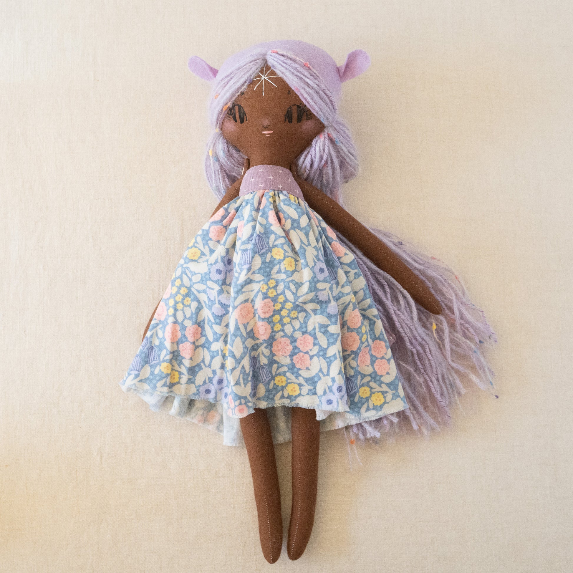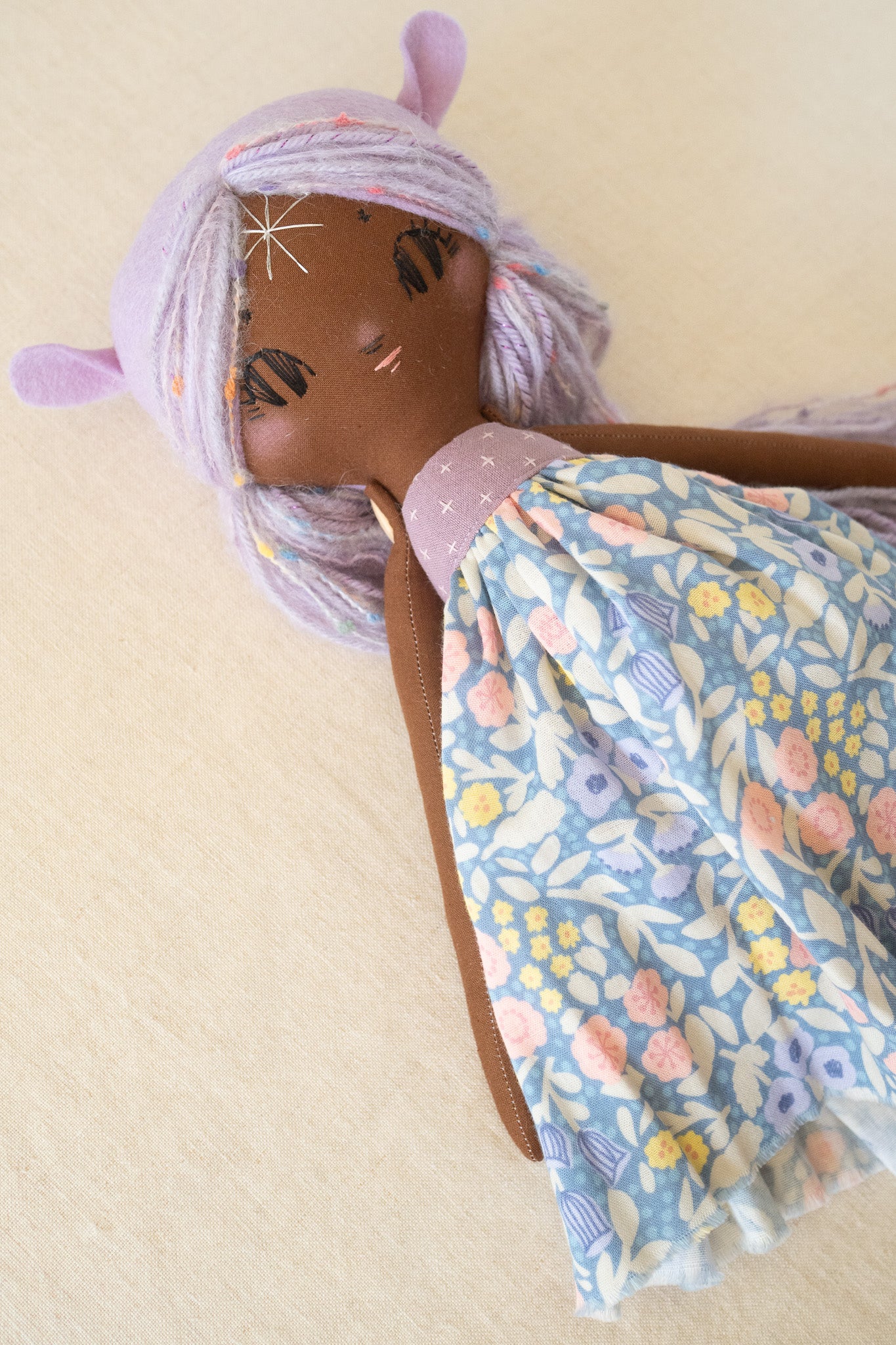 This unique doll is made up of cotton, wool/rayon felt, and stuffed with recycled pollyfill. The yarn hair is a combination of wool, mohair, and acrylic yarn. All of our dolls have button-jointed arms. Each doll is lovingly hand stitched in Asheville, North Carolina.