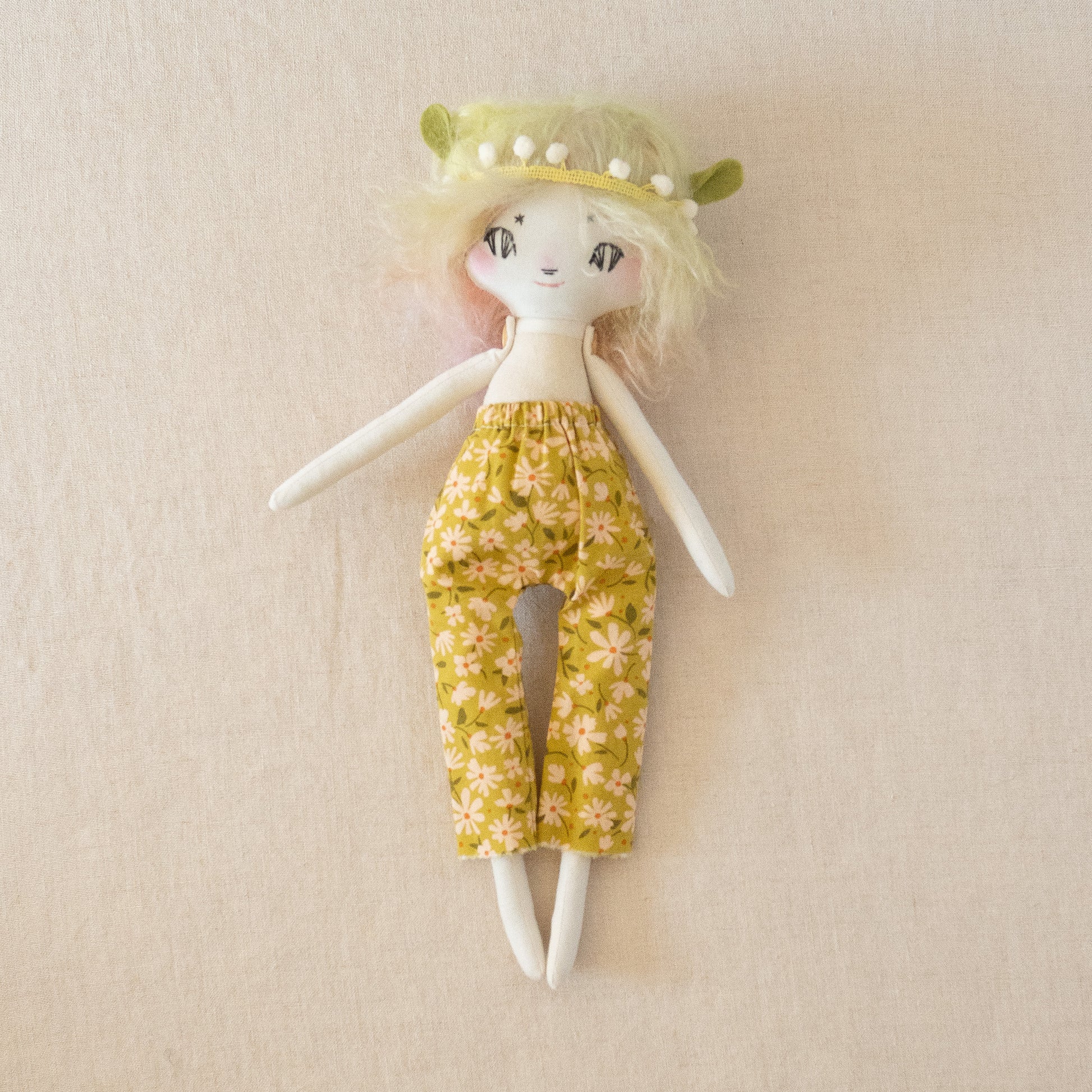 This unique doll is made up of cotton, wool/rayon felt, and stuffed with recycled pollyfill. The yarn hair is a combination of wool, mohair, and acrylic yarn. All of our dolls have button-jointed arms. Each doll is lovingly hand stitched in Asheville, North Carolina.