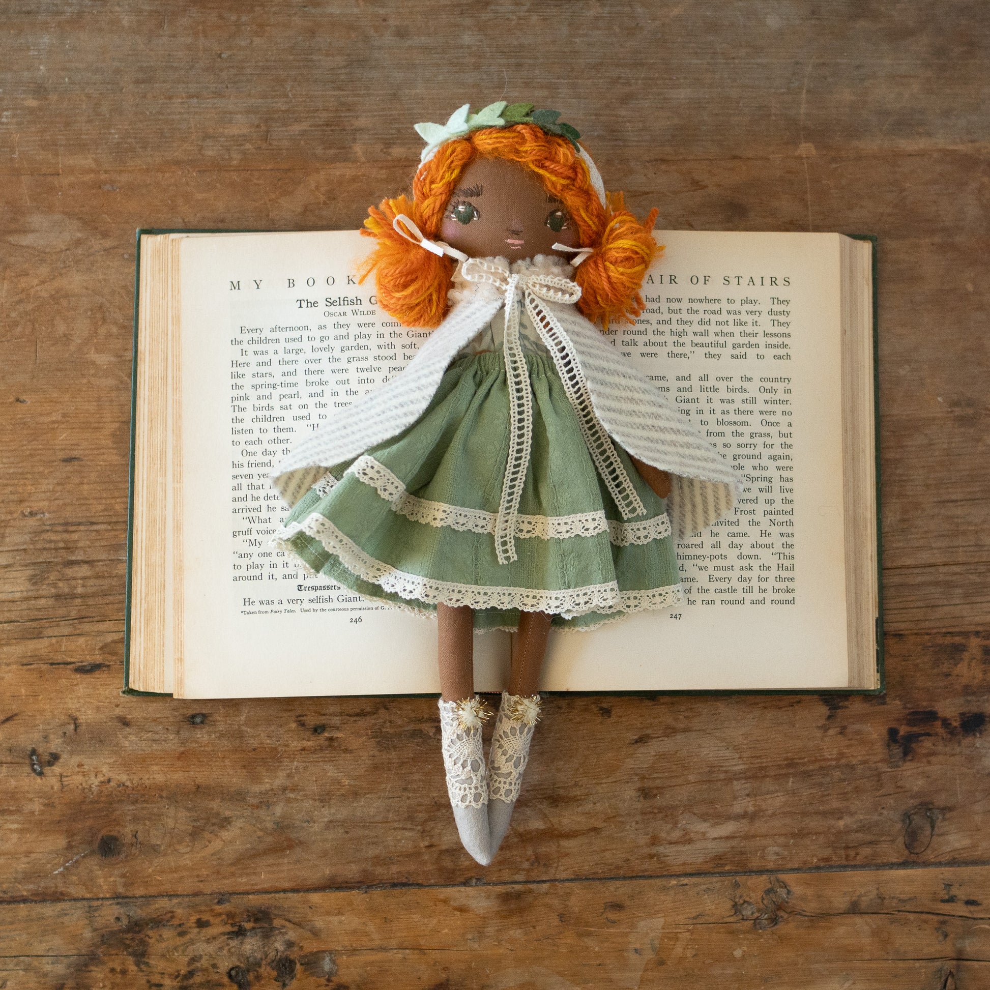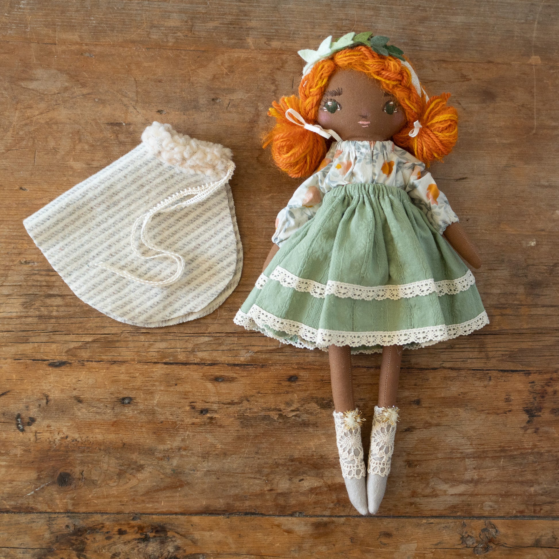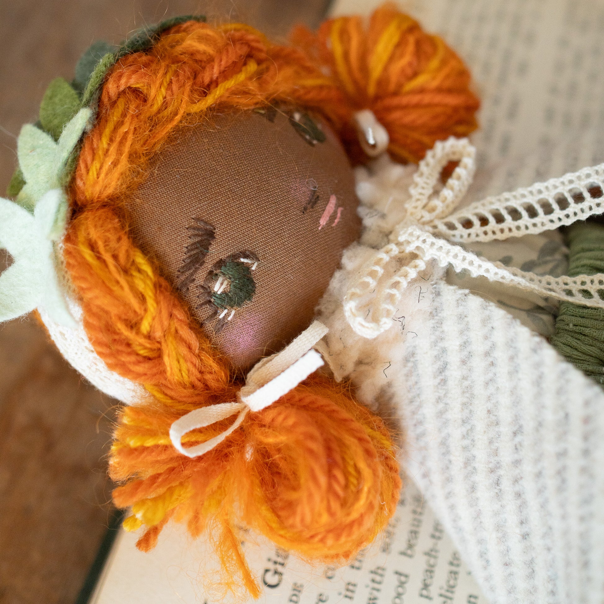 This unique doll is made up of cotton, wool/rayon felt, and stuffed with recycled pollyfill. The yarn hair is a combination of wool, mohair, and acrylic yarn. All of our dolls have button-jointed arms. Each doll is lovingly hand stitched in Asheville, North Carolina.