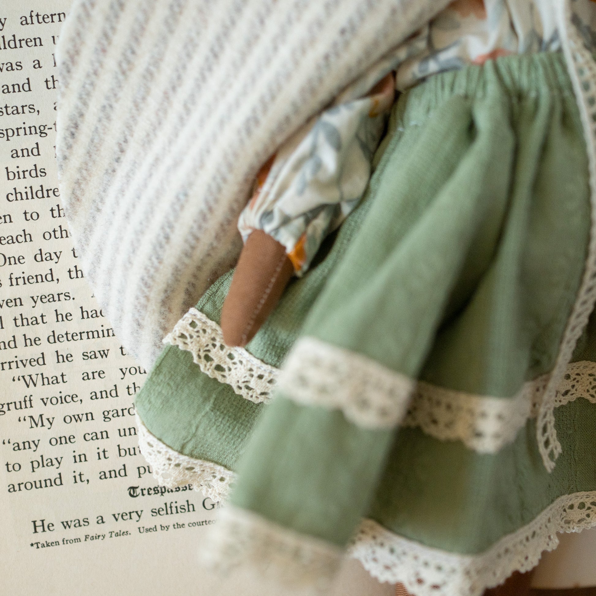 At 14" tall our Fairytale Girls are perfect for snuggling and dress up. These heirloom dolls come with sewn in lace underwear and detailed hand embroidered faces.