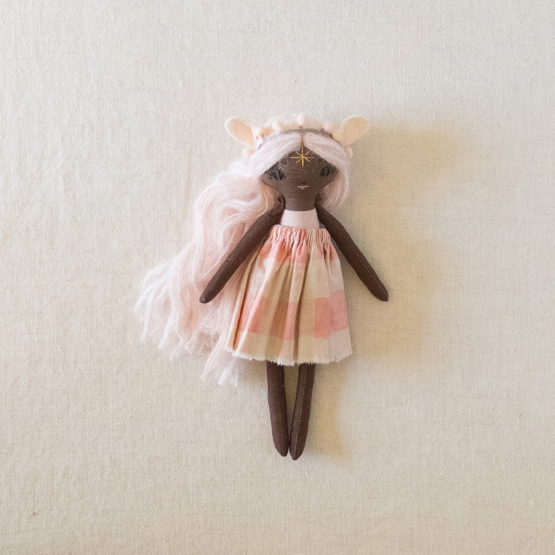 This unique doll is made up of cotton, wool/rayon felt, and stuffed with recycled pollyfill. The yarn hair is a combination of wool, mohair, and acrylic yarn. Each doll is lovingly hand stitched in Asheville, North Carolina.