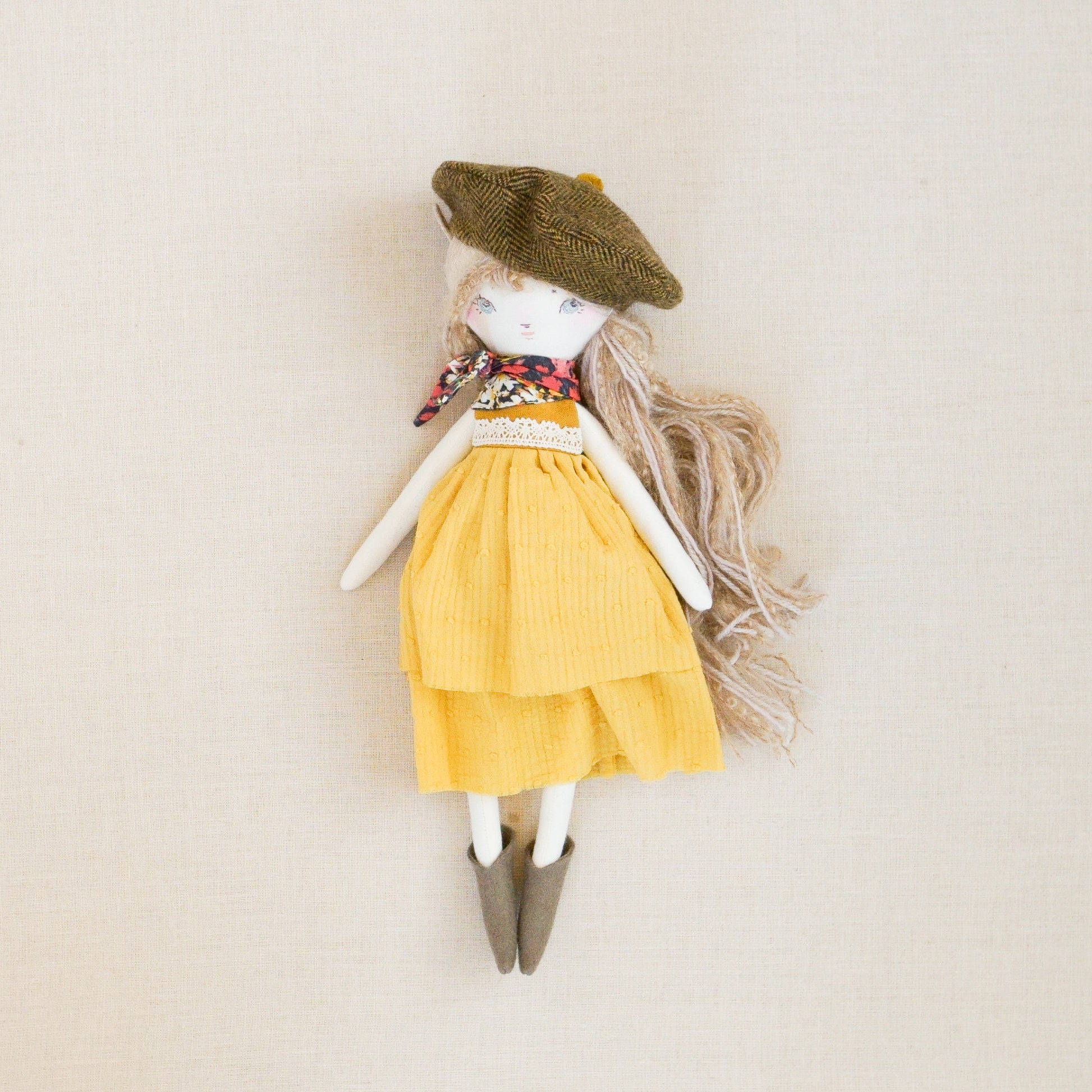 This doll is made up of cotton, wool/rayon felt, and stuffed with recycled pollyfill. The yarn hair is a combination of wool, mohair, and acrylic yarn. All our dolls have button-jointed arms. Each doll is lovingly hand-stitched in Asheville, North Carolina.