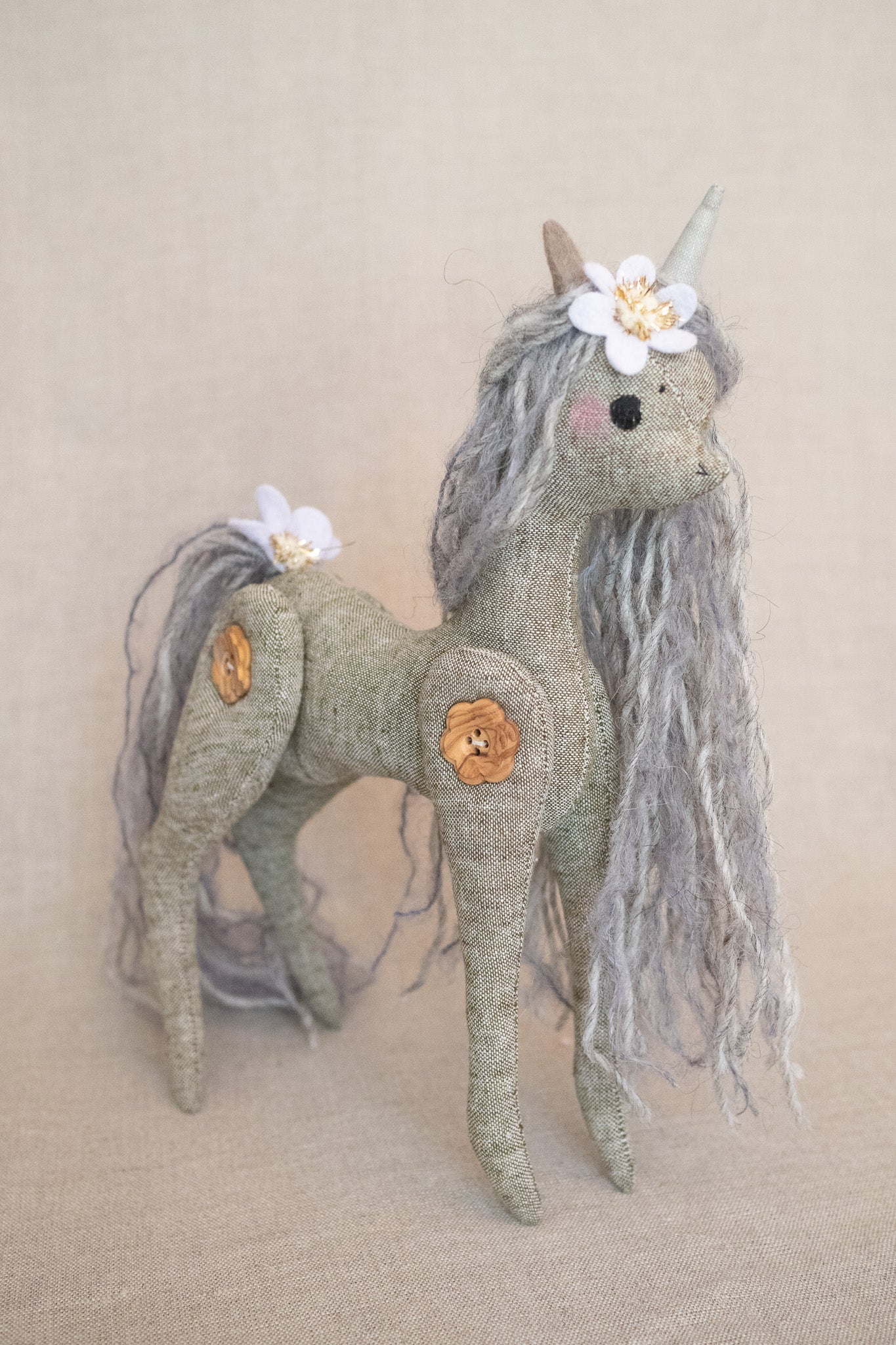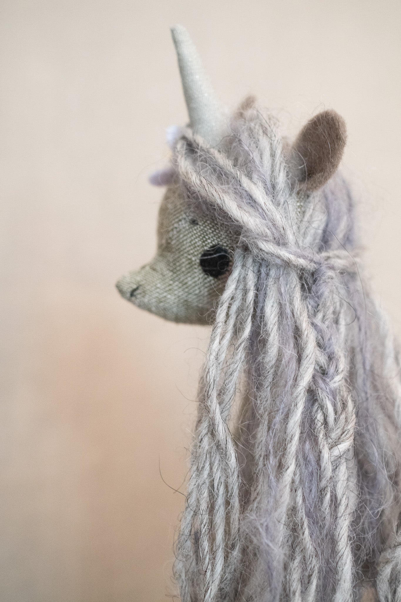 This little button jointed Unicorn is ever so sweet and magical! She is not meant as a toy as much as a beautiful display/decor item and would look so whimsical on top of a stack of pretty books or standing pretty on a shelf full of special things.