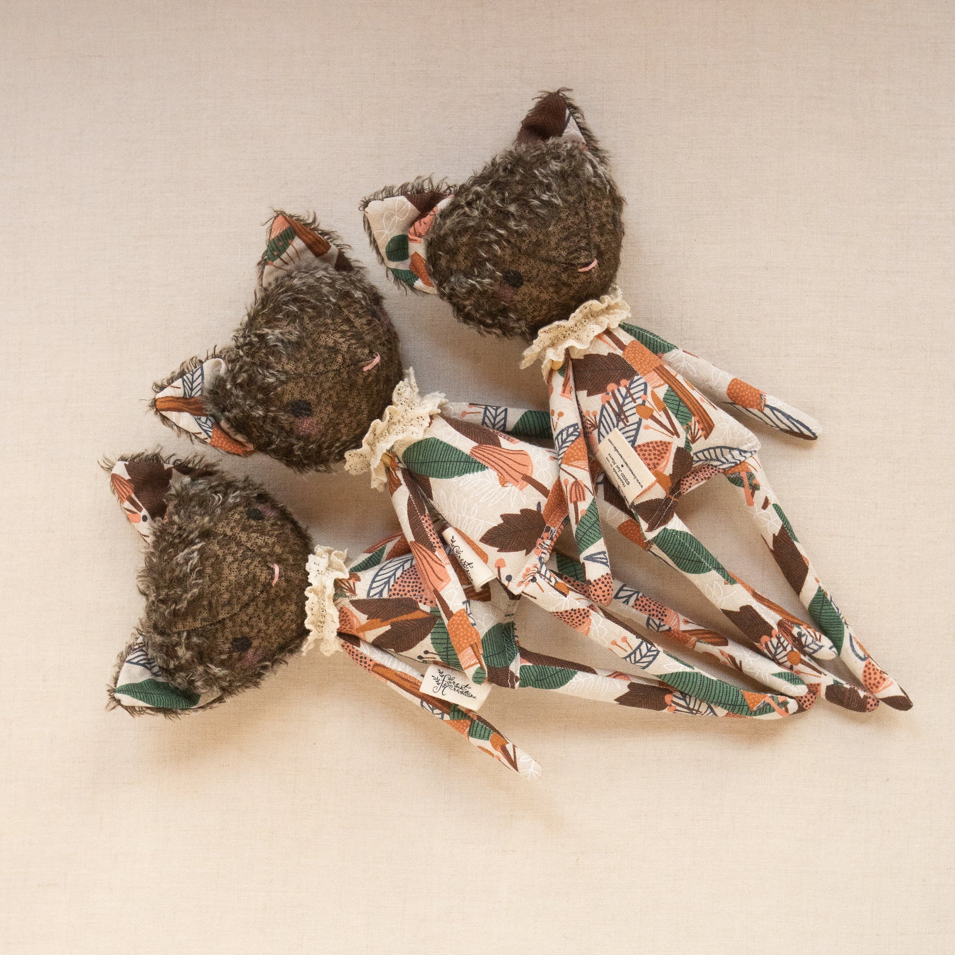 Our Forest Friends are made from linen and cotton/linen blends and these special foxes have a head and ears made from German mohair. They have button joined arms. Each doll is lovingly hand stitched in Asheville, North Carolina.