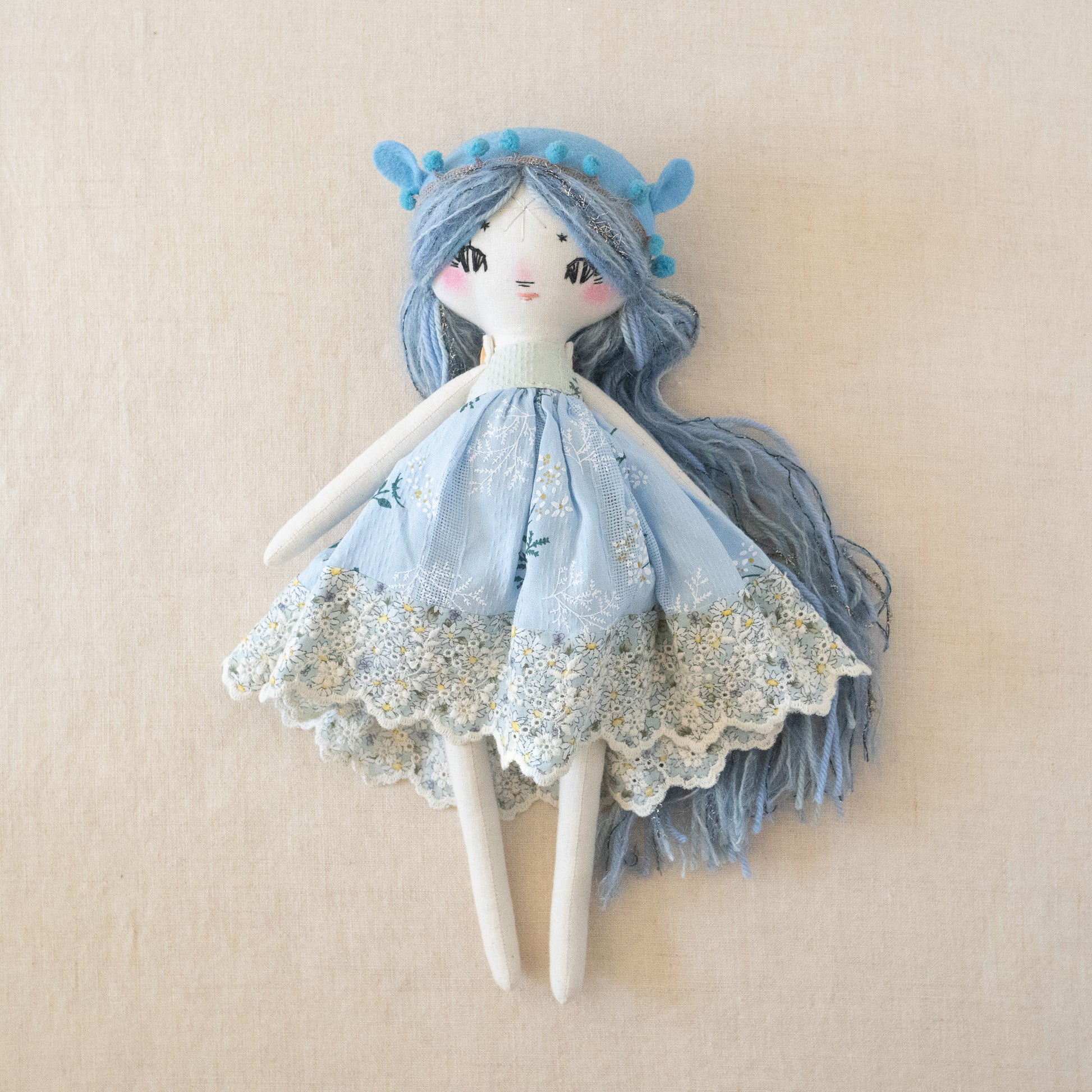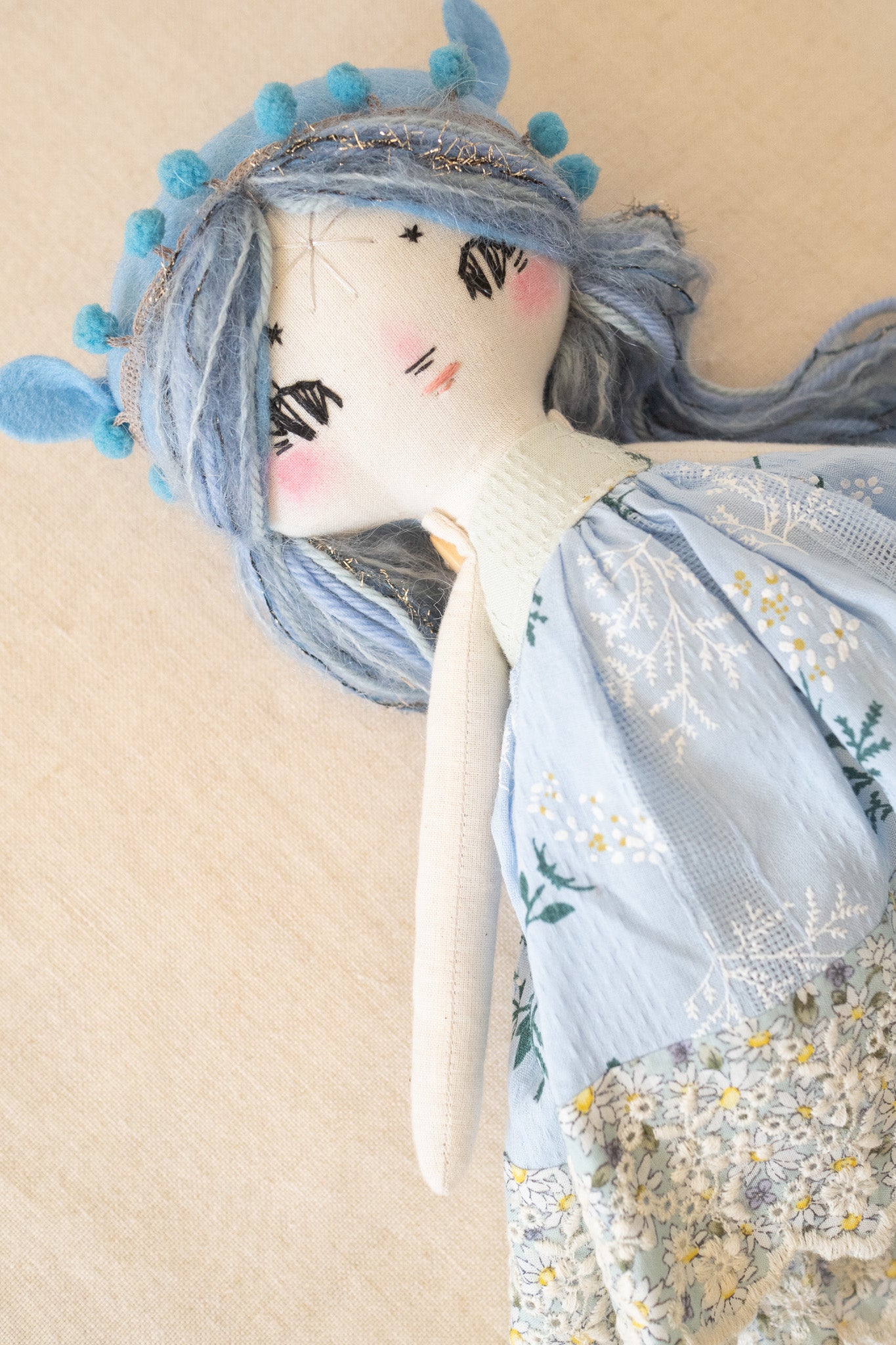This unique doll is made up of cotton, wool/rayon felt, and stuffed with recycled pollyfill. The yarn hair is a combination of wool, mohair, and acrylic yarn. All of our dolls have button-jointed arms. Each doll is lovingly hand stitched in Asheville, North Carolina.