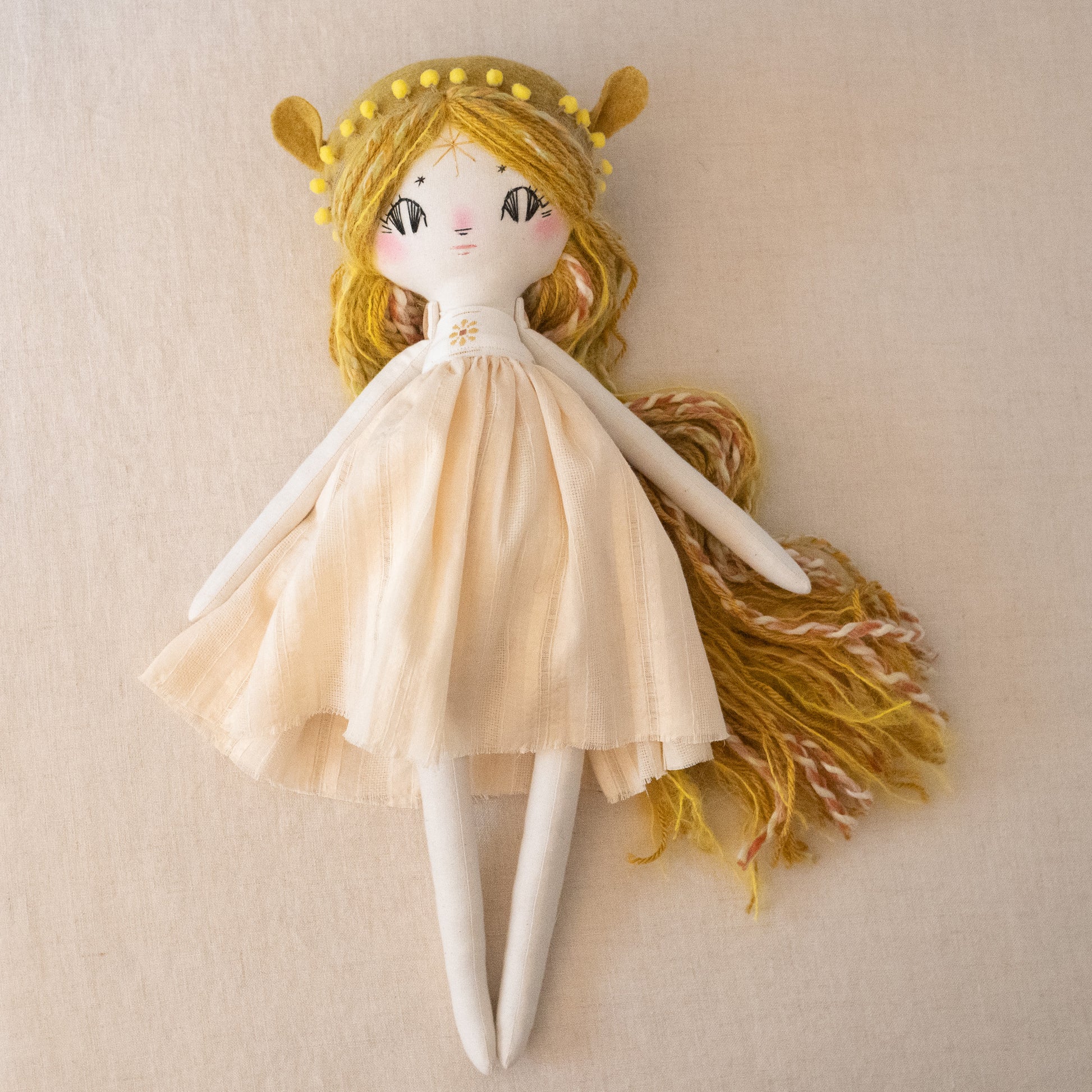 This unique doll is made up of cotton, wool/rayon felt, and stuffed with recycled pollyfill. The yarn hair is a combination of wool, mohair, and acrylic yarn. All of our dolls have button-jointed arms. Each doll is lovingly hand stitched in Asheville, North Carolina.