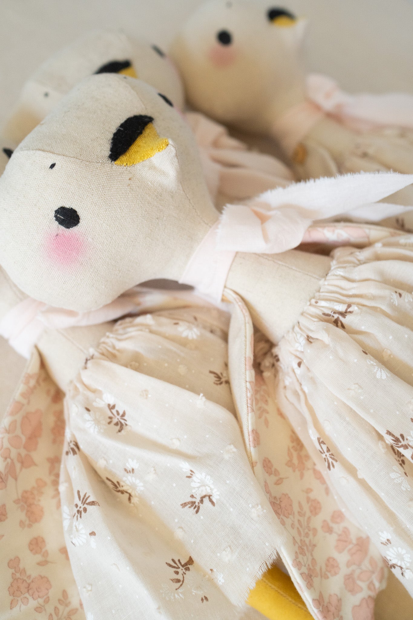 Our swans are made from a mix of linen, and cotton/linen blends and have button-joined arms/wings. Each doll is lovingly hand-stitched in Asheville, North Carolina.