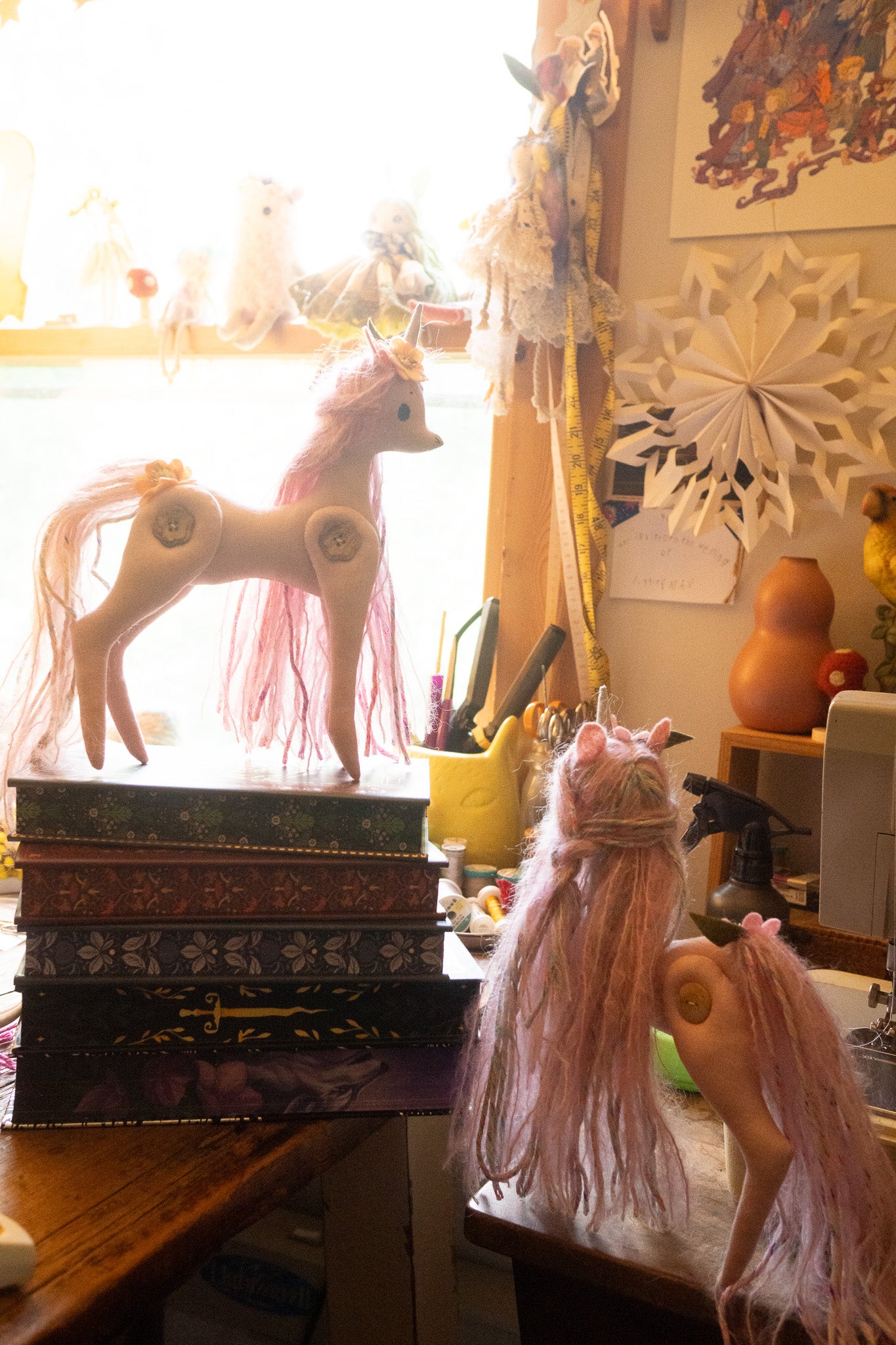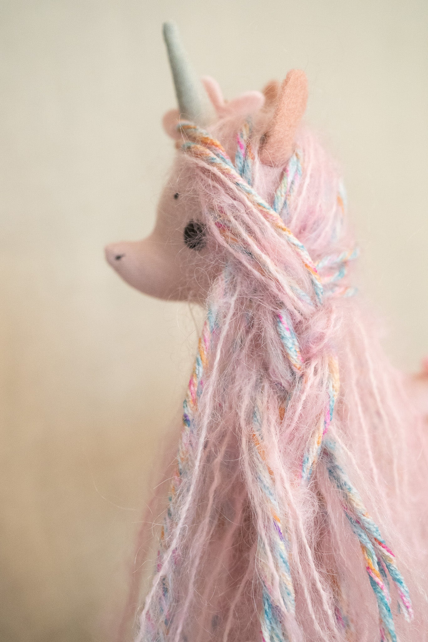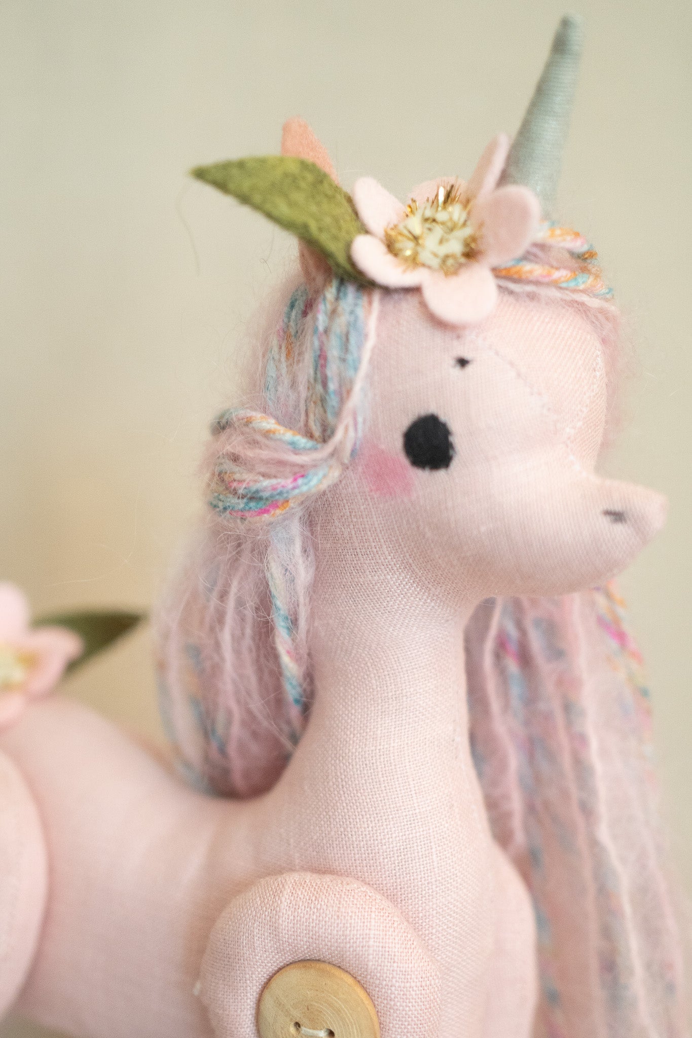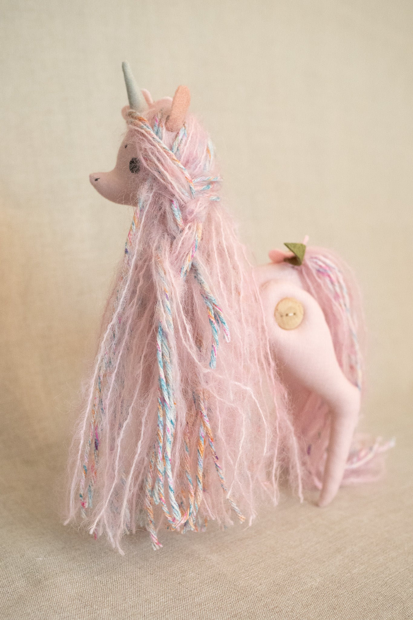 This little button jointed Unicorn is ever so sweet and magical! She is not meant as a toy as much as a beautiful display/decor item and would look so whimsical on top of a stack of pretty books or standing pretty on a shelf full of special things.