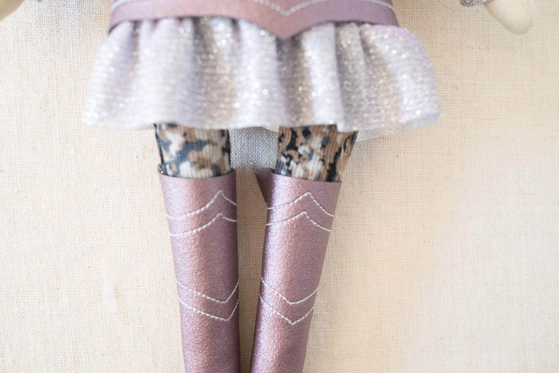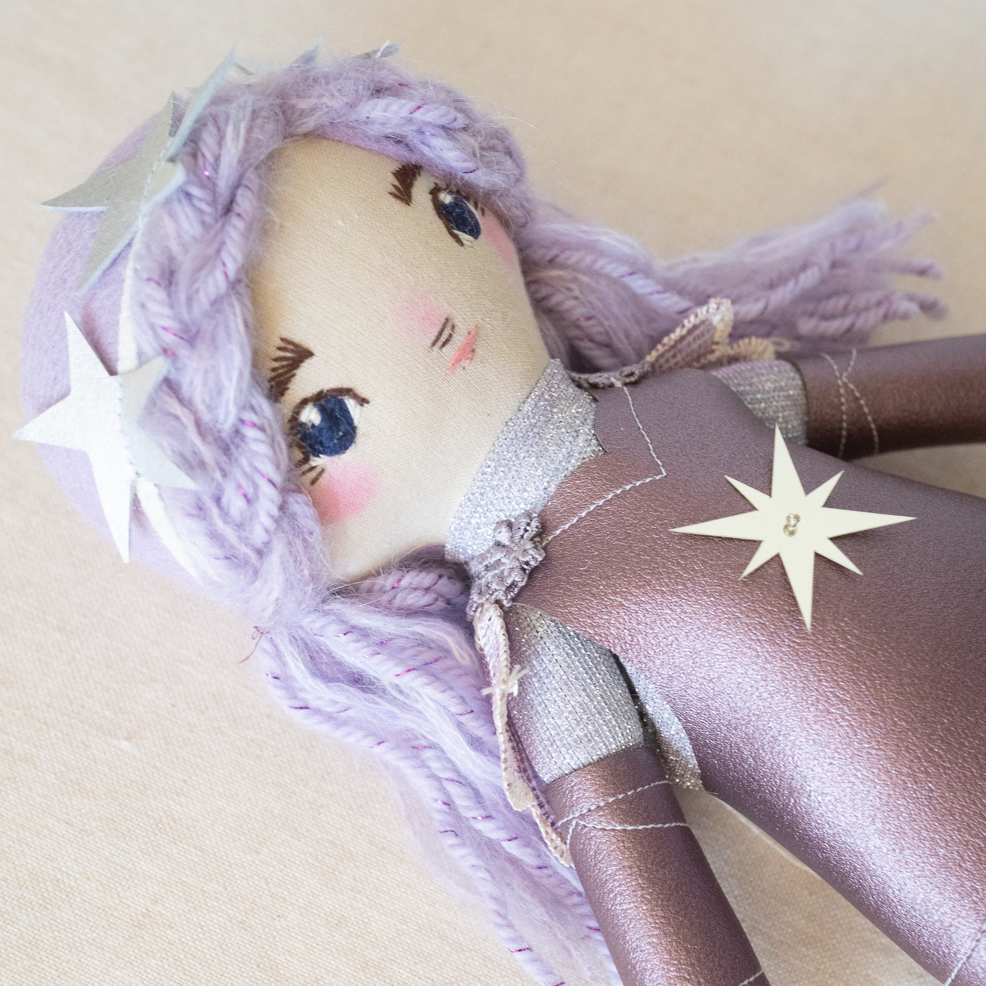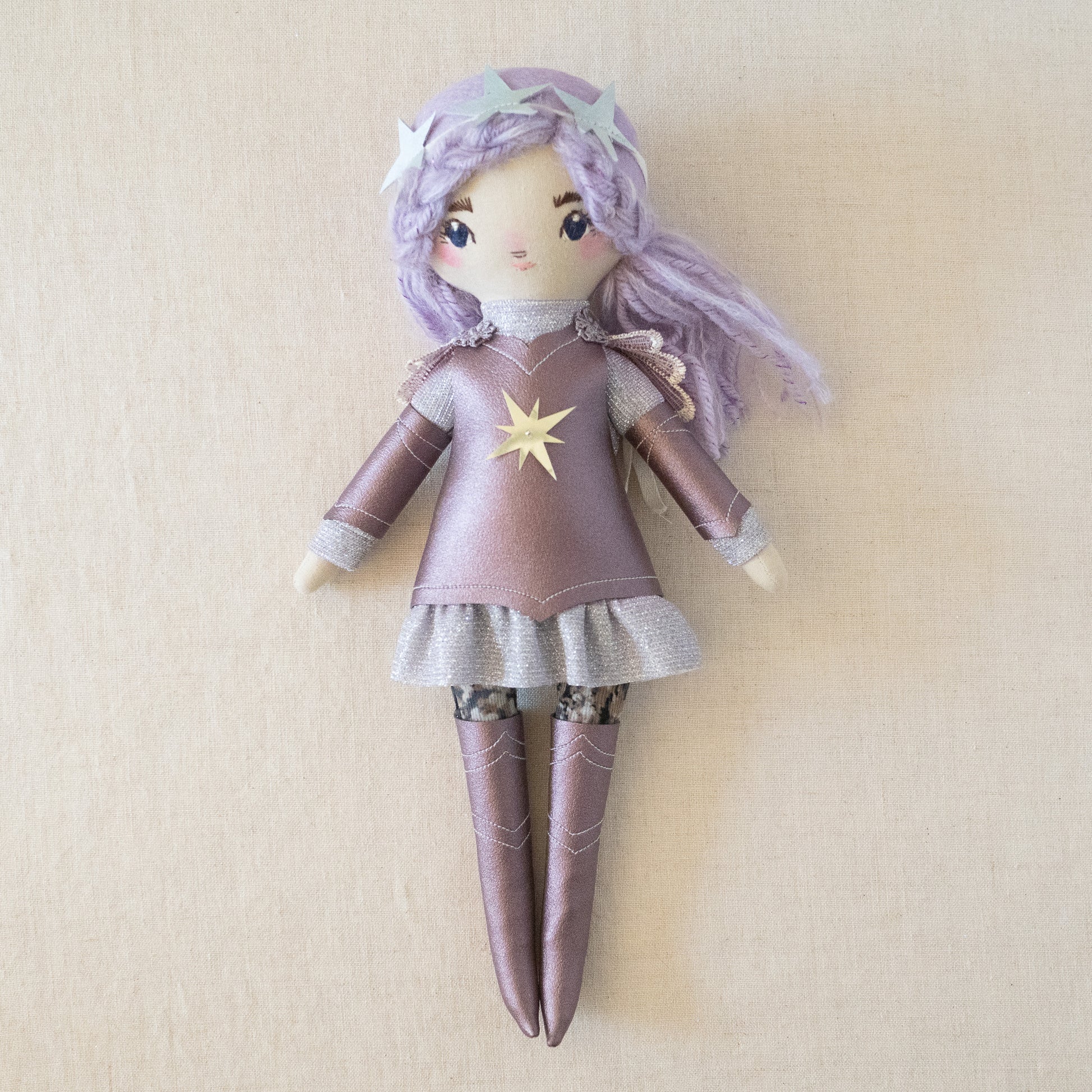 This unique doll is made up of cotton, wool/rayon felt, and stuffed with recycled pollyfill. The yarn hair is a combination of wool, mohair, and acrylic yarn. All of our dolls have button-jointed arms. Each doll is lovingly hand stitched in Asheville, North Carolina.