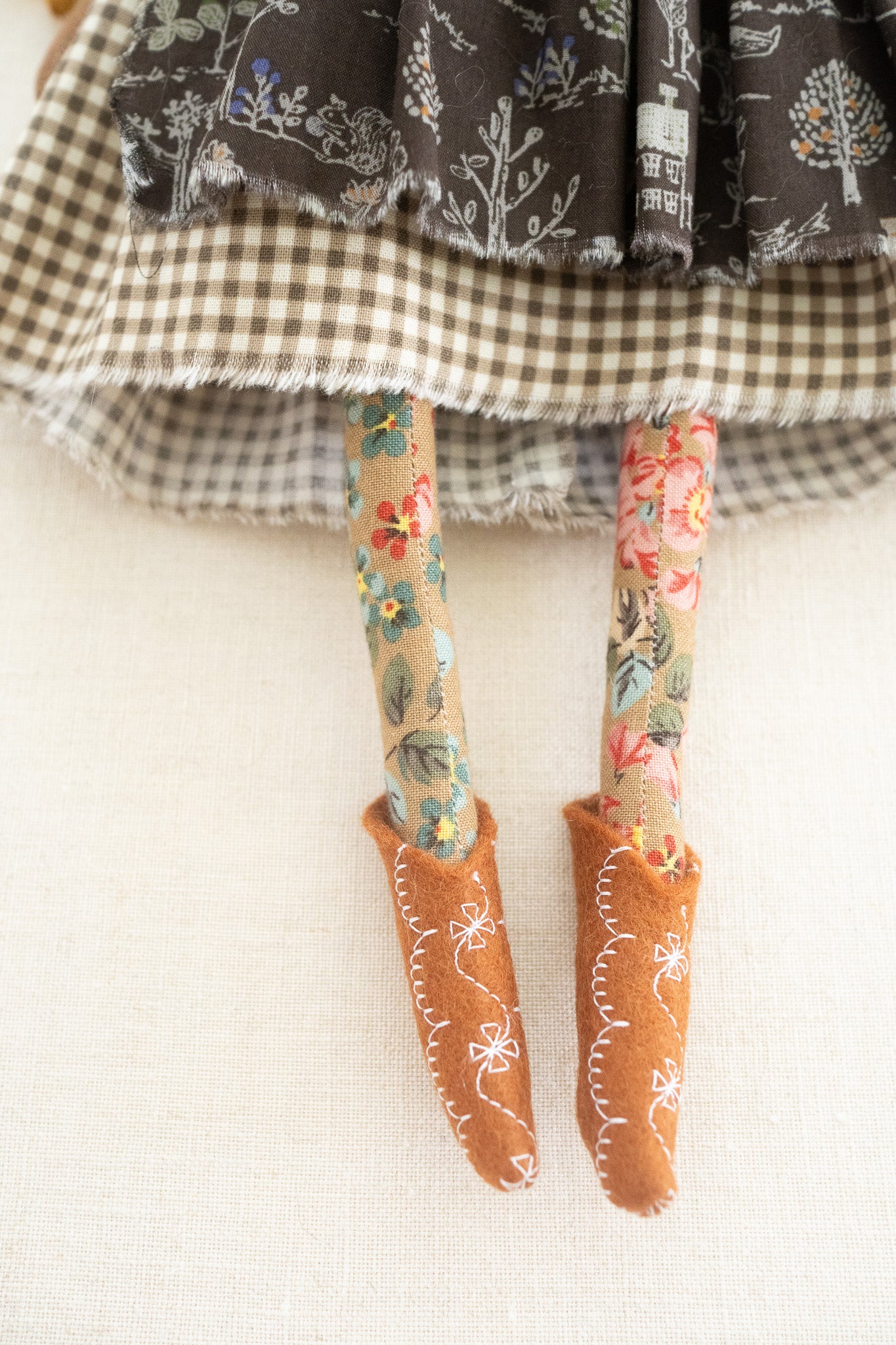This doll is made up of cotton, wool/rayon felt, and stuffed with recycled pollyfill. The yarn hair is a combination of wool, mohair, and acrylic yarn. All our dolls have button jointed arms. Each doll is lovingly hand stitched in Asheville, North Carolina.