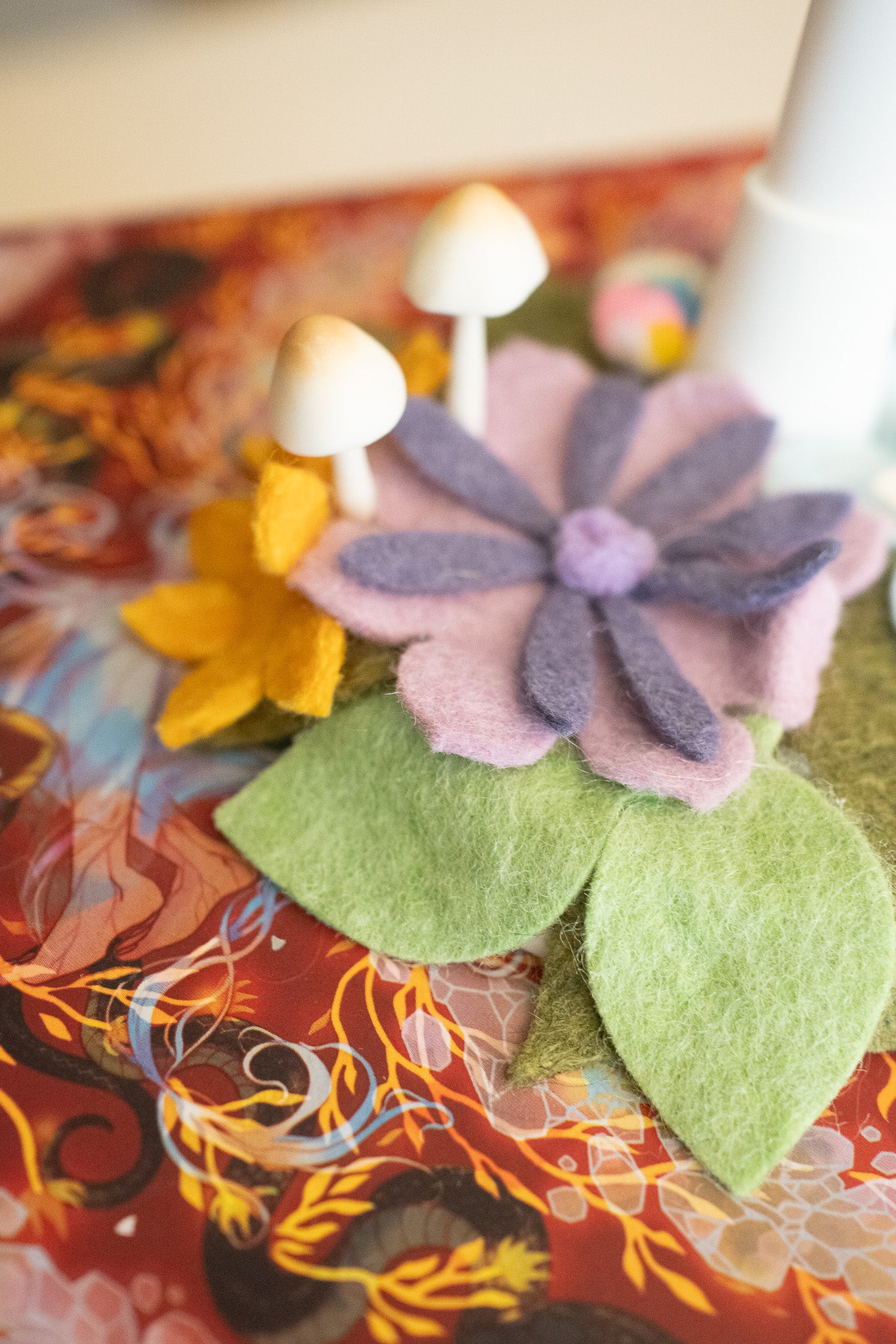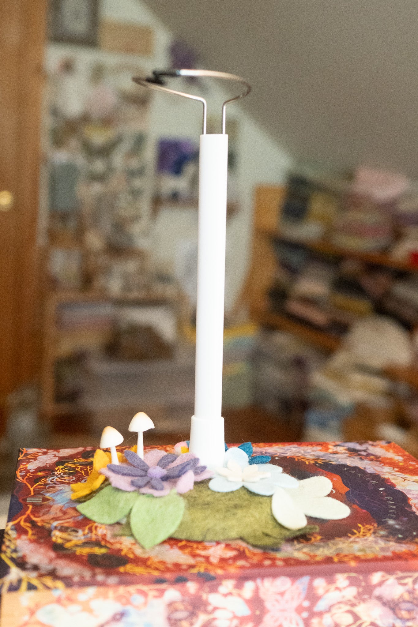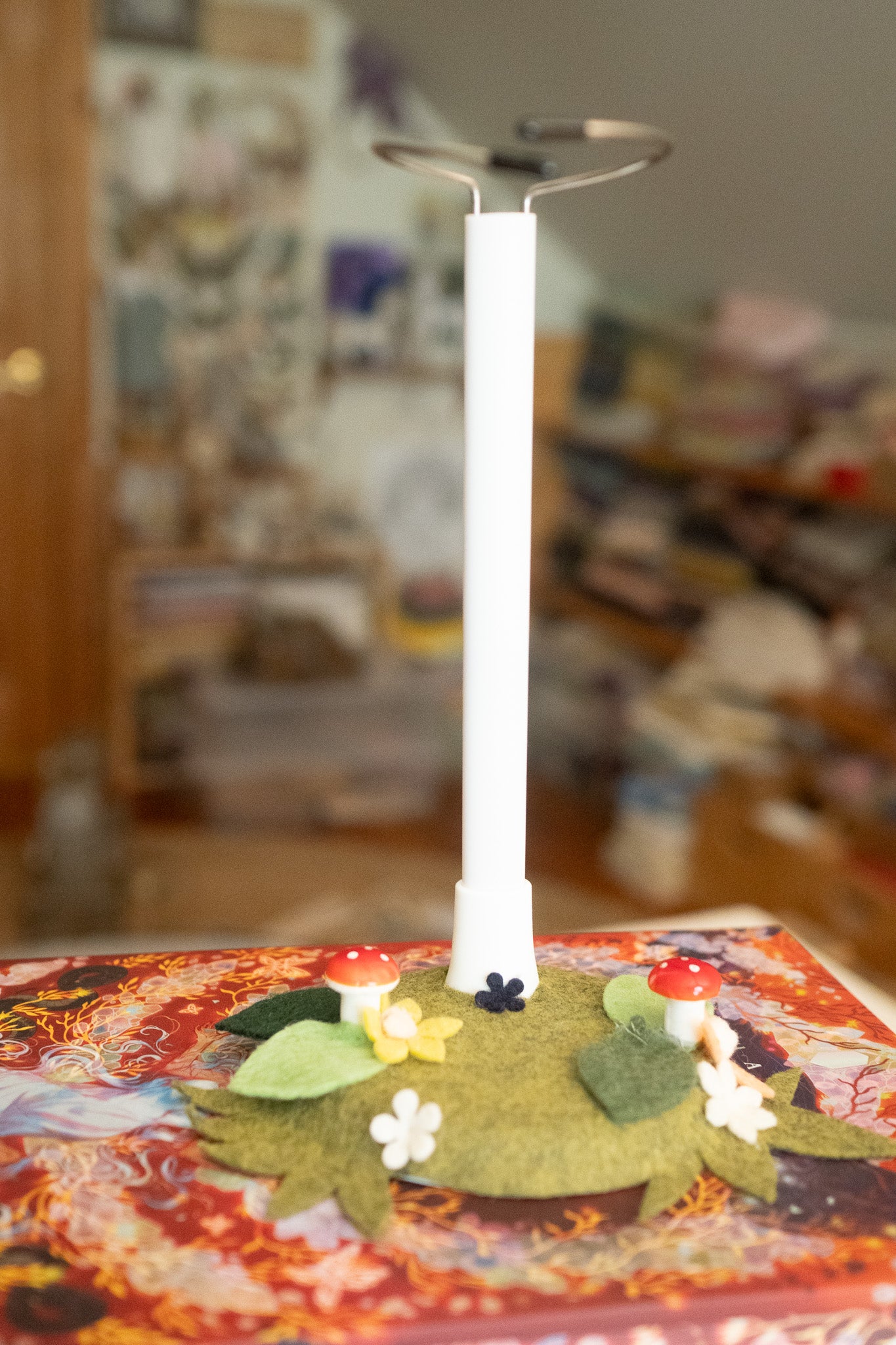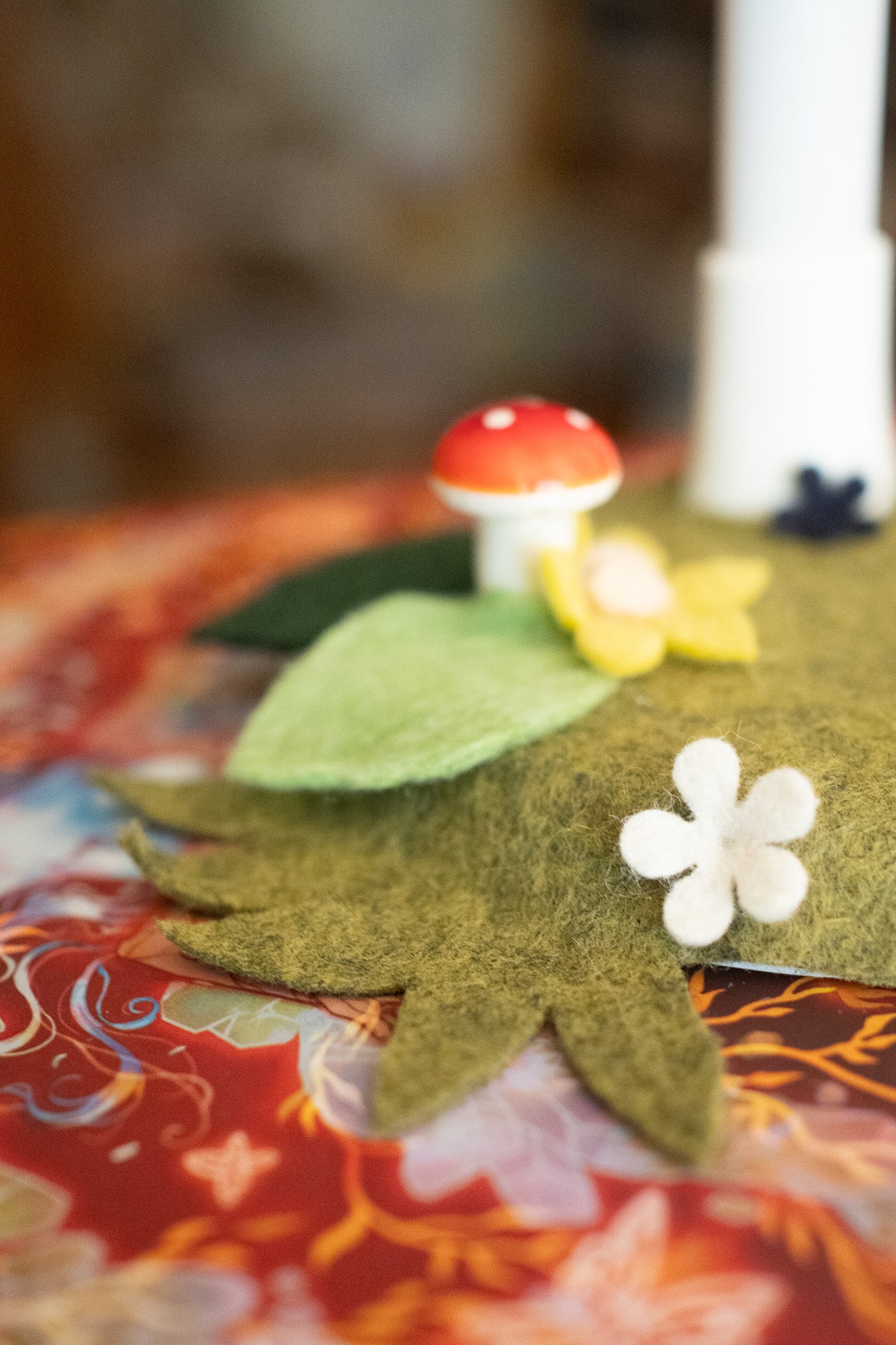One of a kind felt flower and mushroom doll stands for your 14" dolls. Adjustable but fits out regular pixies and forest friends best.