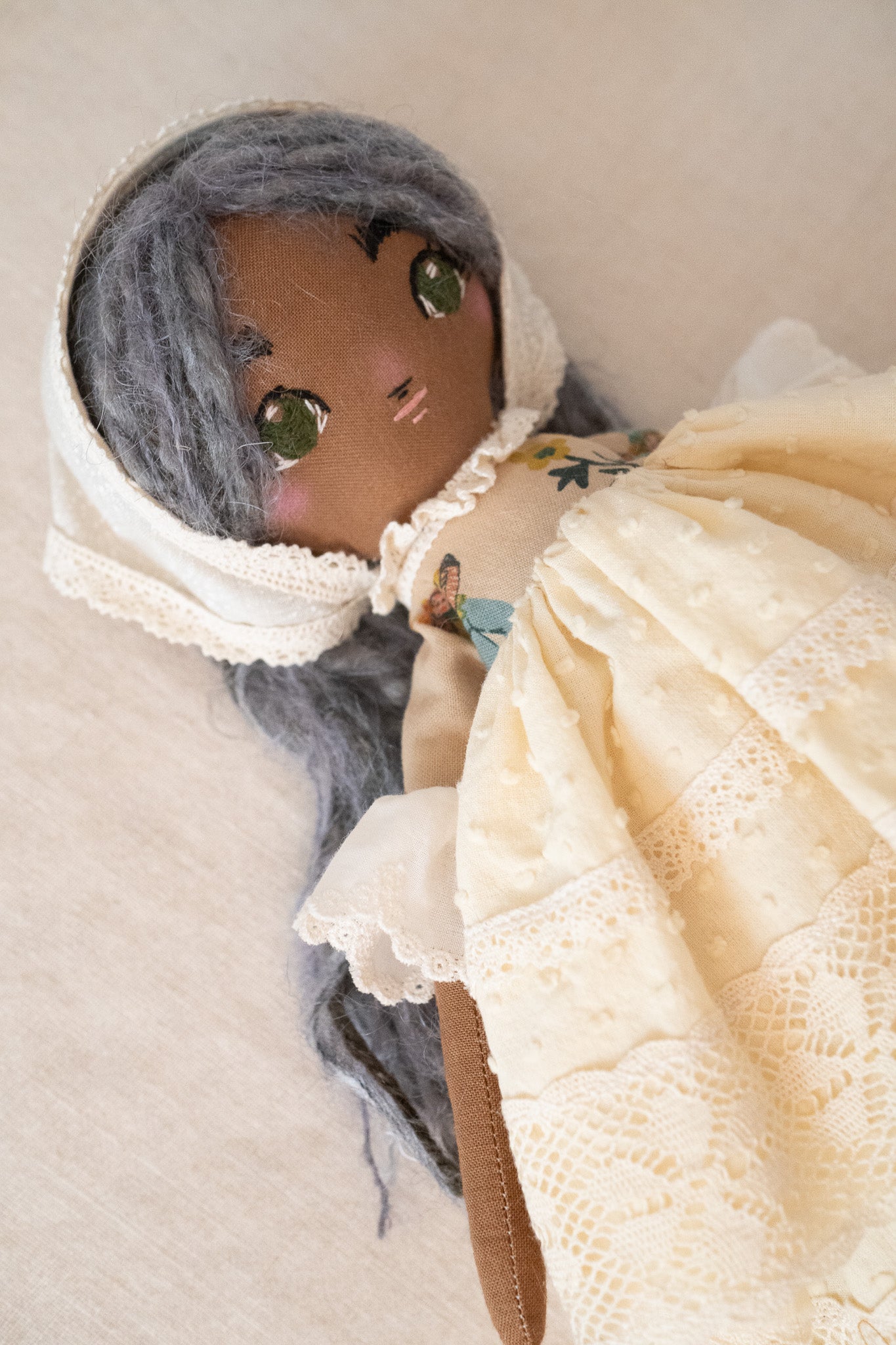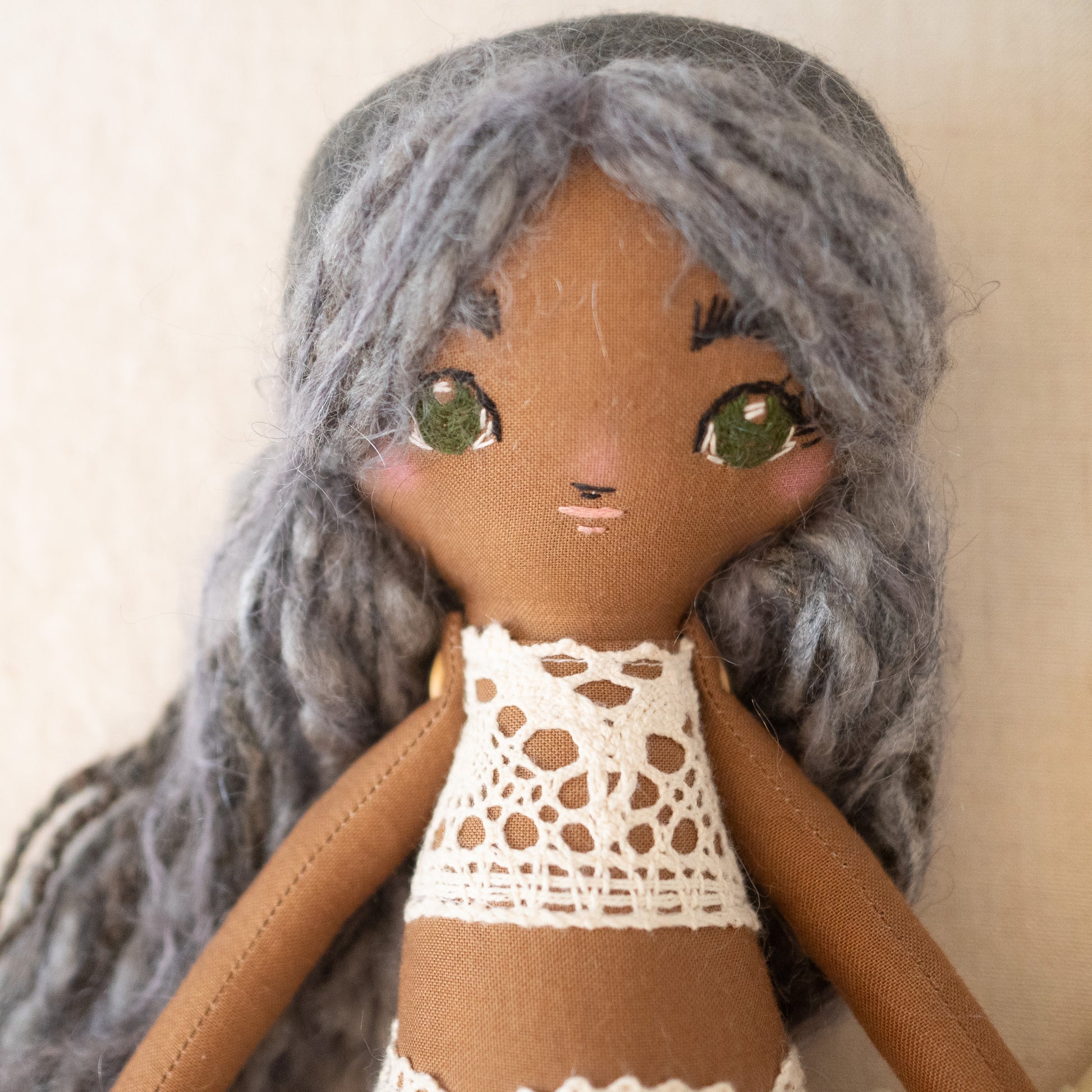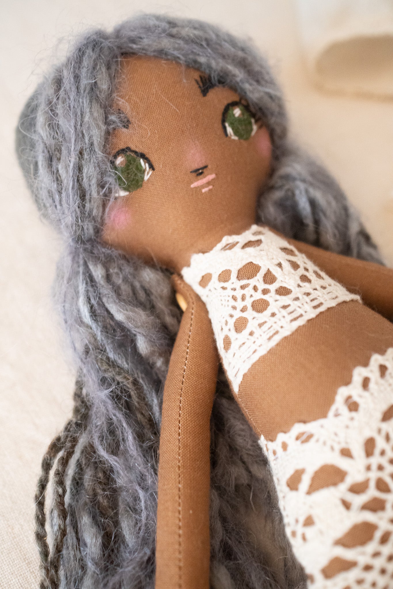 This unique doll is made up of cotton, wool/rayon felt, and stuffed with recycled pollyfill. The yarn hair is a combination of wool, mohair, and acrylic yarn. All of our dolls have button-jointed arms. Each doll is lovingly hand stitched in Asheville, North Carolina.