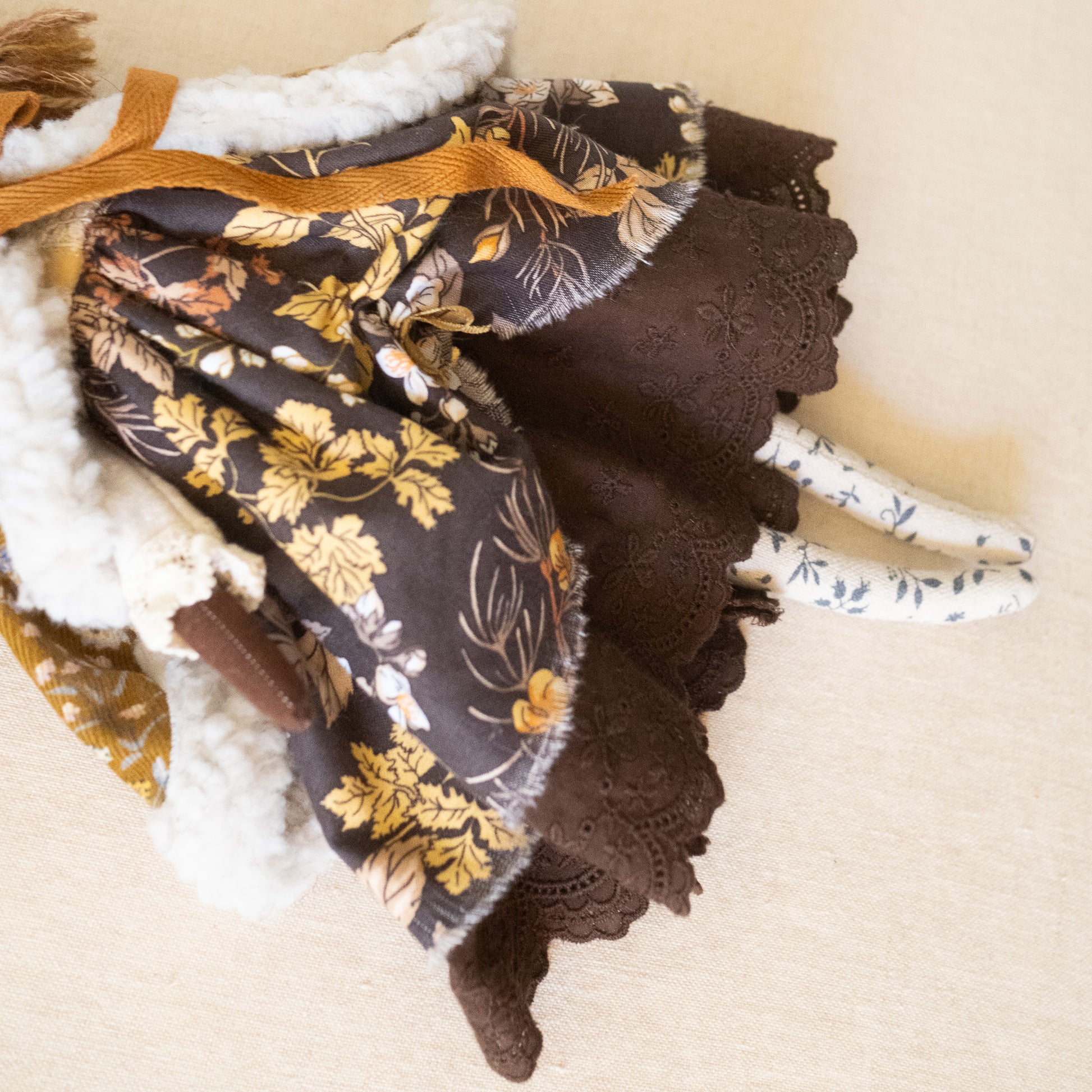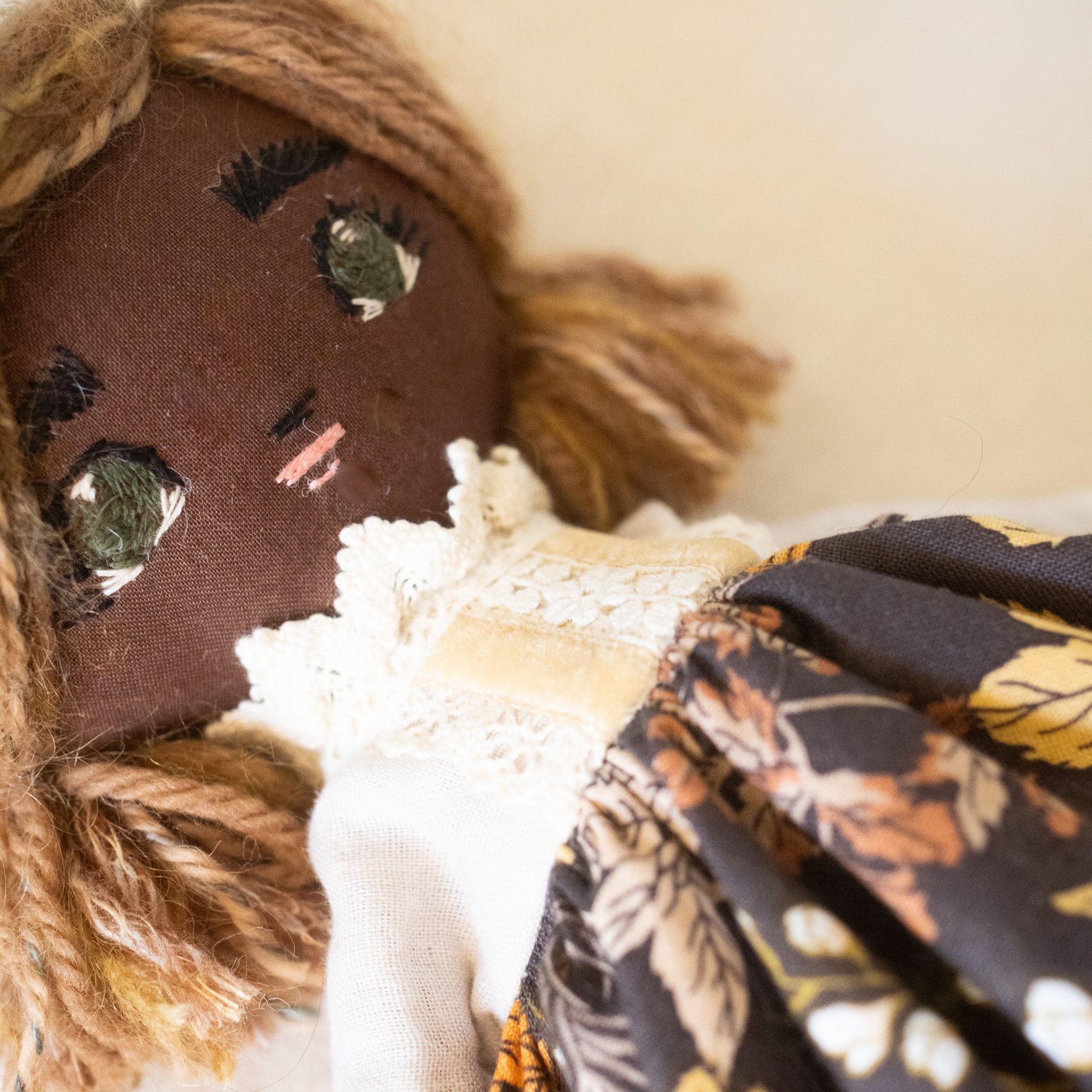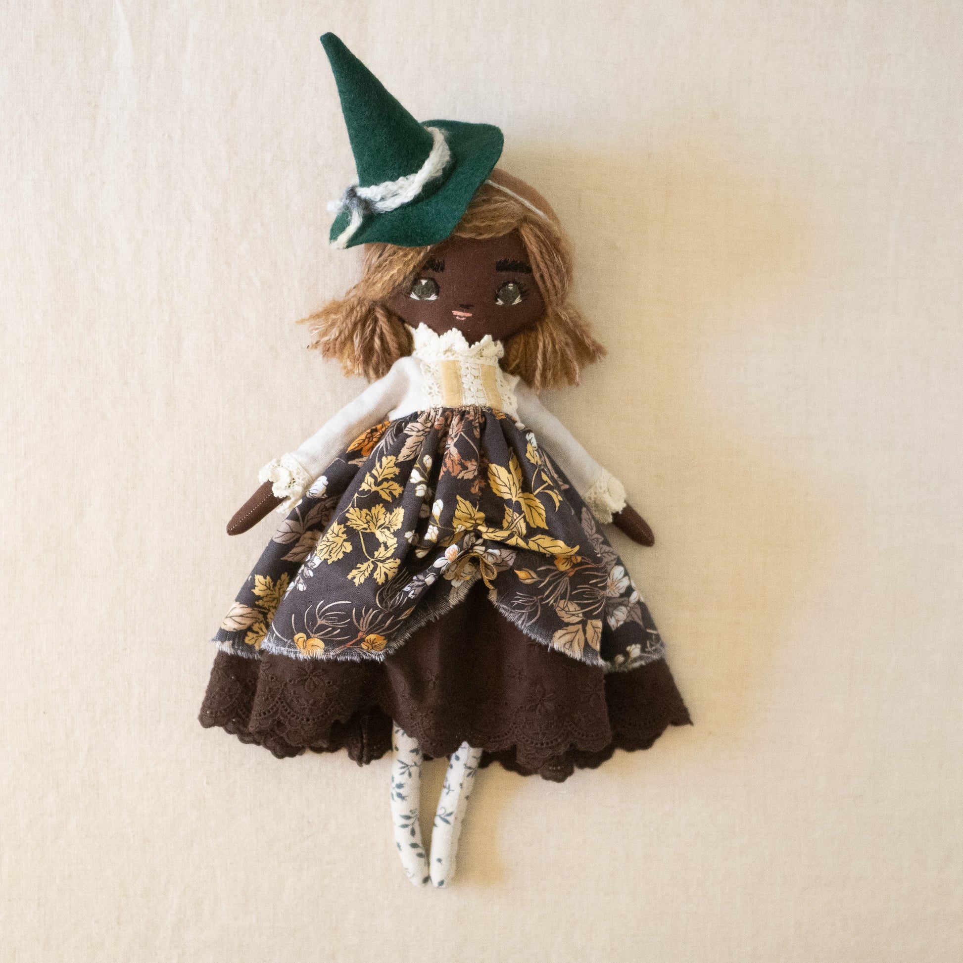 This unique doll is made up of cotton, wool/rayon felt, and stuffed with recycled pollyfill. The yarn hair is a combination of wool, mohair, and acrylic yarn. All of our dolls have button-jointed arms. Each doll is lovingly hand stitched in Asheville, North Carolina.