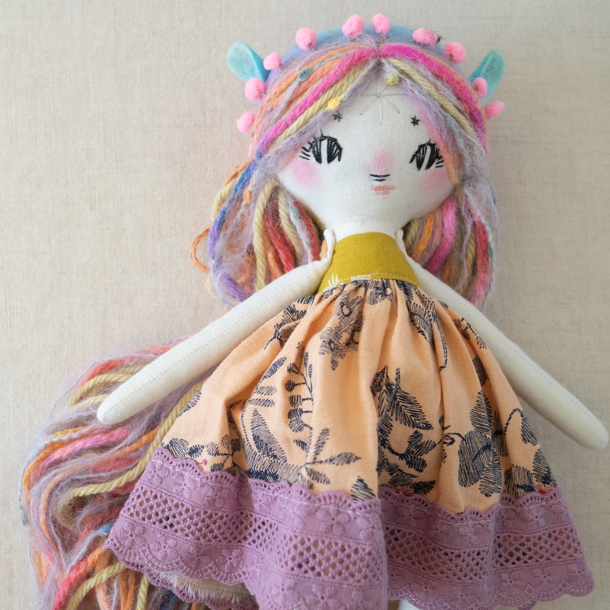 This unique doll is made up of cotton, wool/rayon felt, and stuffed with recycled pollyfill. The yarn hair is a combination of wool, mohair, and acrylic yarn. All of our dolls have button-jointed arms. Each doll is lovingly hand stitched in Asheville, North Carolina.