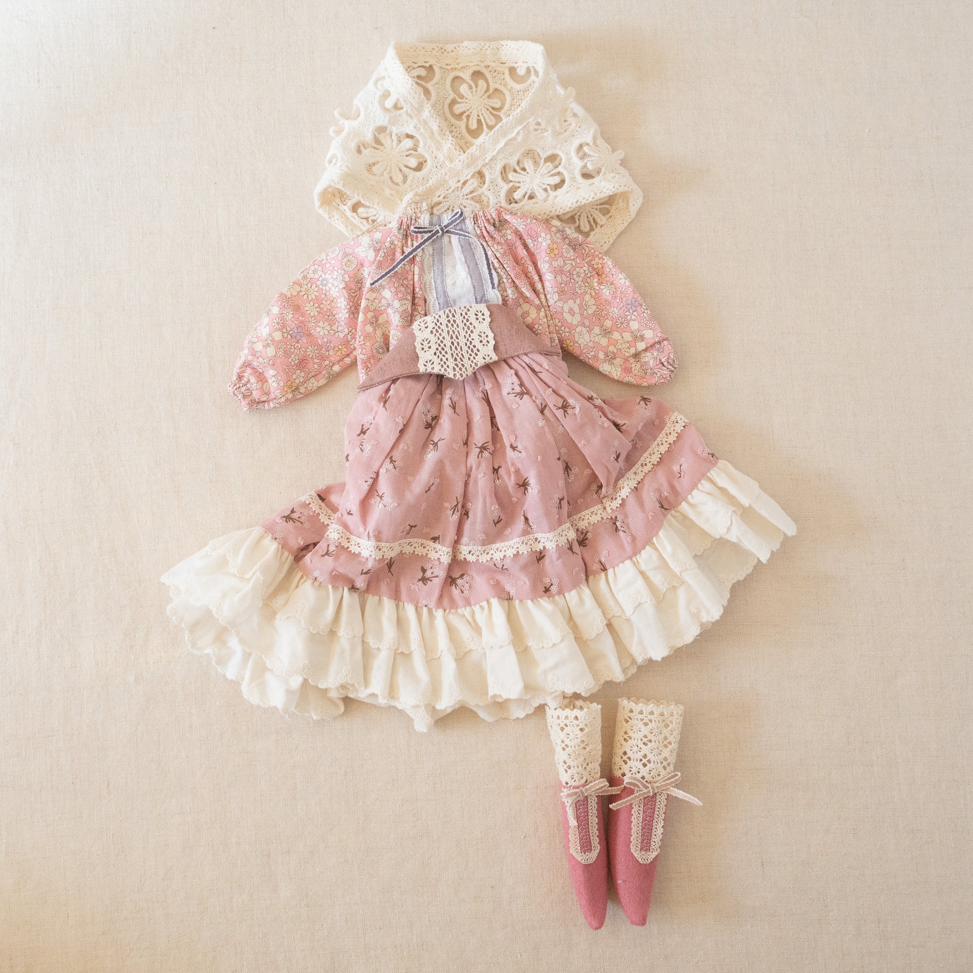 A lovely little outfit for our largest 20" dolls with a detailed blouse, ruffle trimmed skirt, lace trimmed apron, head scarf and lace up boots.