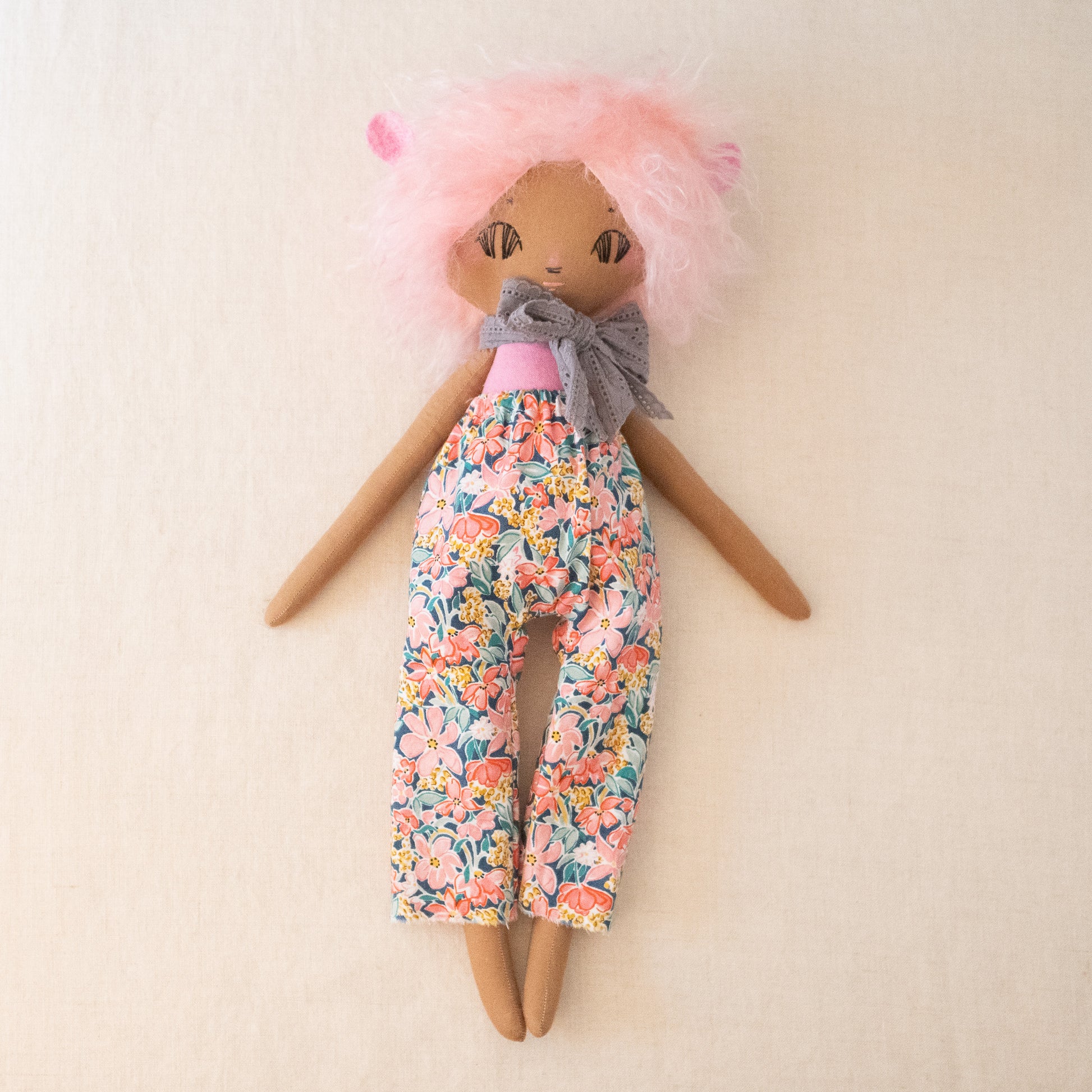 This unique doll is made up of cotton, wool/rayon felt, and stuffed with recycled pollyfill. The hair is german mohair fabric and his body is a hand dyed linen. All of our dolls have button-jointed arms. Each doll is lovingly hand stitched in Asheville, North Carolina.