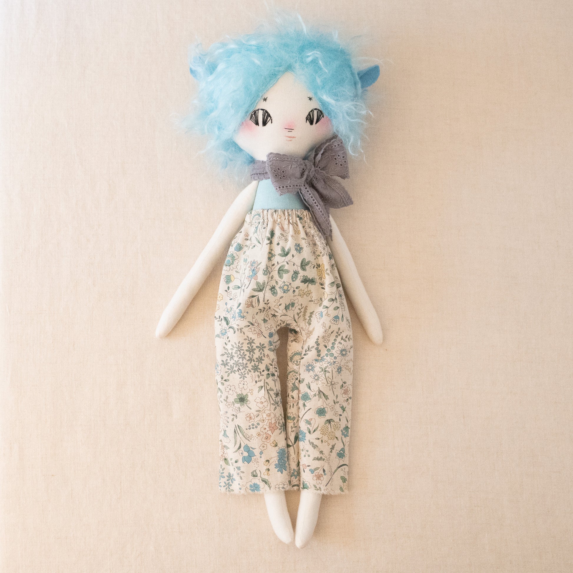 This unique doll is made up of cotton, wool/rayon felt, and stuffed with recycled pollyfill. The hair is german mohair fabric and his body is a hand dyed linen. All of our dolls have button-jointed arms. Each doll is lovingly hand stitched in Asheville, North Carolina.