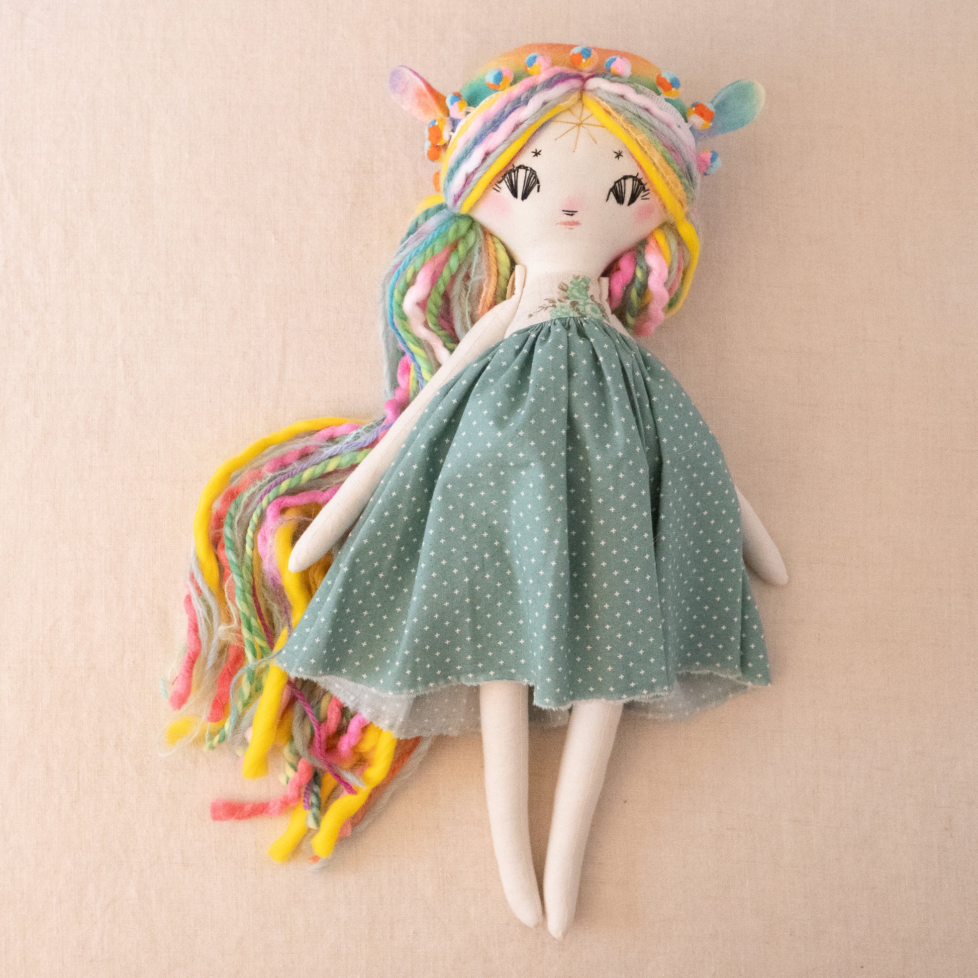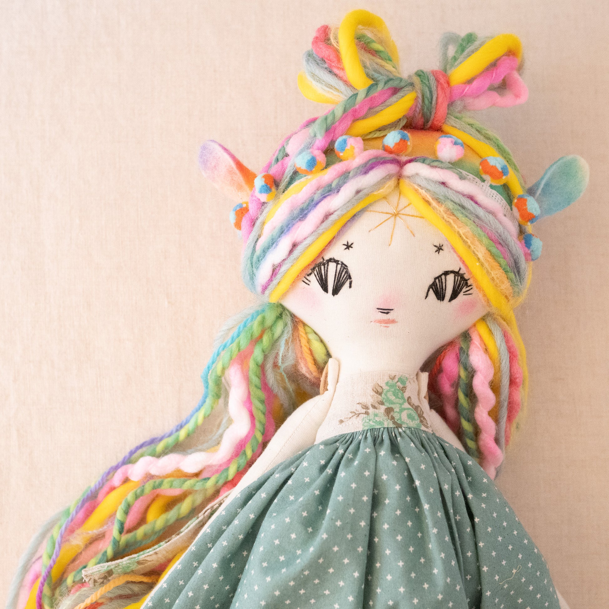 This unique doll is made up of cotton, wool/rayon felt, and stuffed with recycled pollyfill. The yarn hair is a combination of wool, mohair, and acrylic yarn. All of our dolls have button-jointed arms. Each doll is lovingly hand stitched in Asheville, North Carolina.
